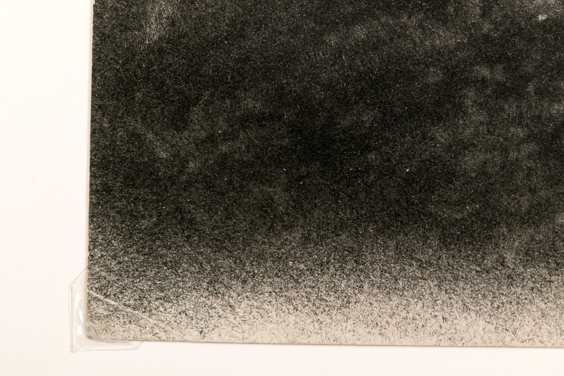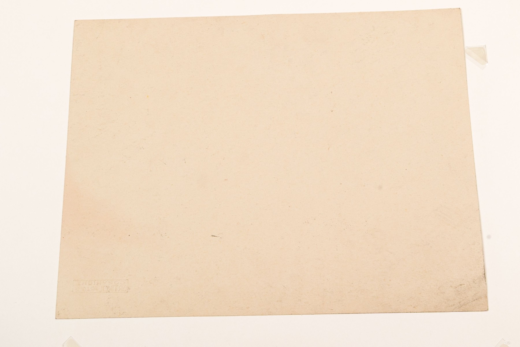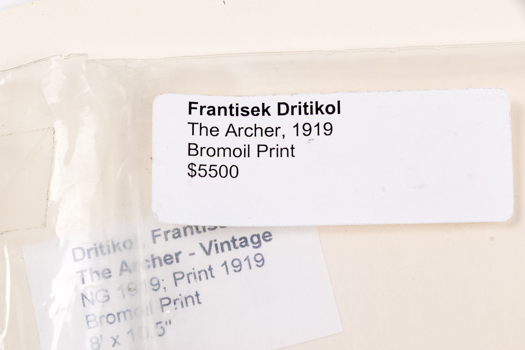 Frantisek Drtikol (Czech, 1883-1961) "The Archer (1919)" bromoil print depicting a woman with dark hair wearing a headband and white dress seated in a grassy field in profile, pulling a bow and arrow taught with a focused expression. Unframed.