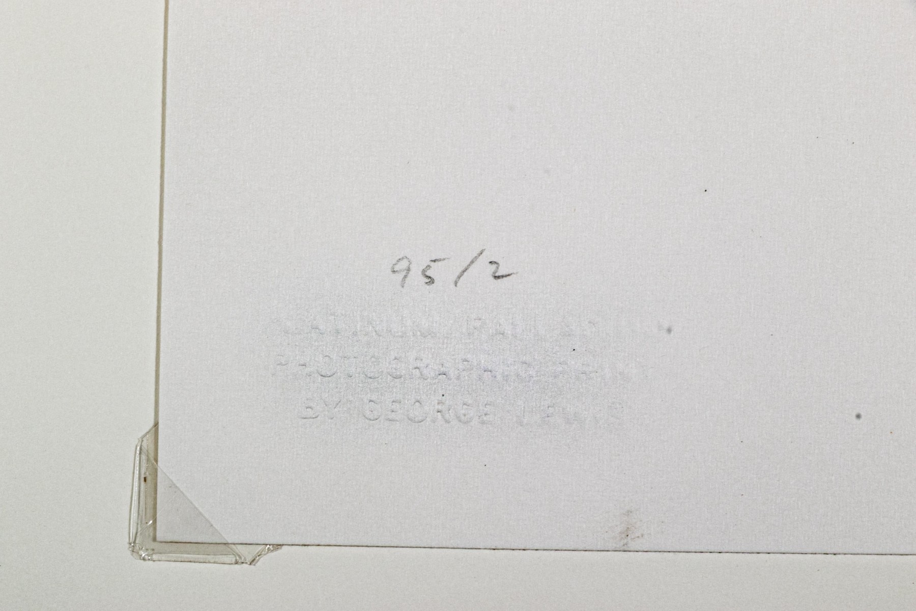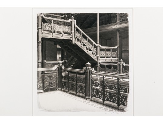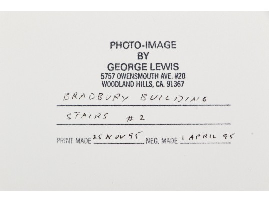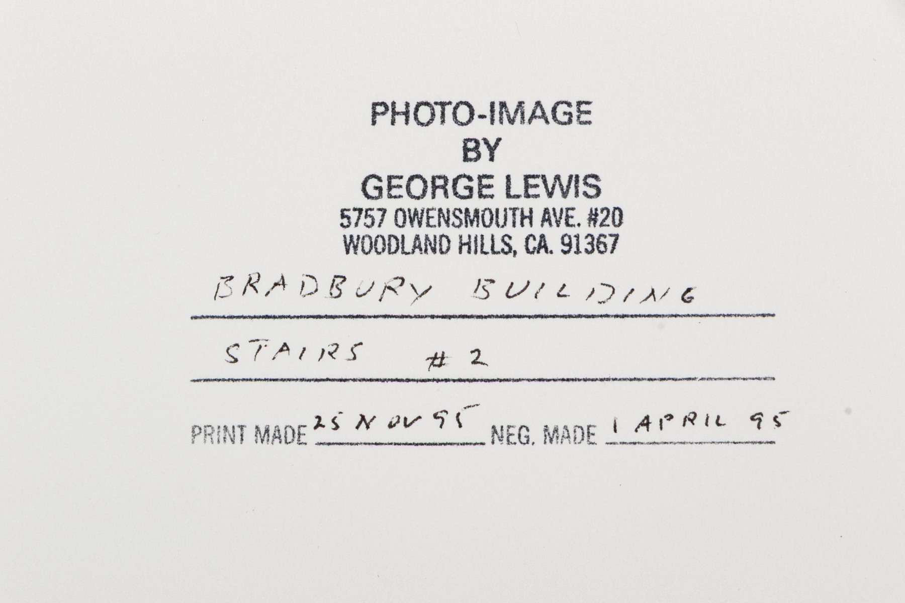 George Lewis (American [CA], 20th C.) "Bradbury Building Stairs" platinum palladium photographic print depicting impressive stair rails and balcony fencing with ornate openwork. The staircases wind around with an Escher-like quality. Signed, numbered #2, labeled with the print being made '95 and the negative '95; with an embossed label at the lower corner and pencil labeled 95/2. In a mount wrapped in plastic, unframed.