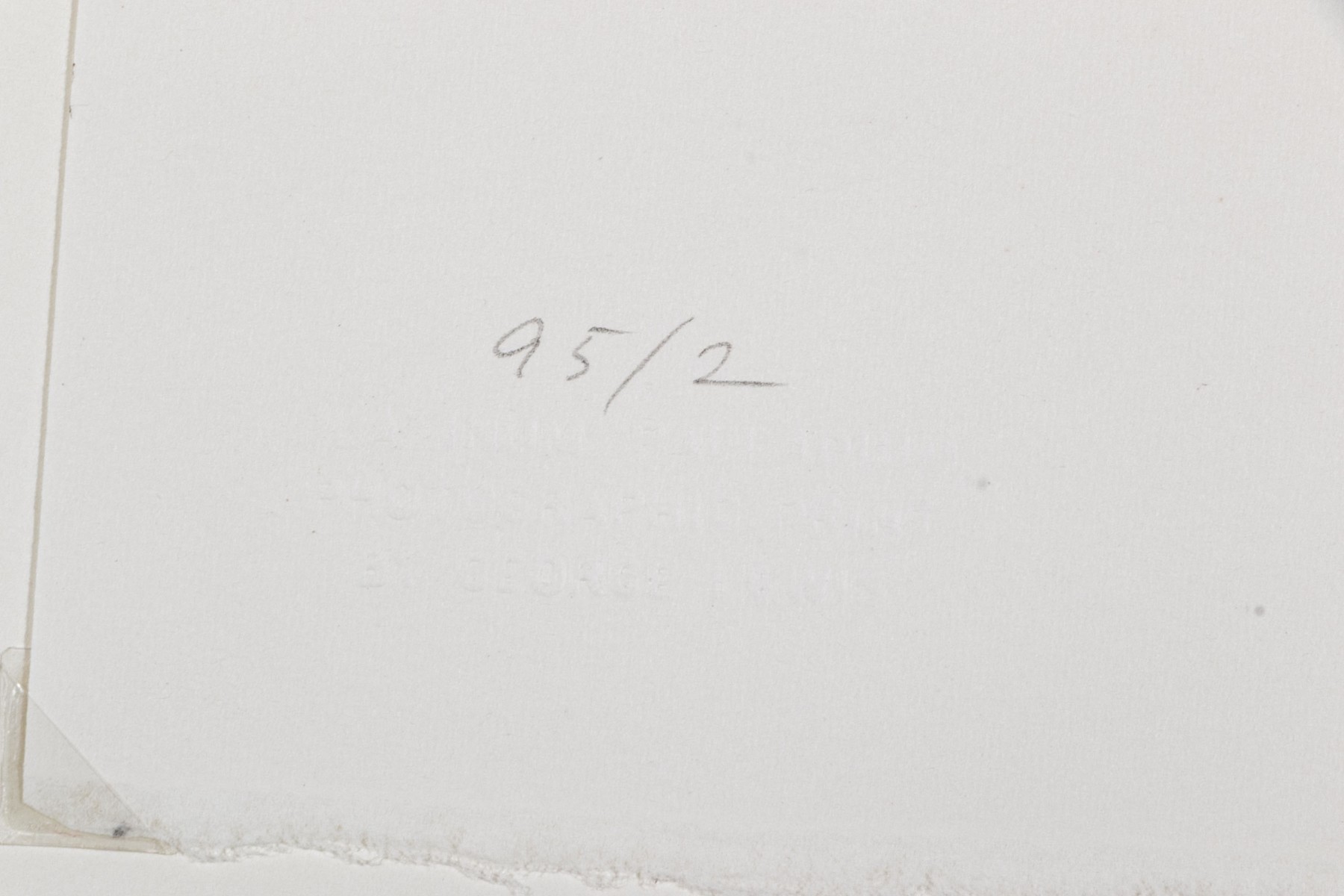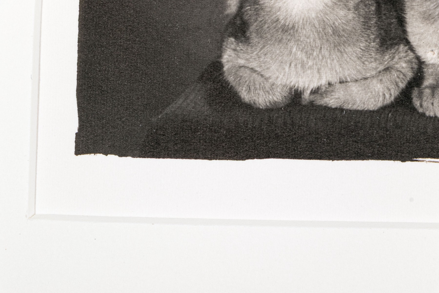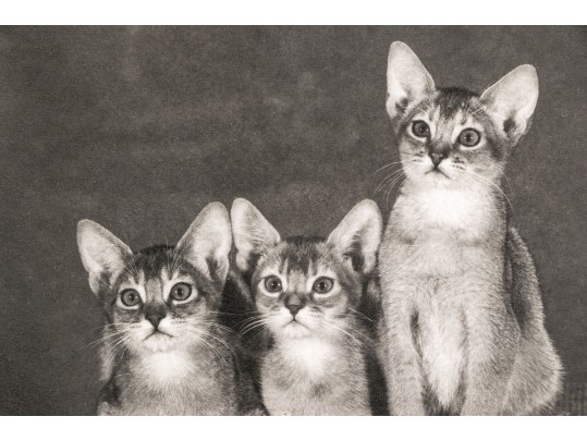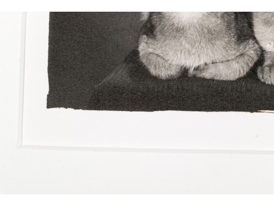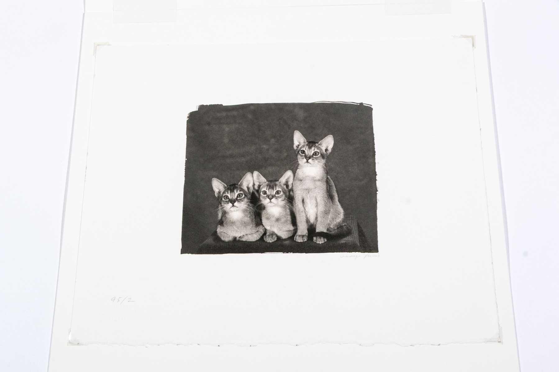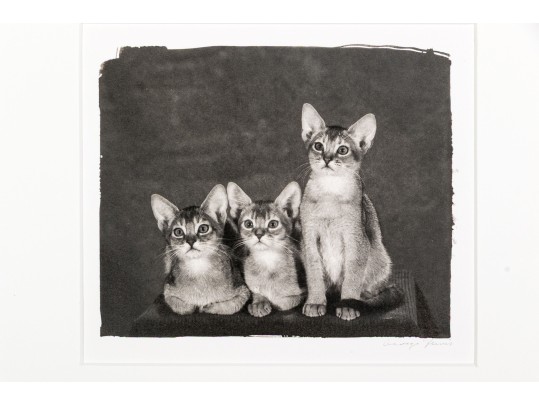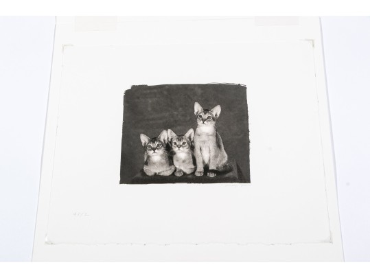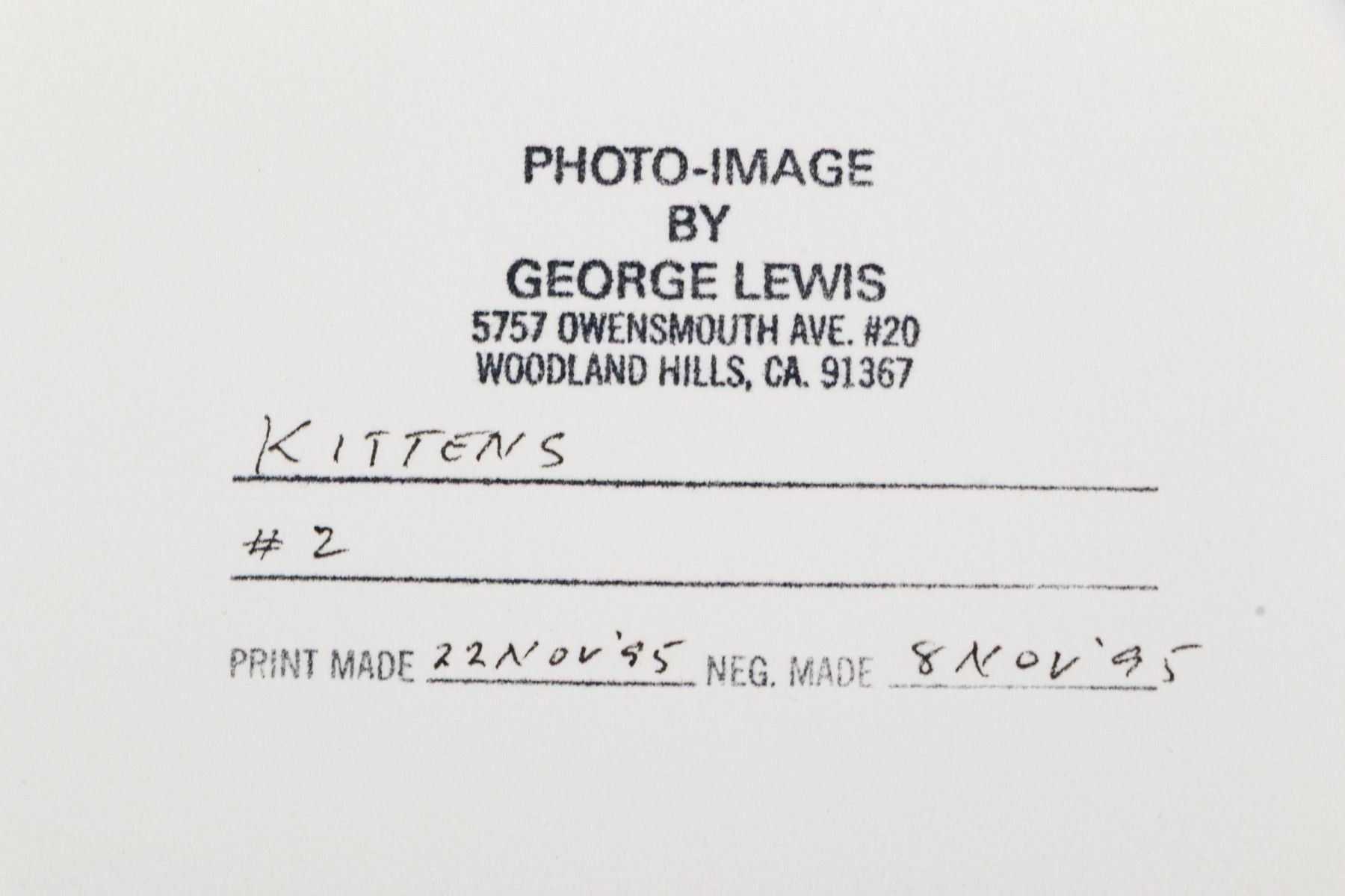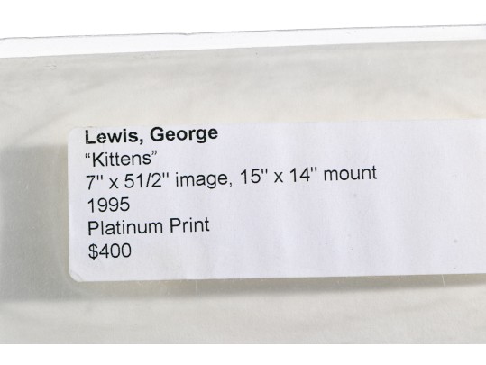 George Lewis (American [CA], 20th C.) "Kittens" platinum palladium photographic print depicting three adorable kittens with attentive expressions, sitting side by side. Signed, numbered #2, labeled with the print being made '95 and the negative '95; with an embossed label at the lower corner and pencil labeled 95/2. In a mount wrapped in plastic, unframed.