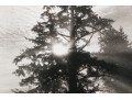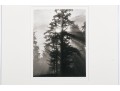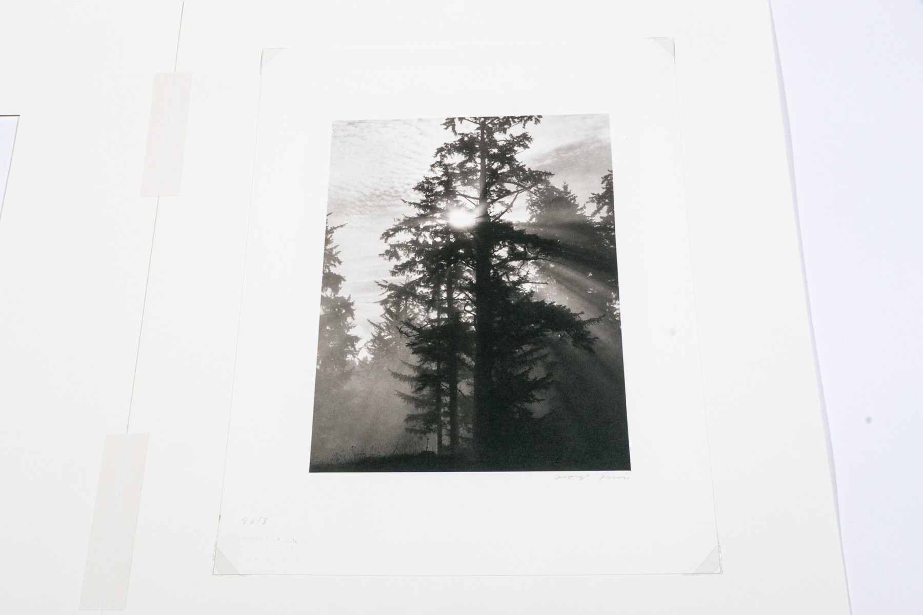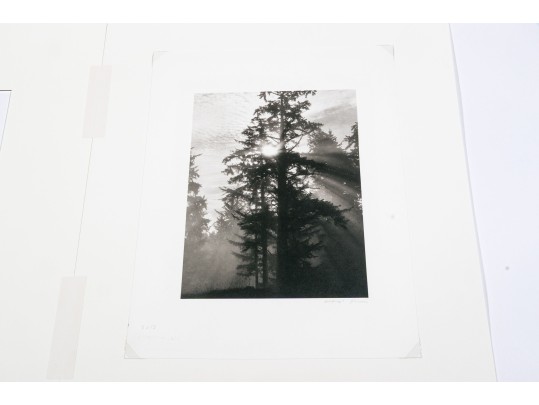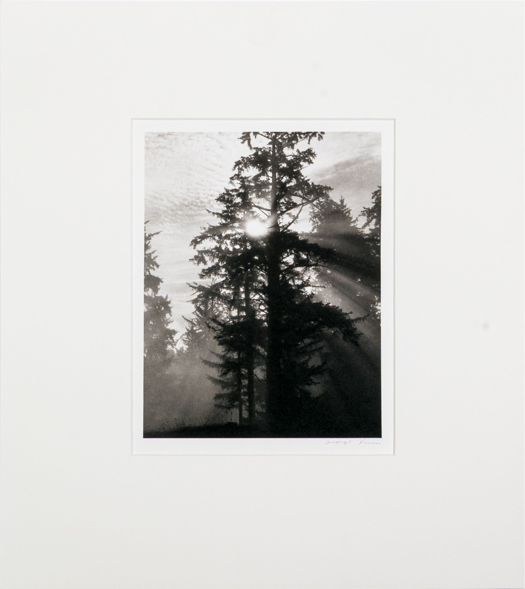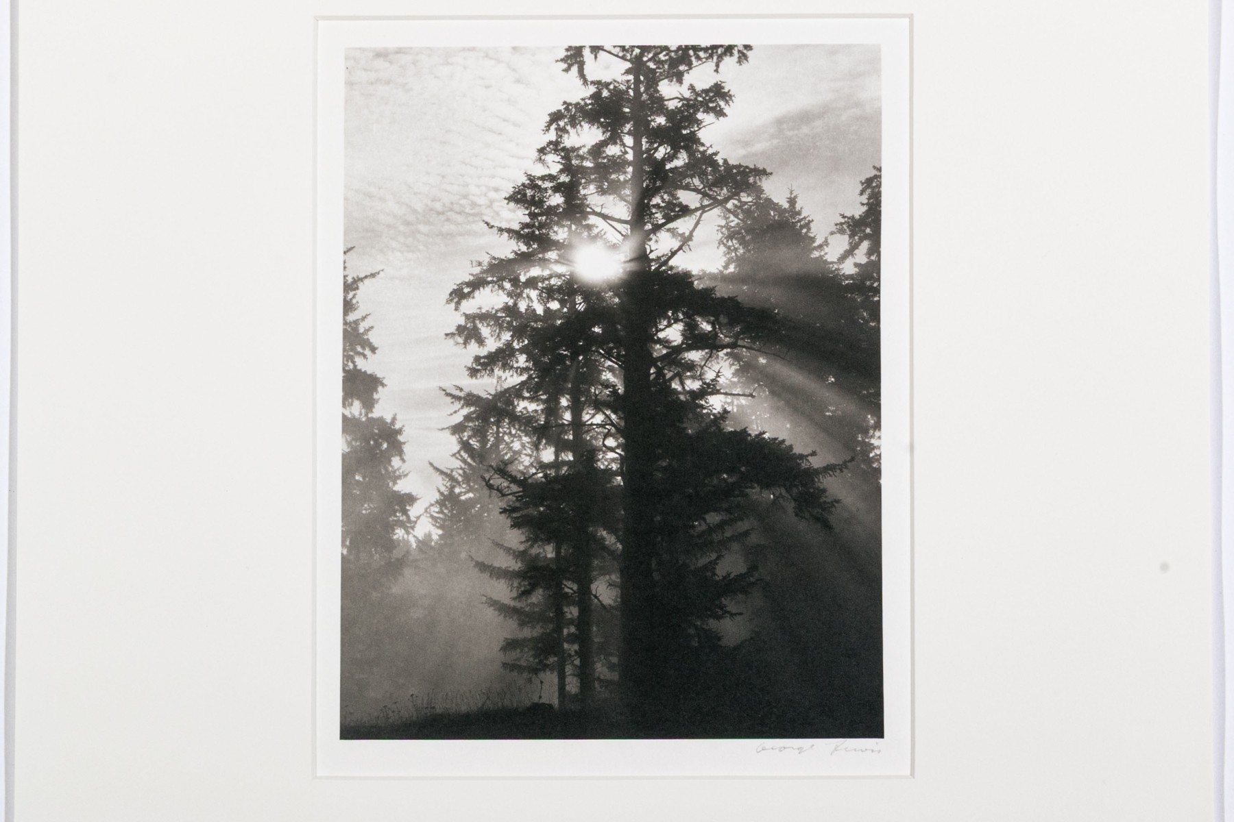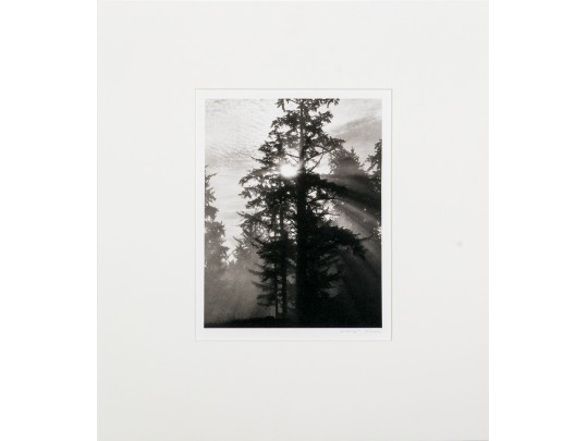 George Lewis (American [CA], 20th C.) "Morning Mist" platinum palladium photographic print depicting sunlight streaming through the foliage of tall pine trees, casing a hazy glow on the forest in the background.