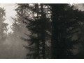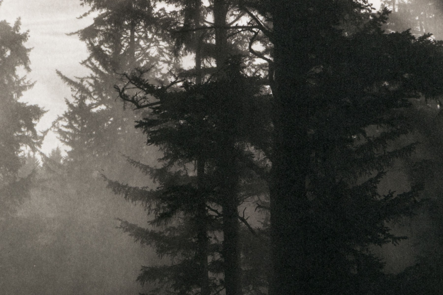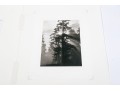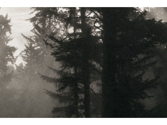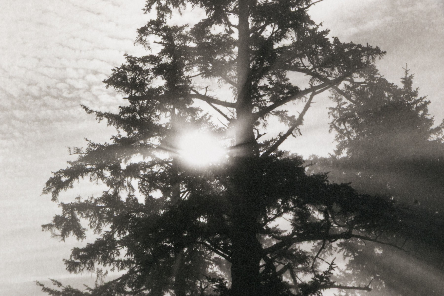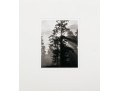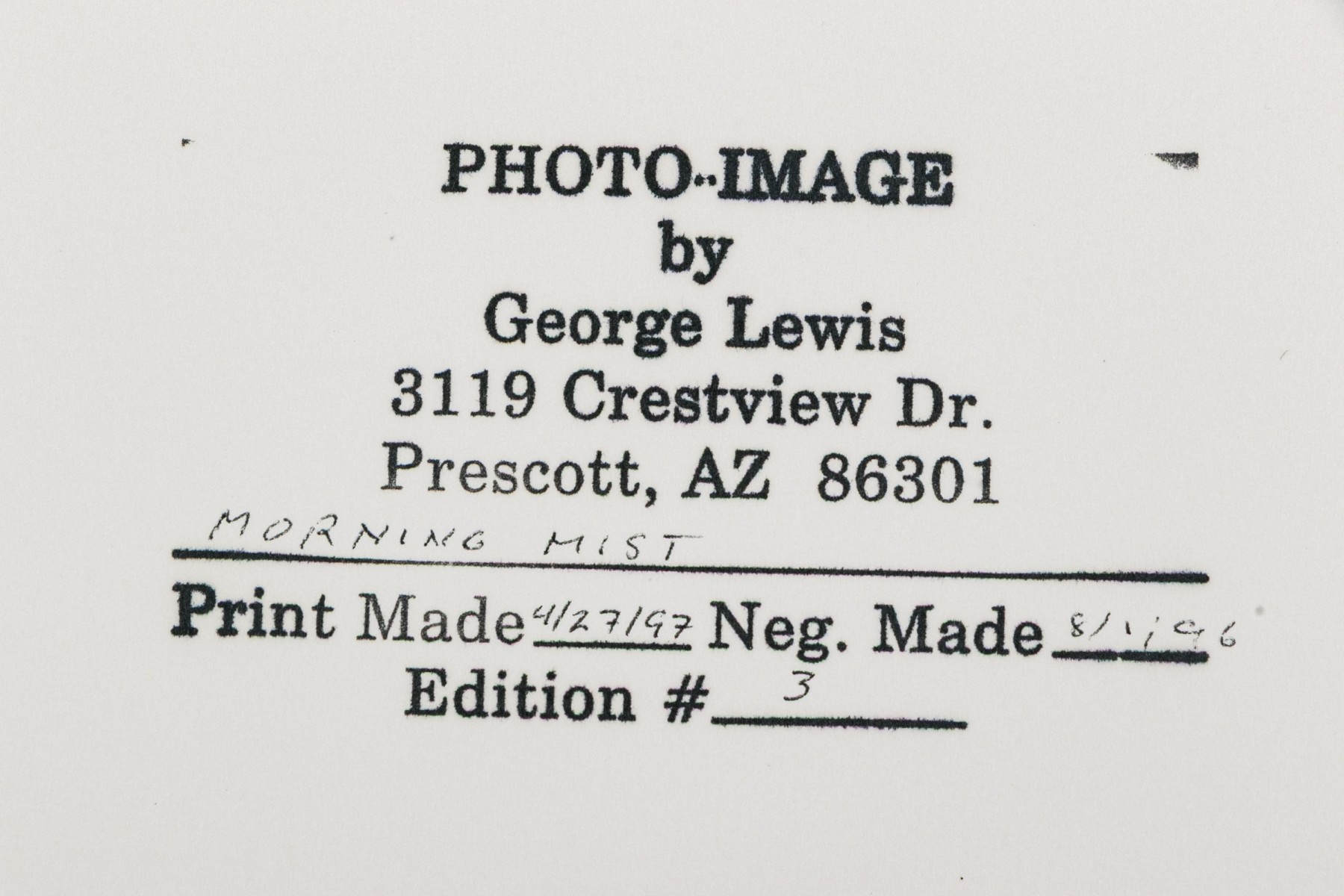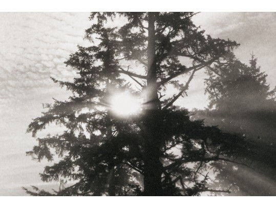 George Lewis (American [CA], 20th C.) "Morning Mist" platinum palladium photographic print depicting sunlight streaming through the foliage of tall pine trees, casing a hazy glow on the forest in the background.