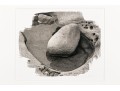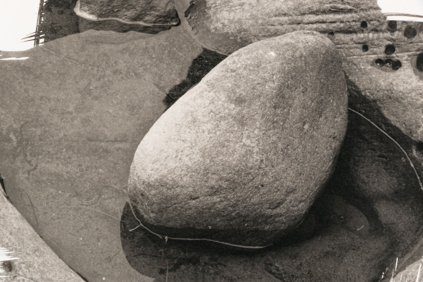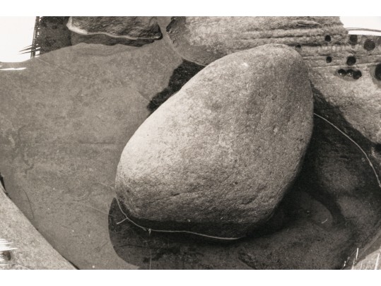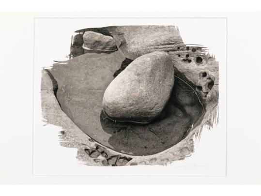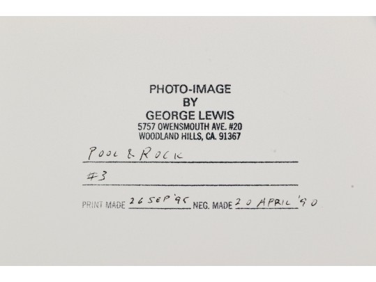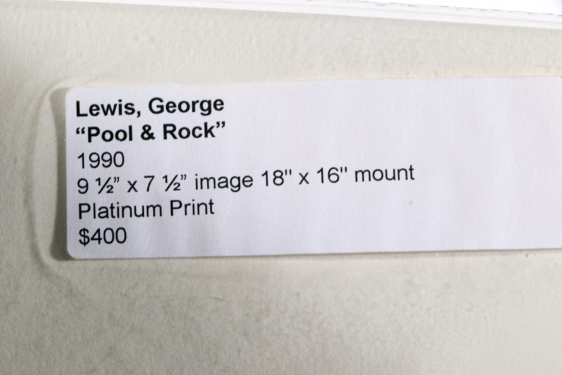 George Lewis (American [CA], 20th C.) "Pool & Rock" platinum palladium photographic print depicting a view of a rounded boulder in a pool of water with a rocky landscape pitted with circular erosion. Signed, numbered #3, labeled with the print being made '95 and the negative '90; with an embossed label at the lower corner and pencil labeled 90/3. In a mount wrapped in plastic, unframed.