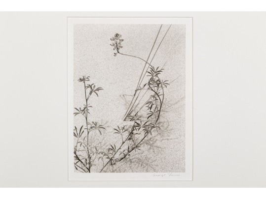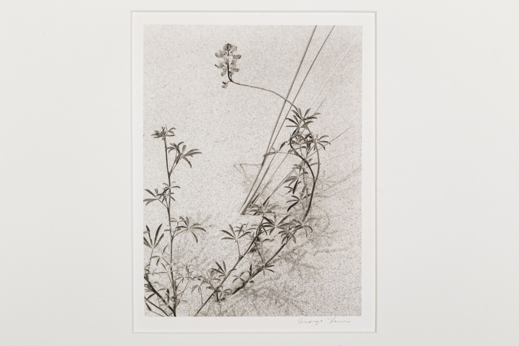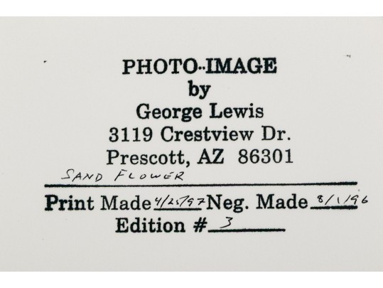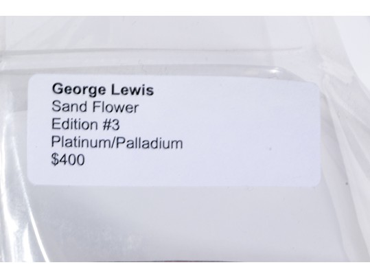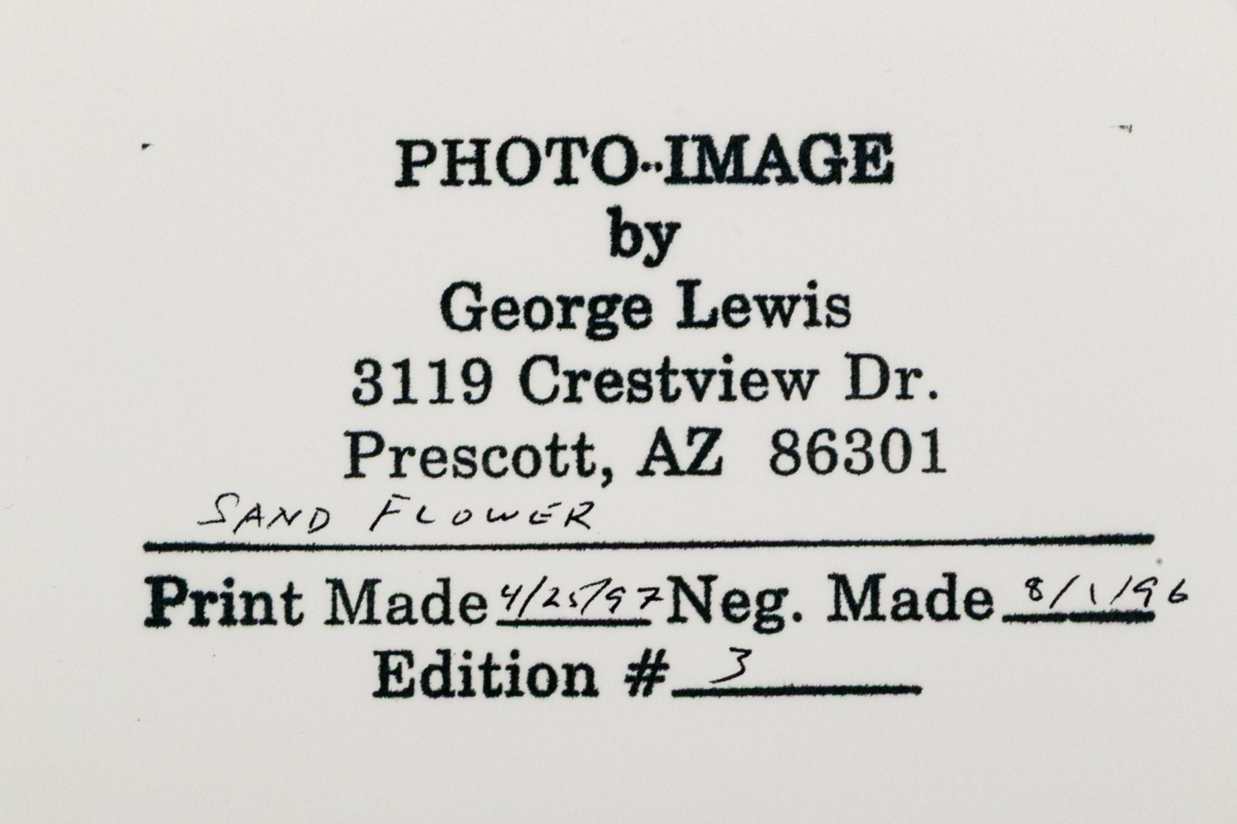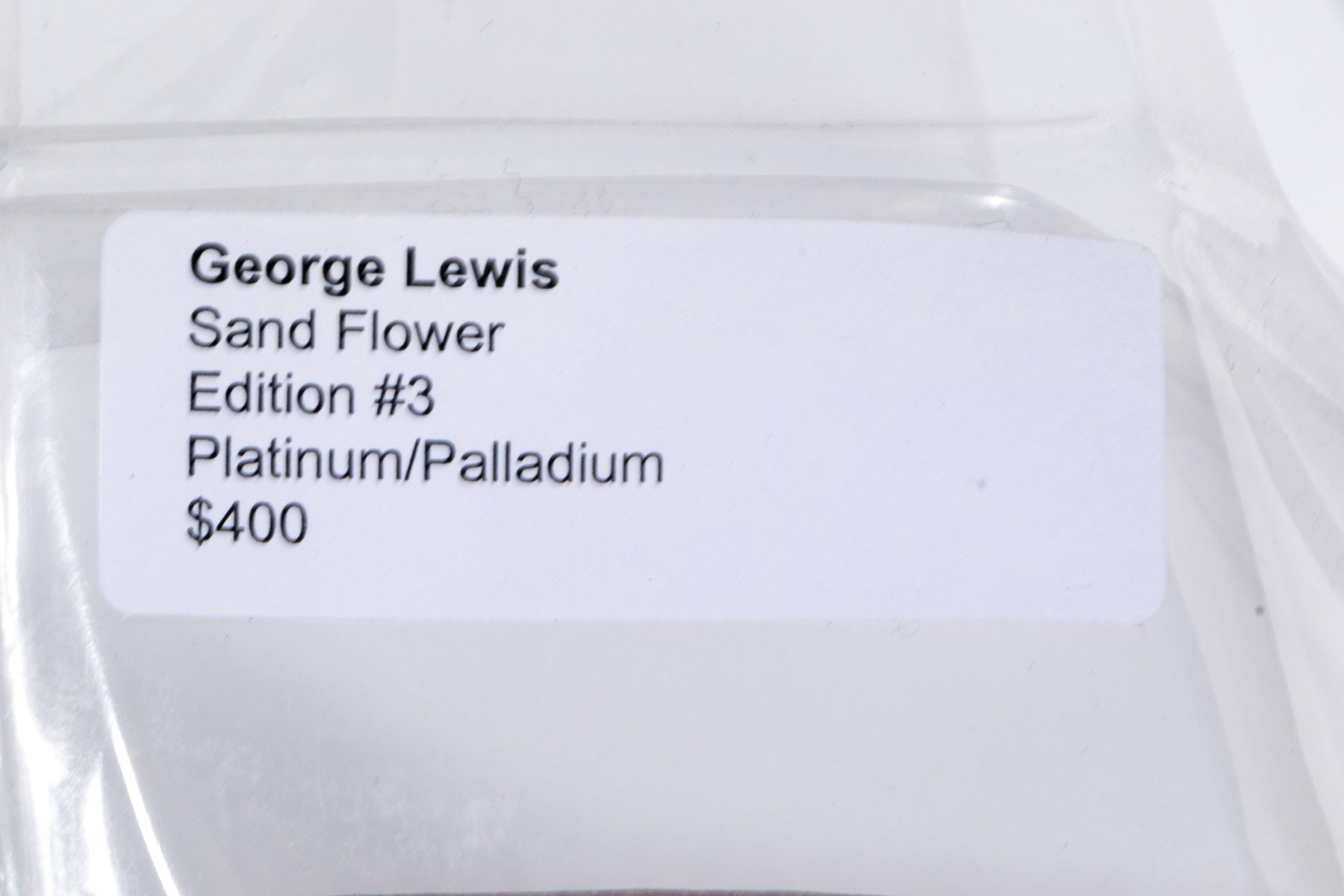 George Lewis (American [CA], 20th C.) "Sand Flower" platinum palladium photographic print depicting tall branching stems with long leaves and a flourish of flowers at the top. Signed, edition numbered #3, labeled with the print being made '97 and the negative '96; with an embossed label at the lower corner and pencil labeled 96/3. In a mount wrapped in plastic, unframed.
