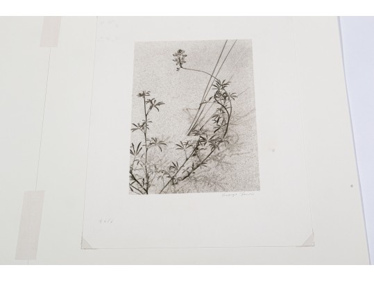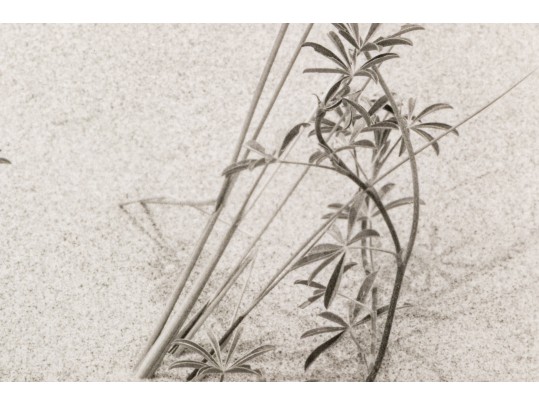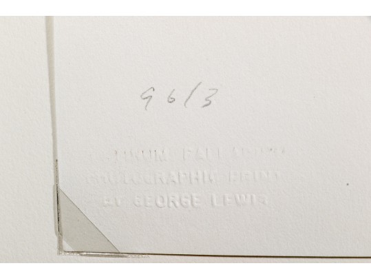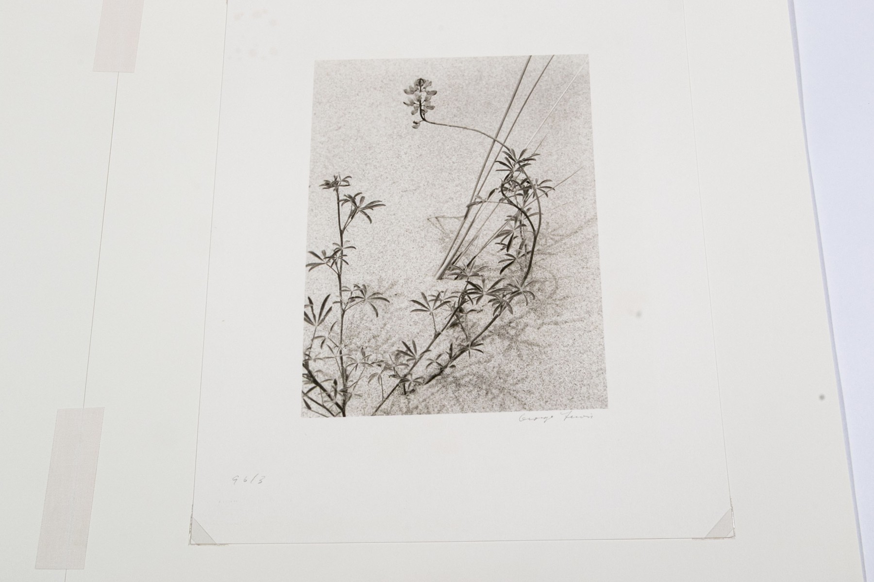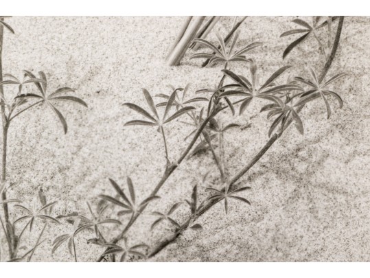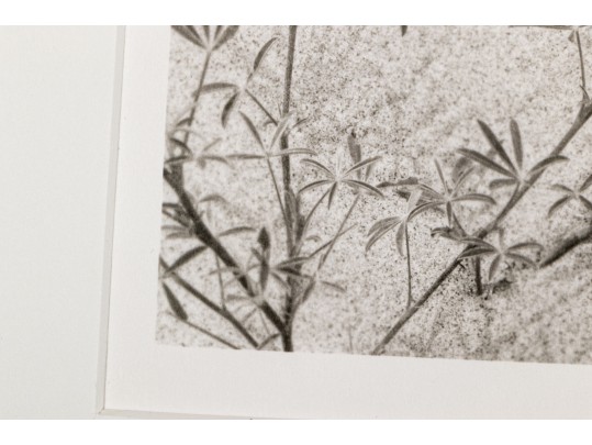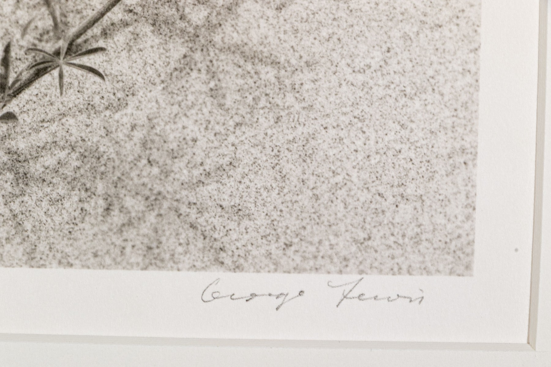 George Lewis (American [CA], 20th C.) "Sand Flower" platinum palladium photographic print depicting tall branching stems with long leaves and a flourish of flowers at the top. Signed, edition numbered #3, labeled with the print being made '97 and the negative '96; with an embossed label at the lower corner and pencil labeled 96/3. In a mount wrapped in plastic, unframed.