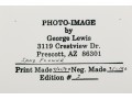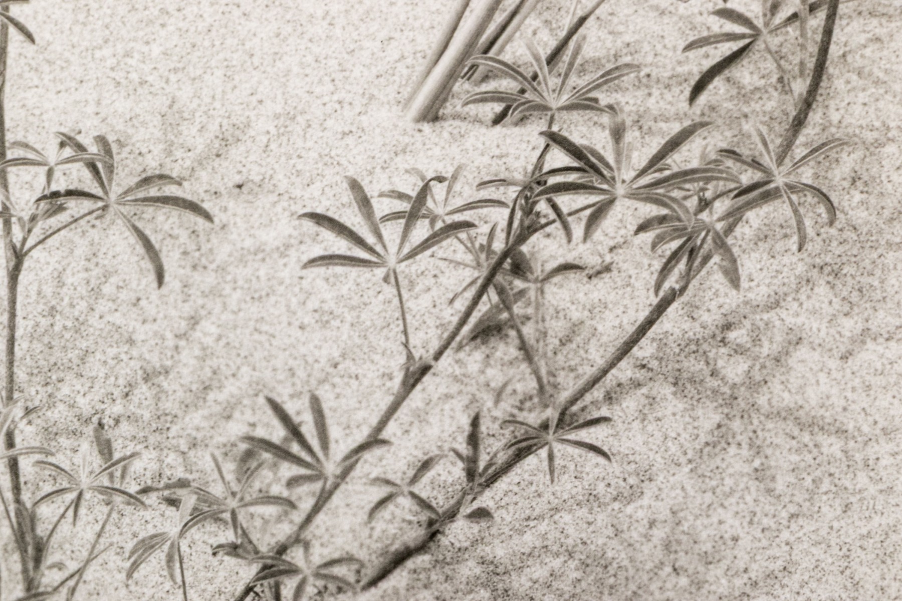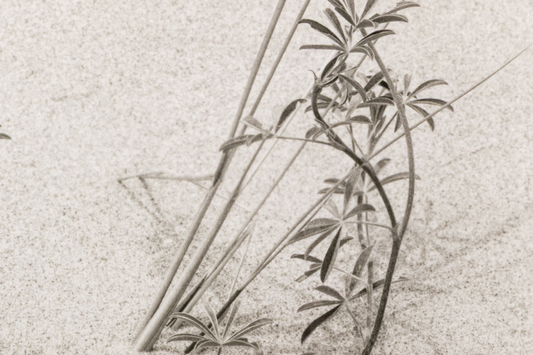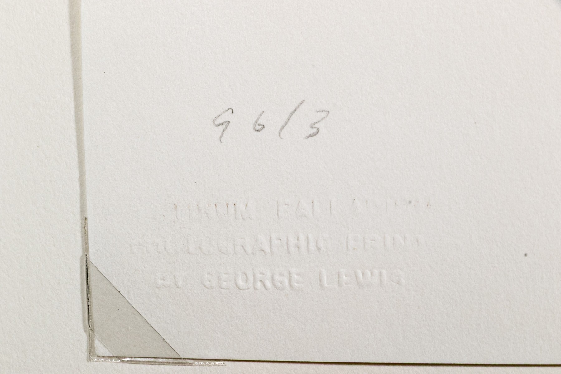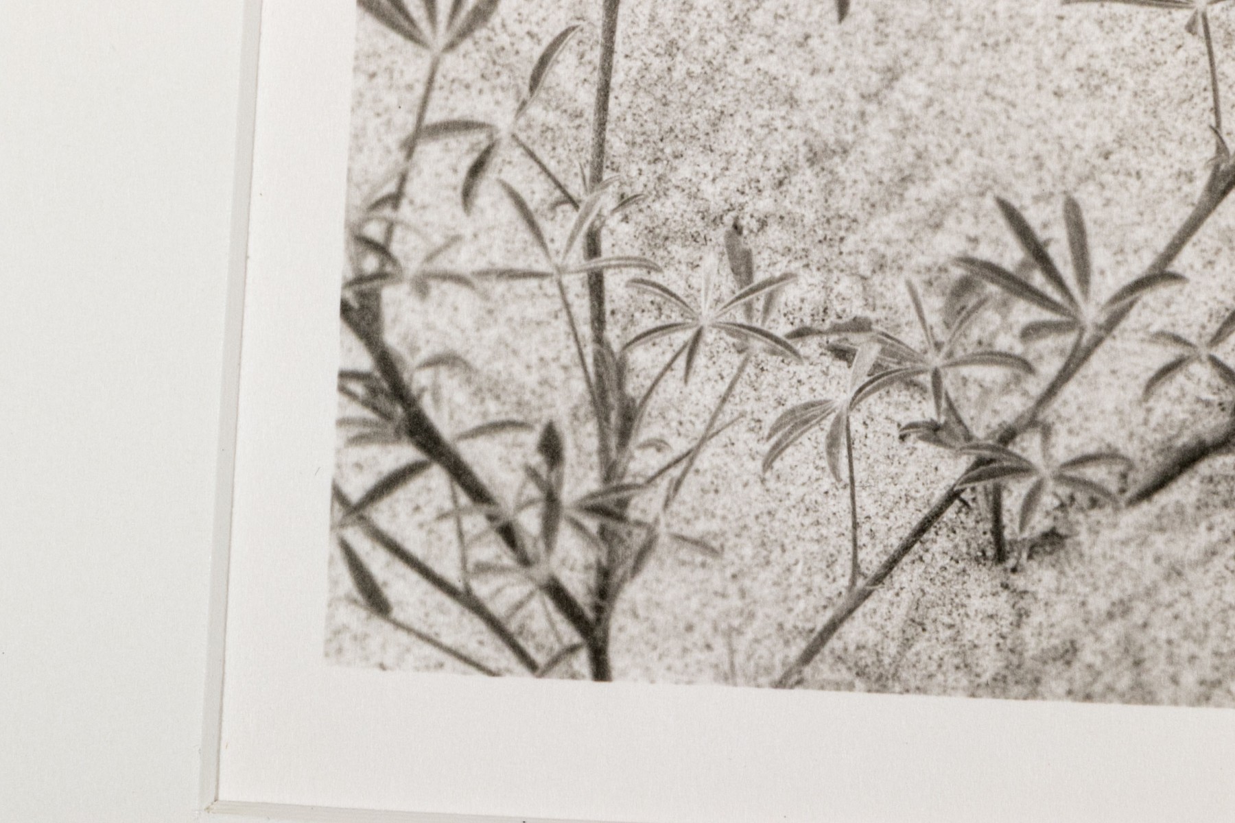 George Lewis (American [CA], 20th C.) "Sand Flower" platinum palladium photographic print depicting tall branching stems with long leaves and a flourish of flowers at the top. Signed, edition numbered #3, labeled with the print being made '97 and the negative '96; with an embossed label at the lower corner and pencil labeled 96/3. In a mount wrapped in plastic, unframed.