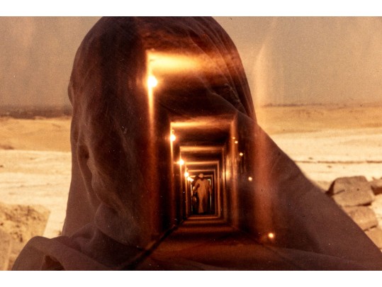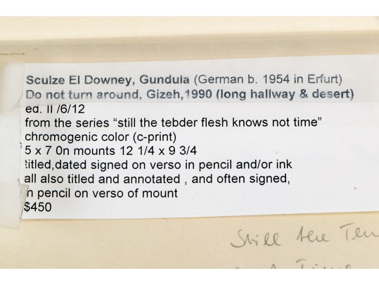 Gundula Schulze Eldowy (German, B. 1954) "Do Not Turn Around, Gizeh, 1990" mounted chromogenic color print from the series "Still The Tender Flesh Knows Not Time" depicting a view of a figure wearing a veil overlooking a desert landscape superimposed over a perspective view of a figure at the end of a hallway. Signed and titled on the verso. Unframed.