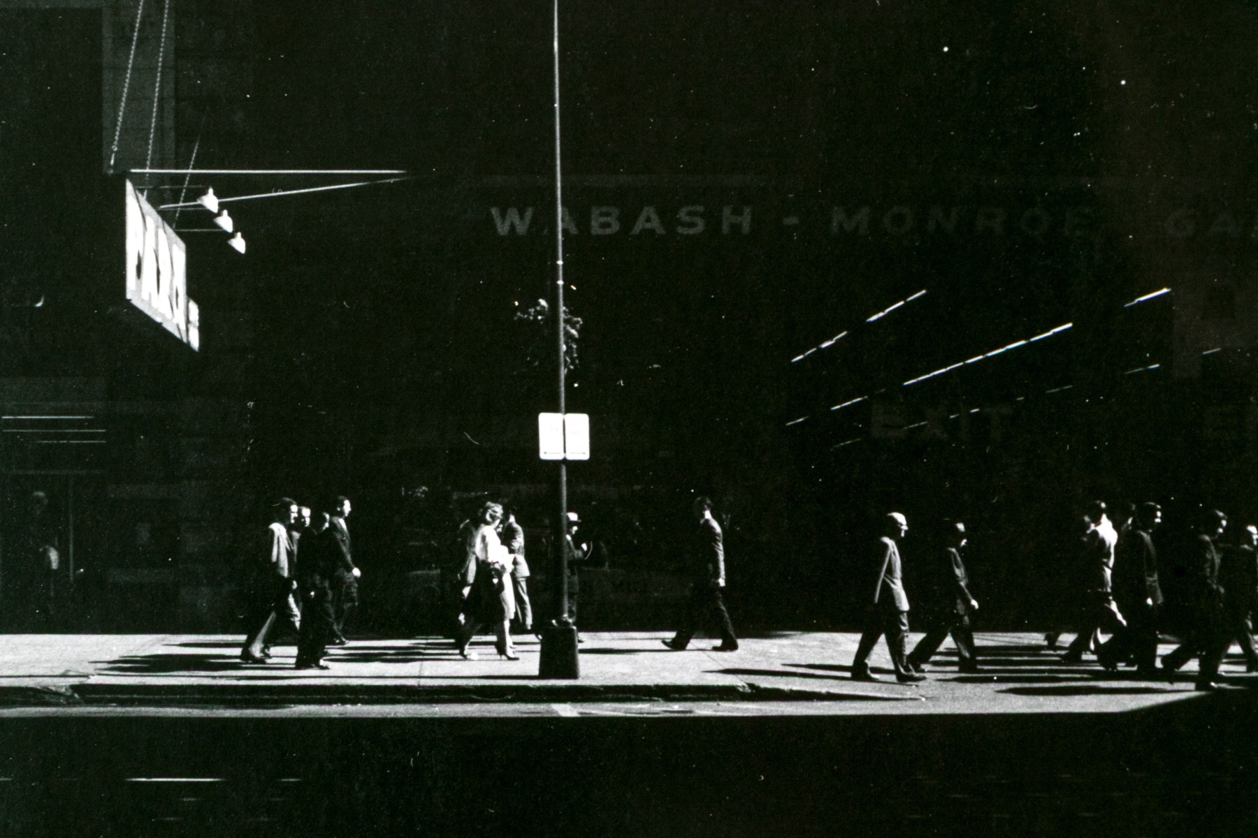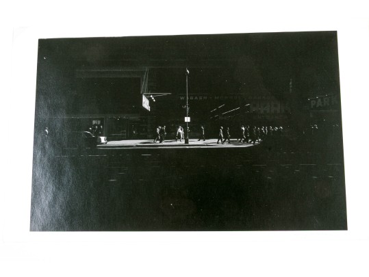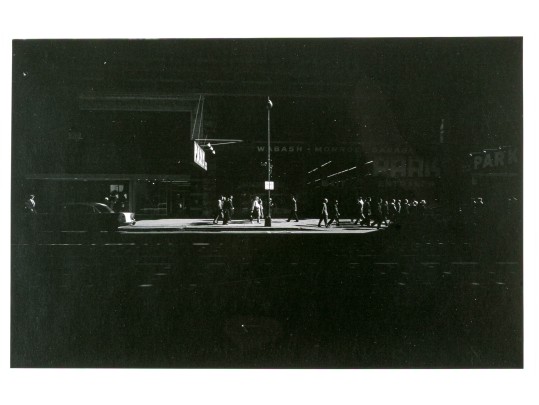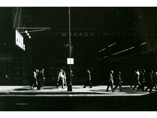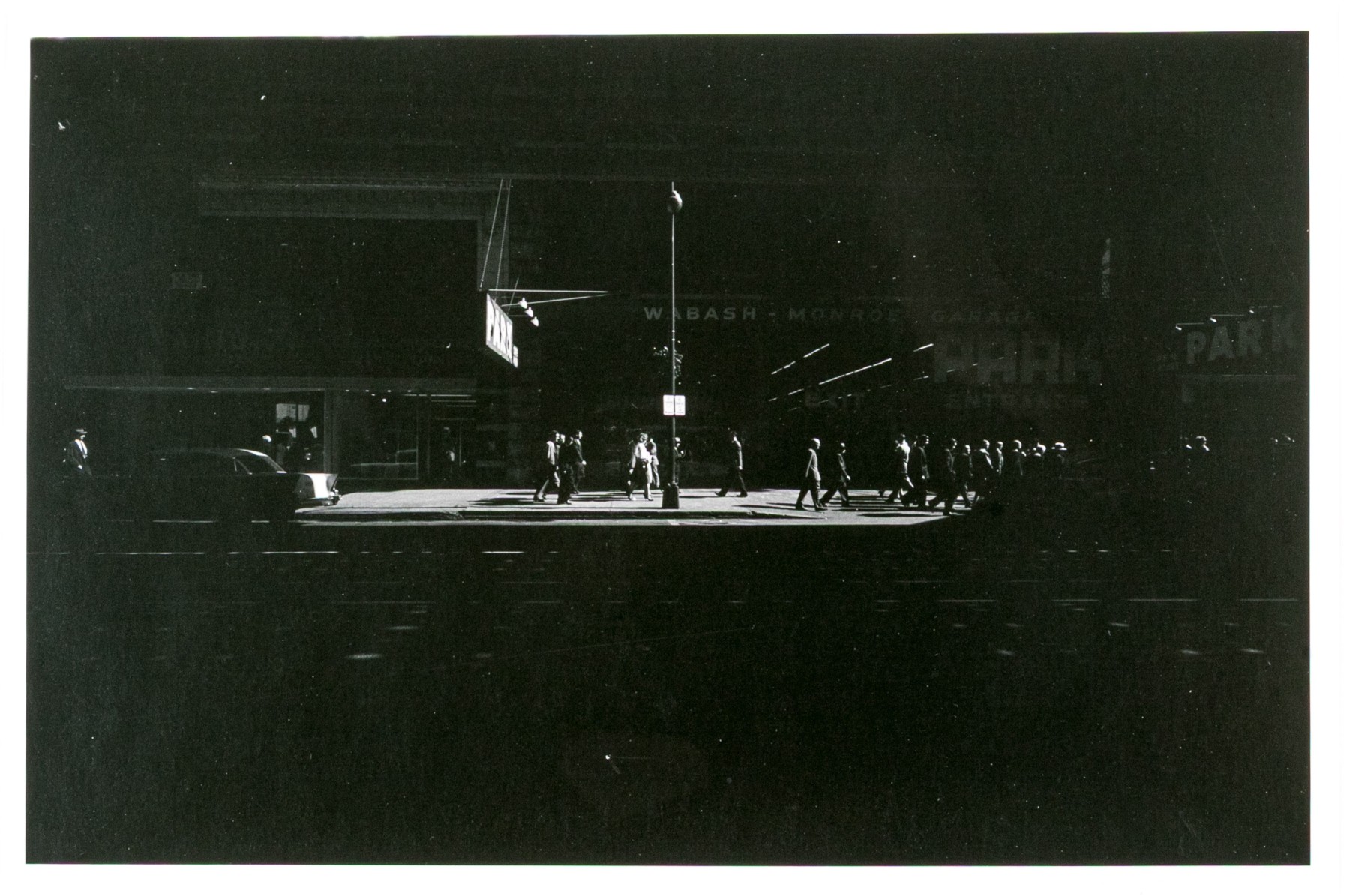Harry Callahan (American, 1912-1999) "Chicago (Wabash)" gelatin silver print depicting a crowd of figures walking an urban sidewalk. Bearing a label from Lallak + Tom Gallery denoting the piece as being printed later and having an original gallery price of $3,500. Unframed.