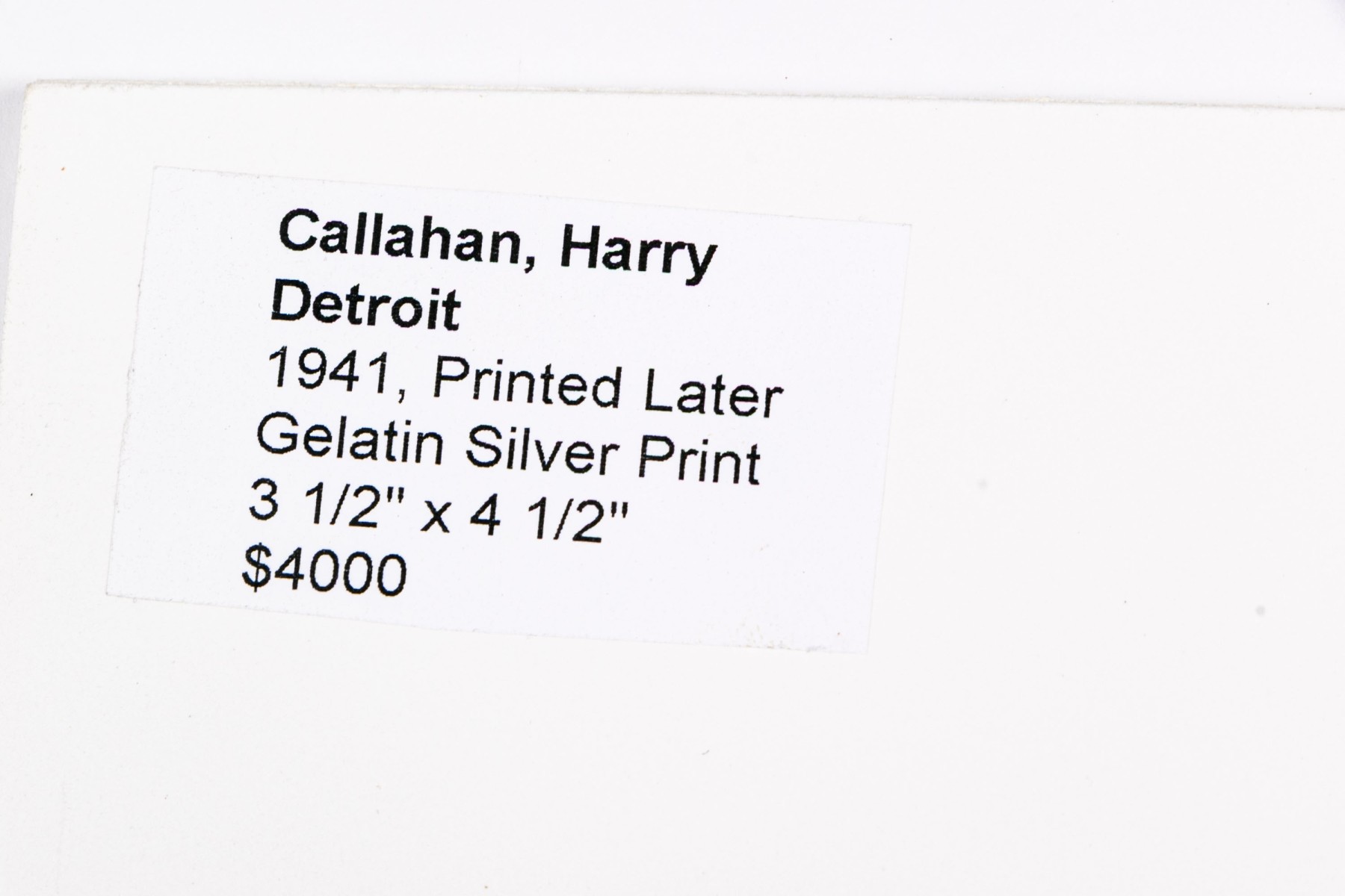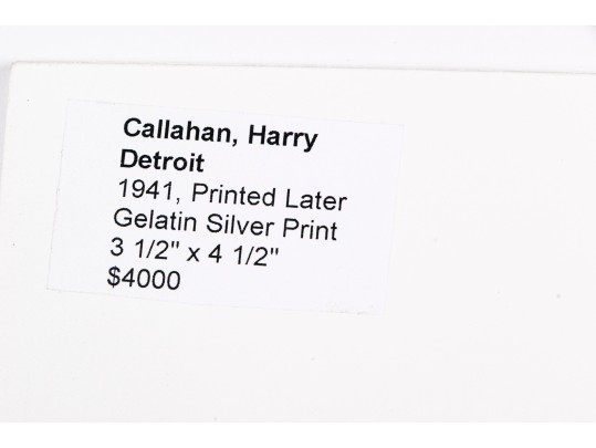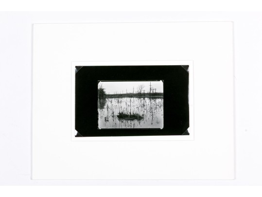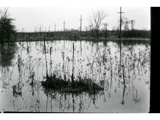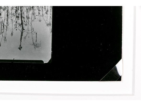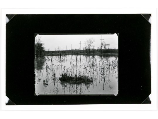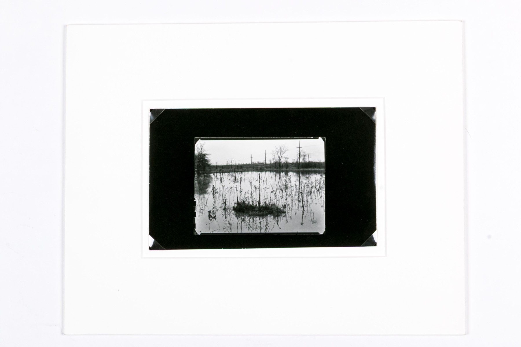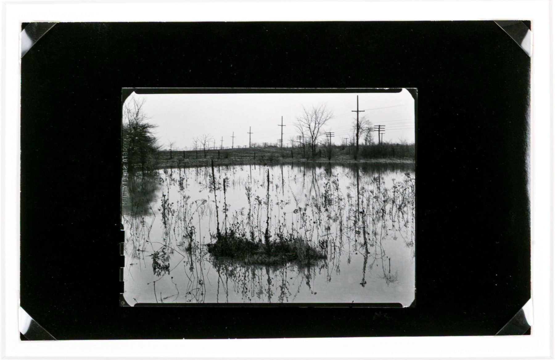 Harry Callahan (American, 1912-1999) "Detroit" gelatin silver print depicting a view of a pond dotted with vertical stems around a small clump island echoing telephone poles running across a grassy field in the background. Bearing a label denoting the piece as being printed later and having an original gallery price of $4,000. Unframed.