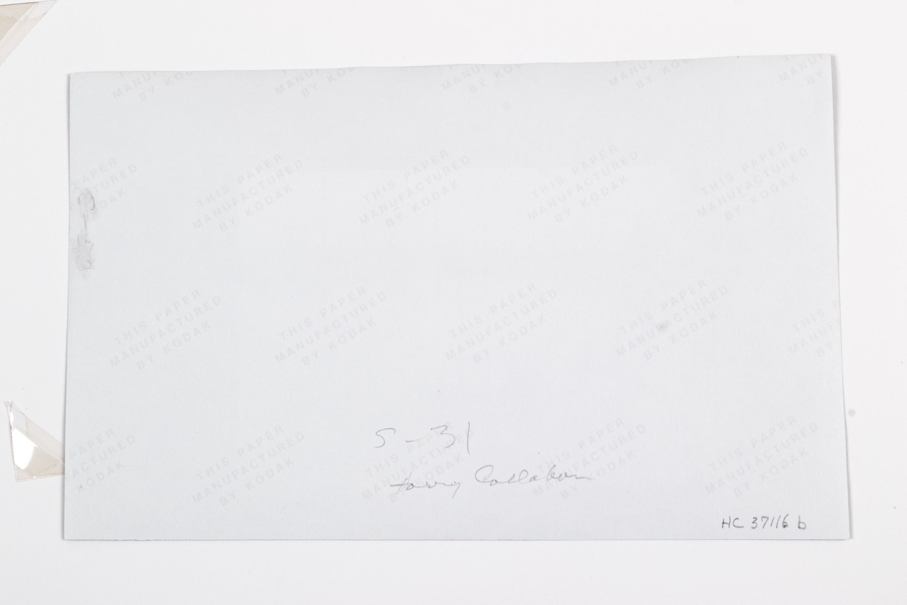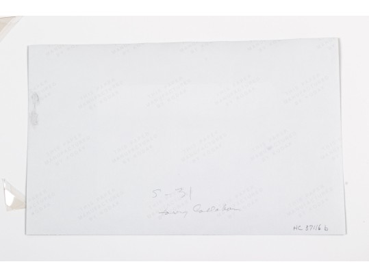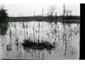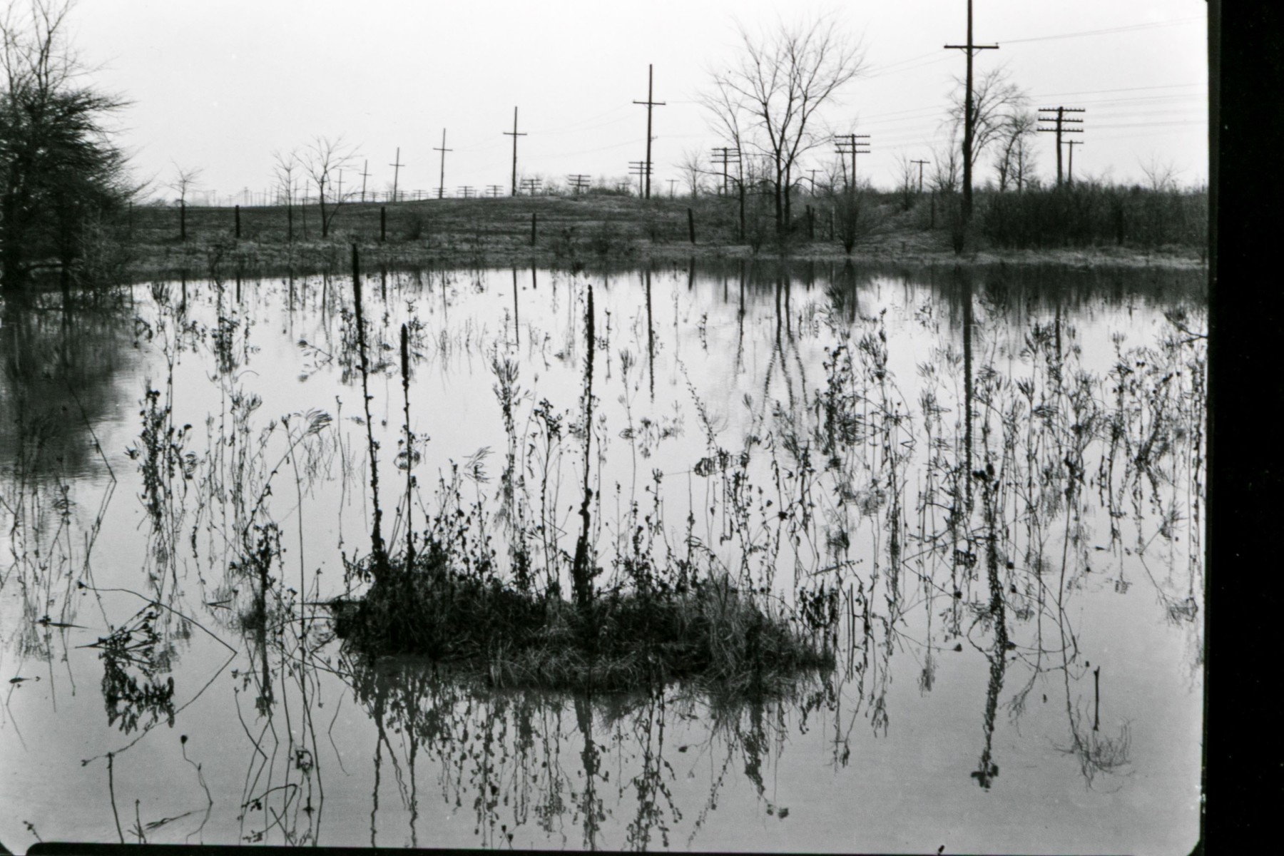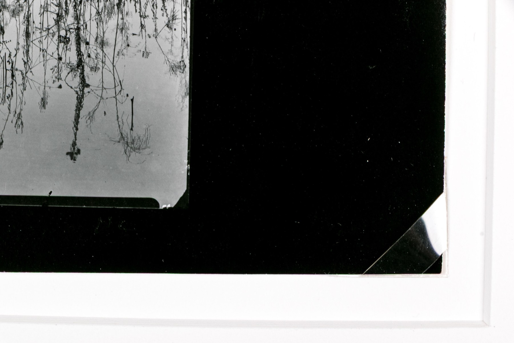 Harry Callahan (American, 1912-1999) "Detroit" gelatin silver print depicting a view of a pond dotted with vertical stems around a small clump island echoing telephone poles running across a grassy field in the background. Bearing a label denoting the piece as being printed later and having an original gallery price of $4,000. Unframed.