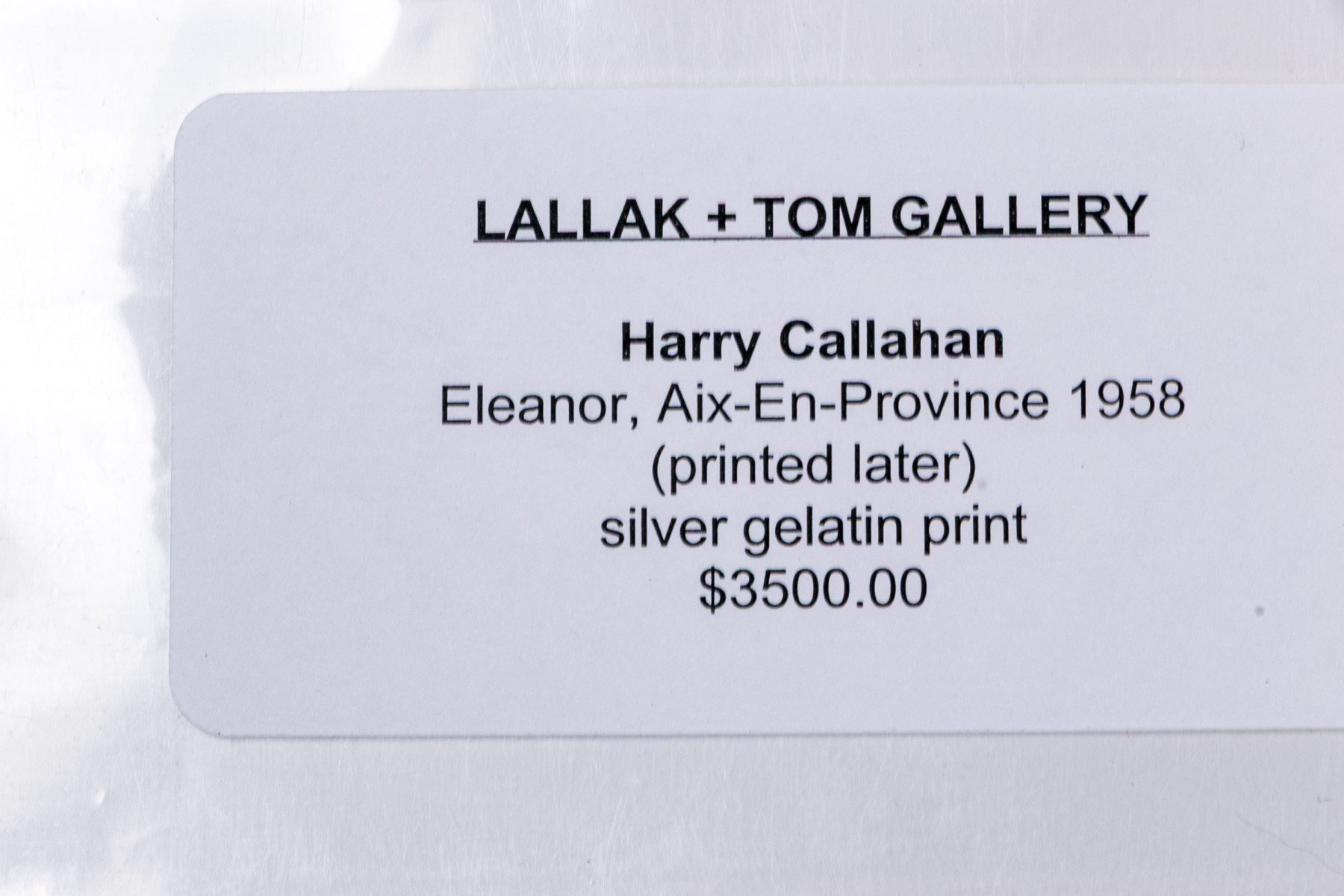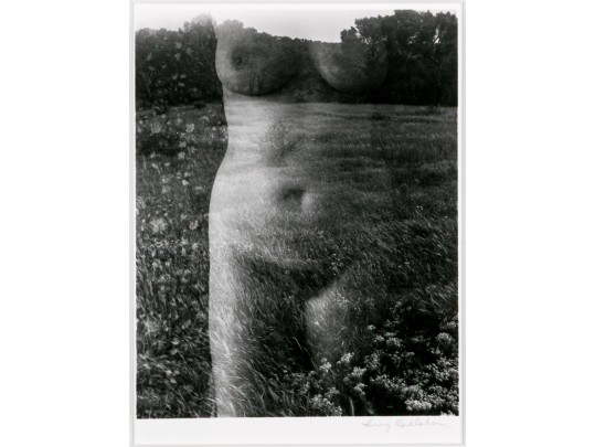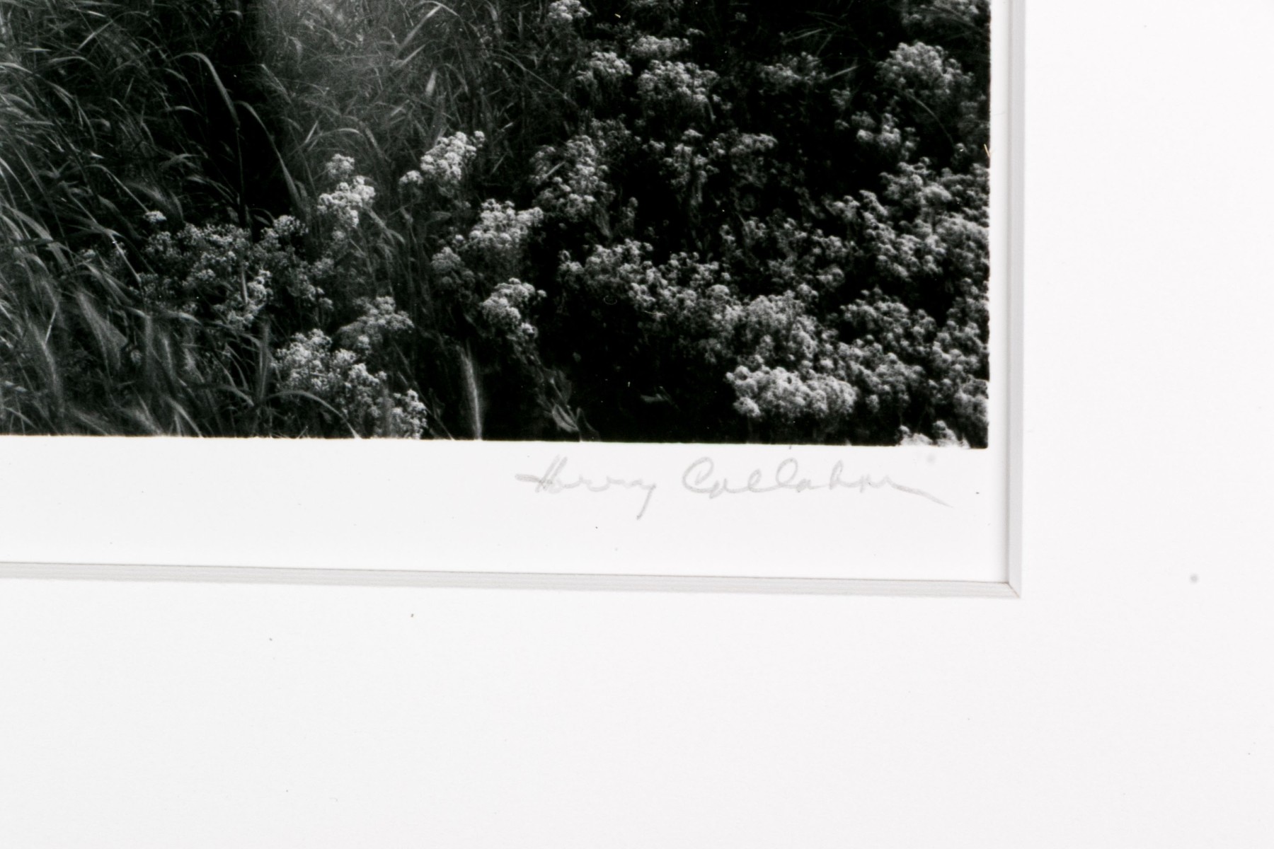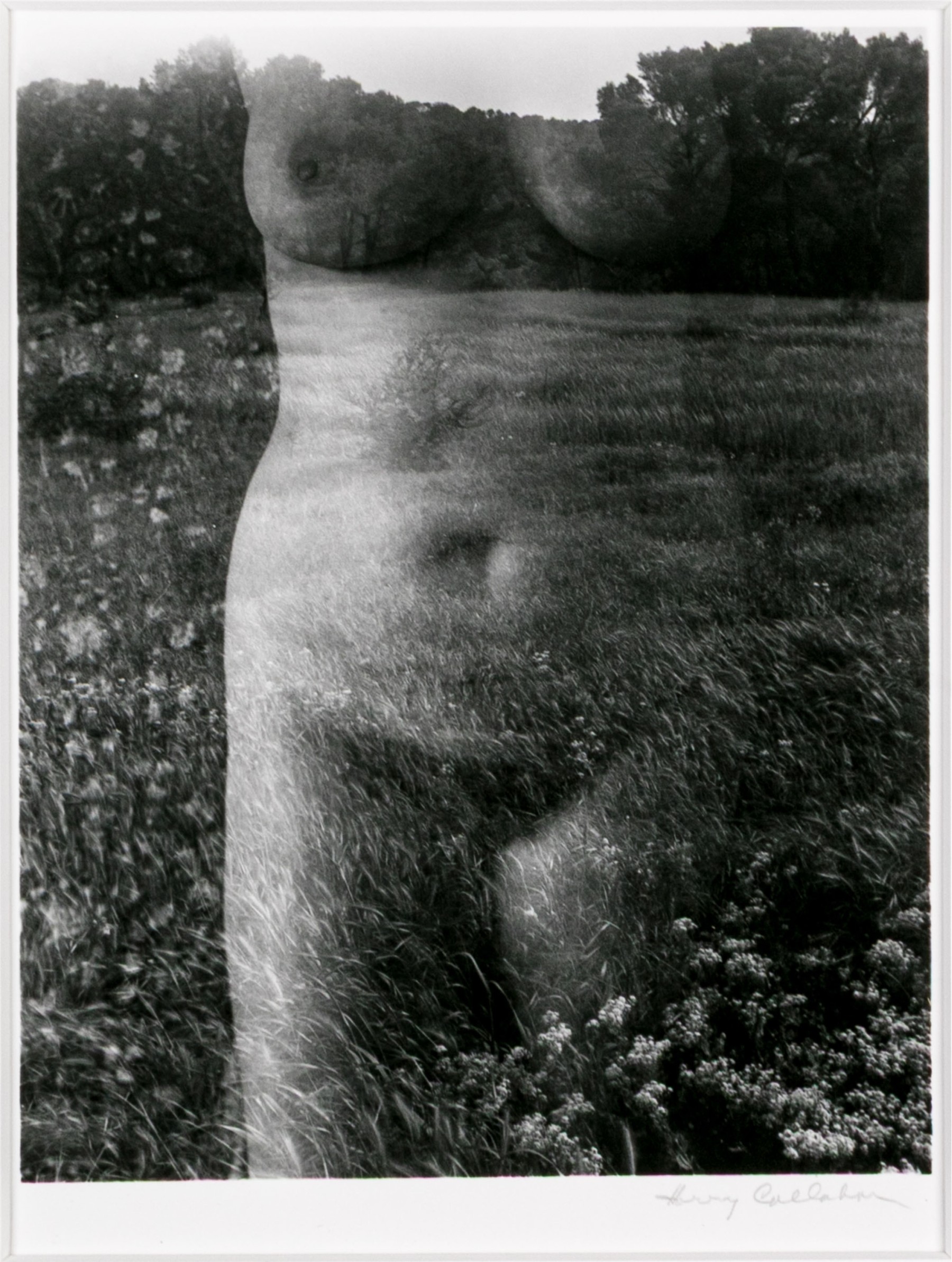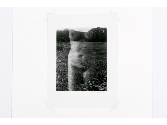 Harry Callahan (American, 1912-1999) "Eleanor, Aix-En-Provence, 1958" gelatin silver print depicting a female nude overlaying a scene of a grassy field dotted with flowers. Handwritten labels on the verso and bearing a label from Lallak + Tom Gallery denoting the piece as being printed later and having an original gallery price of $3,500. Unframed.