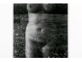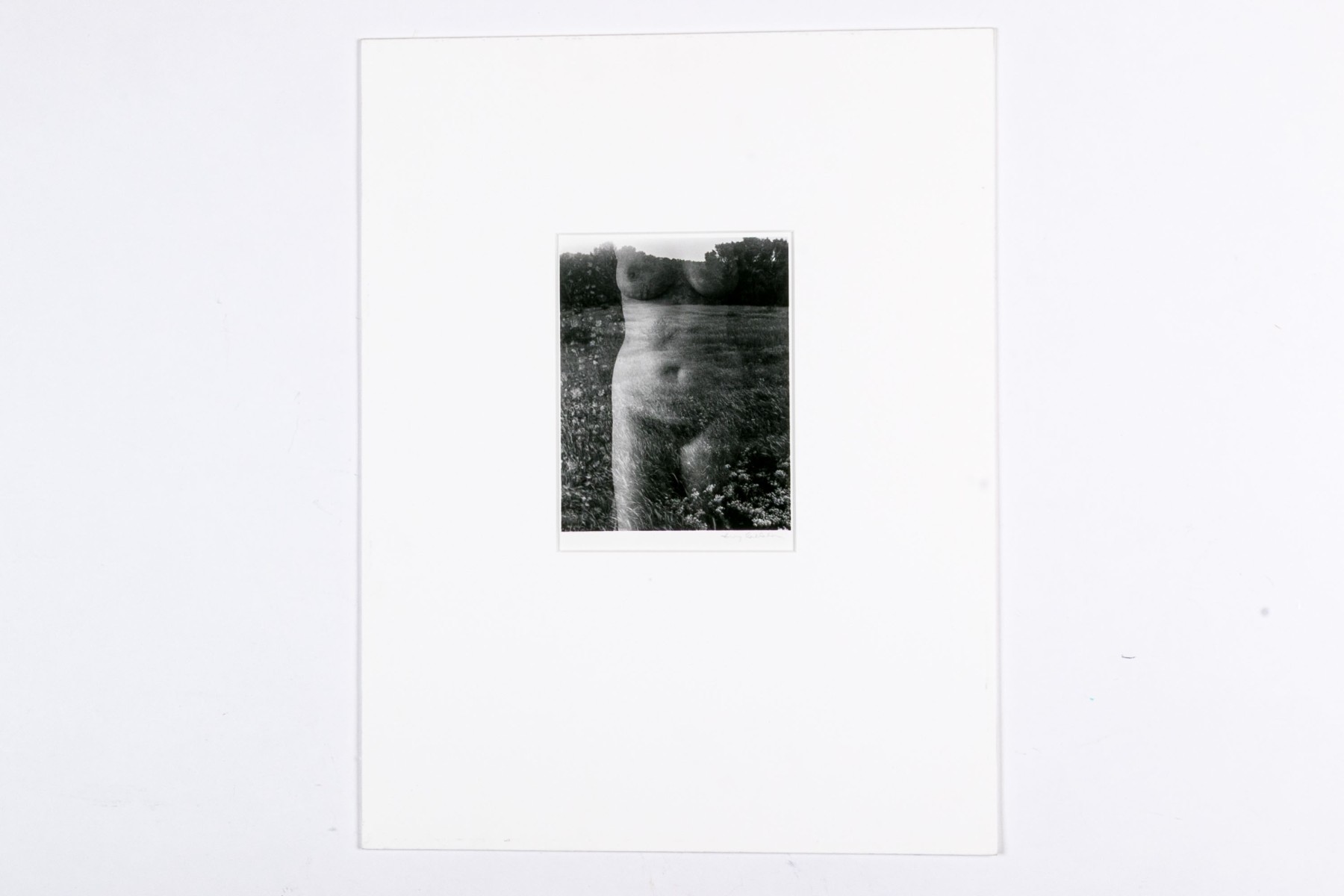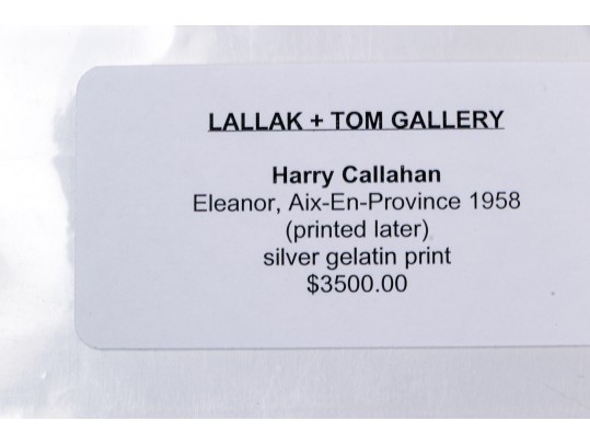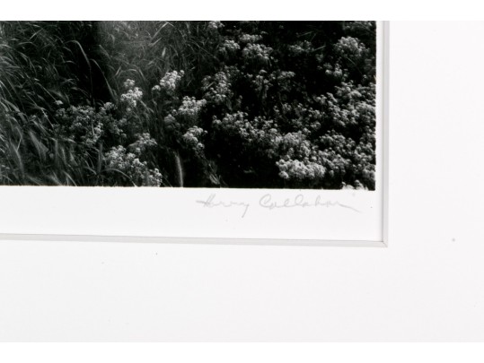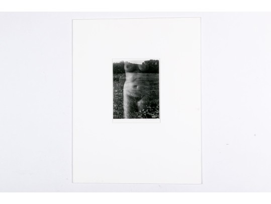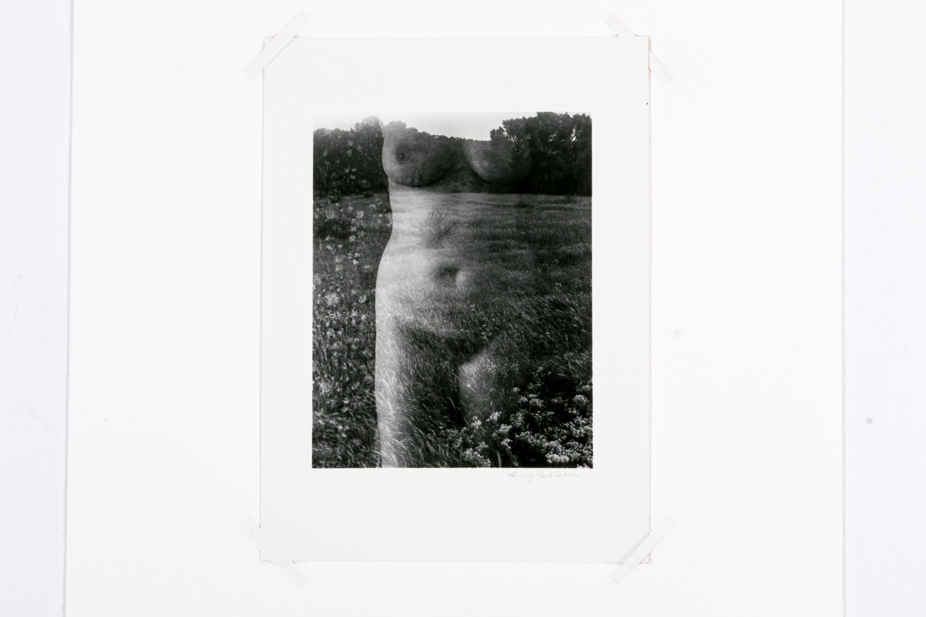 Harry Callahan (American, 1912-1999) "Eleanor, Aix-En-Provence, 1958" gelatin silver print depicting a female nude overlaying a scene of a grassy field dotted with flowers. Handwritten labels on the verso and bearing a label from Lallak + Tom Gallery denoting the piece as being printed later and having an original gallery price of $3,500. Unframed.
