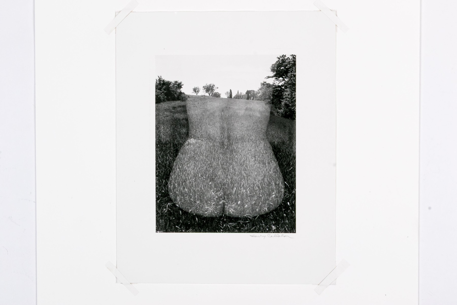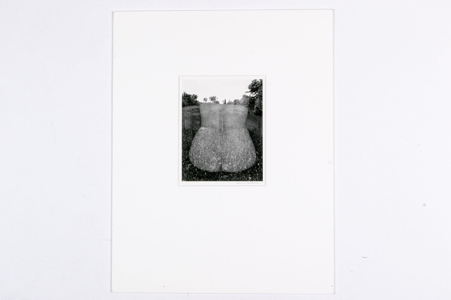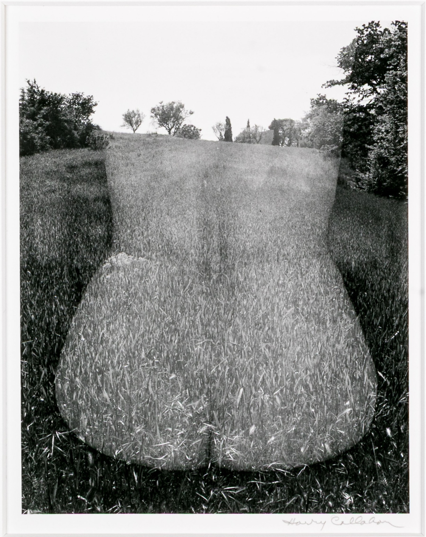Harry Callahan (American, 1912-1999) "Eleanor, Aix-En-Province" gelatin silver print depicting a female nude lower back turned away from the viewer overlaid partially transparent over a grassy field dotted with trees. Pencil signed lower right. Bearing a label from Lallak + Tom Gallery denoting the piece as being printed later and having an original gallery price of $3,500. Unframed.