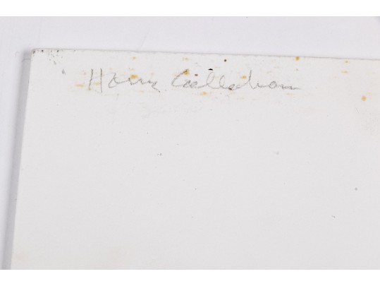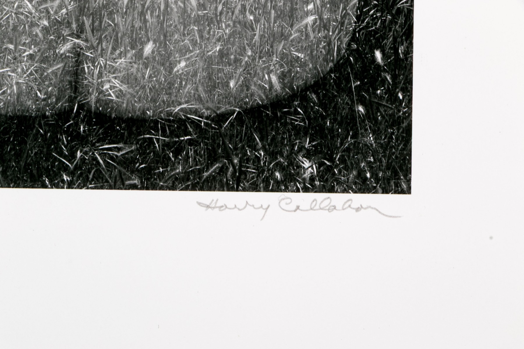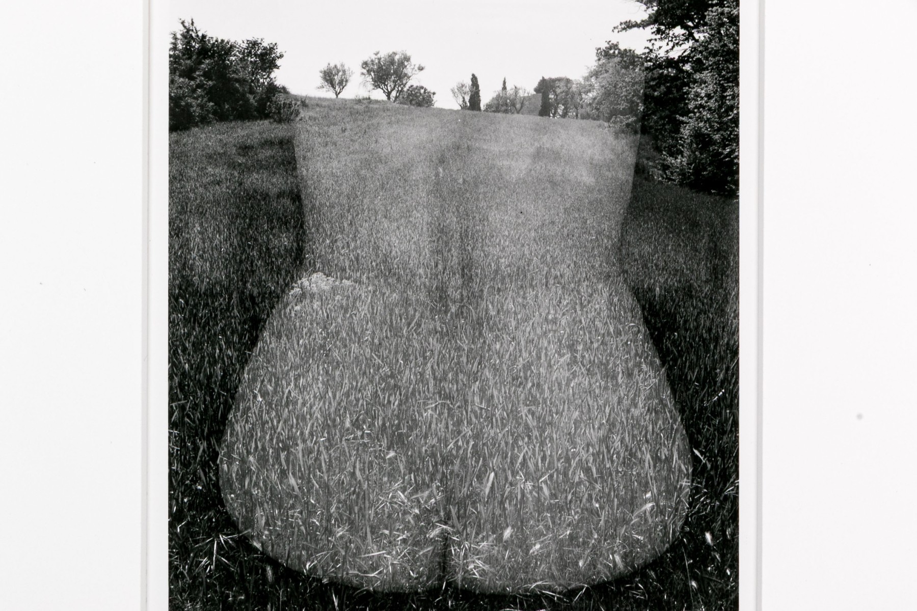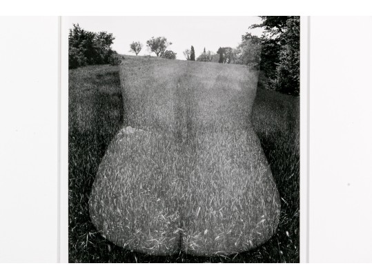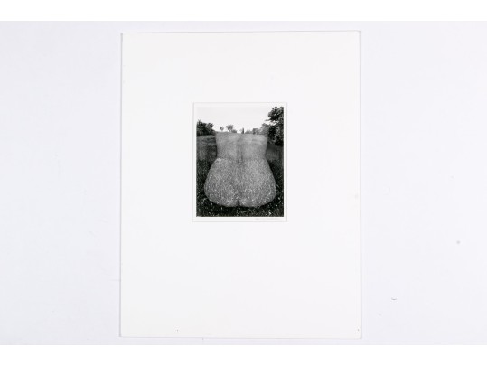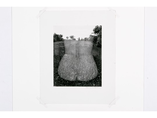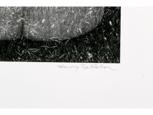 Harry Callahan (American, 1912-1999) "Eleanor, Aix-En-Province" gelatin silver print depicting a female nude lower back turned away from the viewer overlaid partially transparent over a grassy field dotted with trees. Pencil signed lower right. Bearing a label from Lallak + Tom Gallery denoting the piece as being printed later and having an original gallery price of $3,500. Unframed.