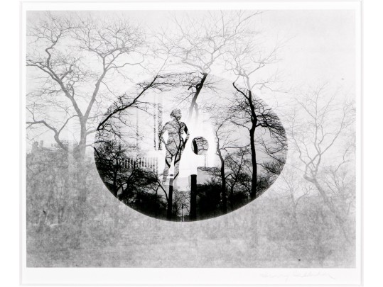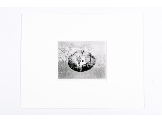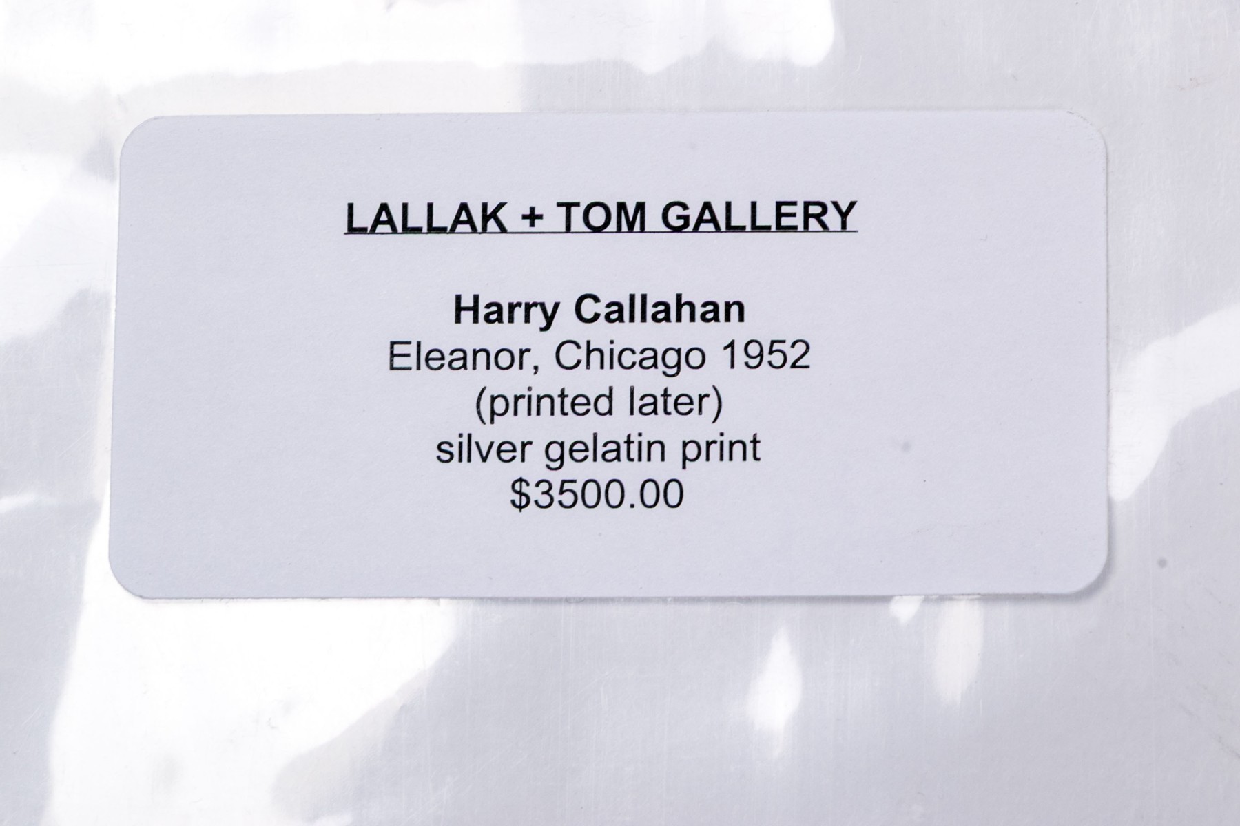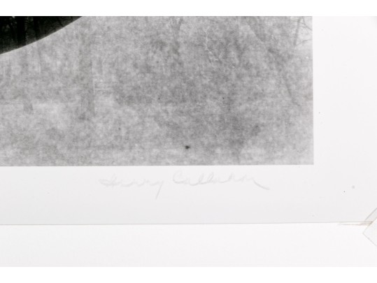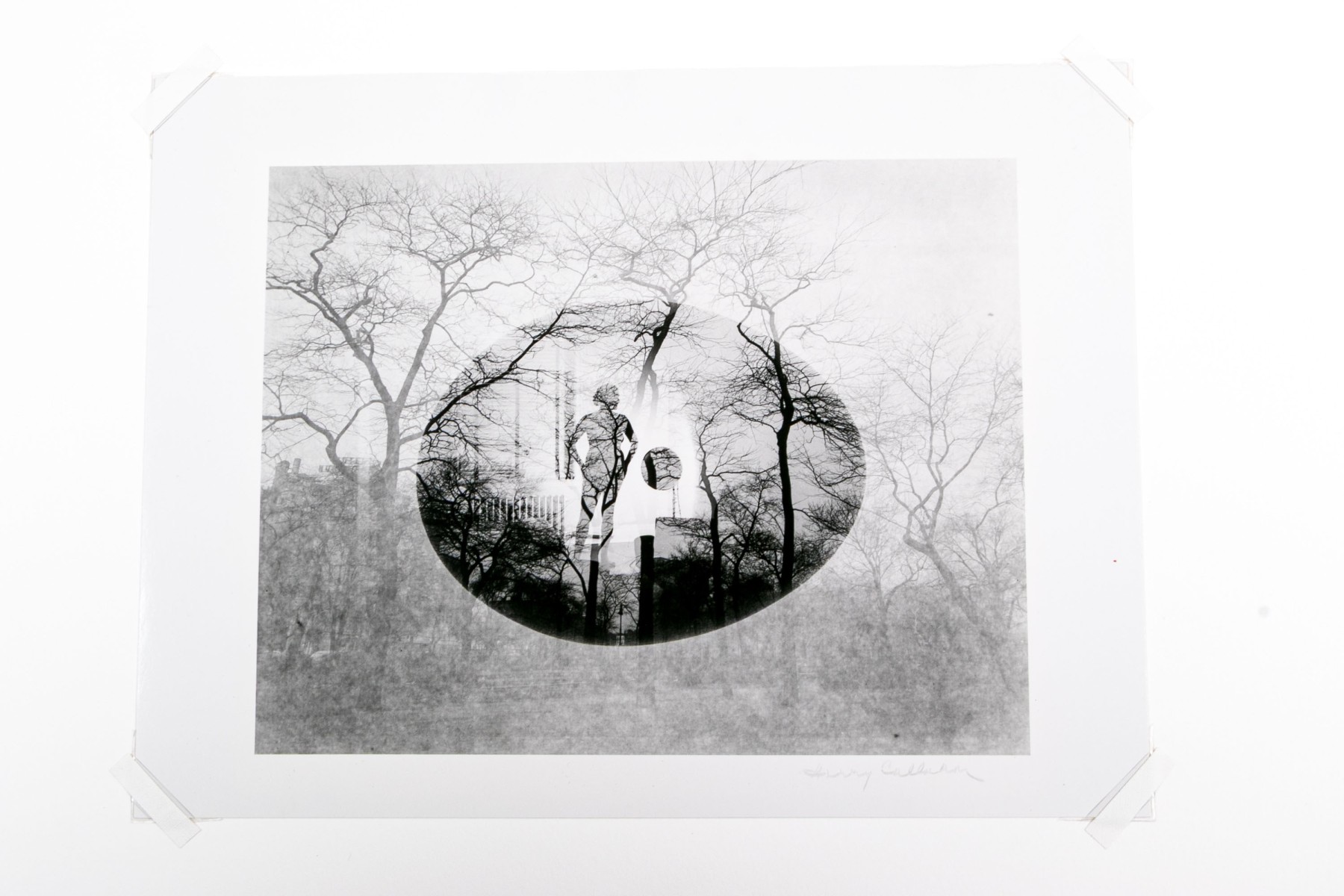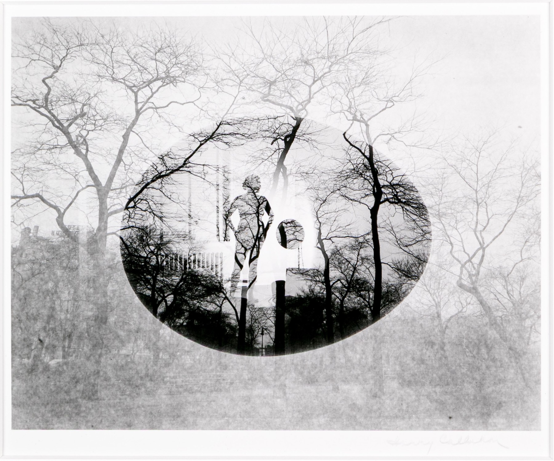 Harry Callahan (American, 1912-1999) "Eleanor, Chicago" gelatin silver print depicting the silhouette of a a female nude posed standing with hands on her hips overlaying a forested landscape with a circular window of clarity surrounded by a foggy effect. Pencil signed lower right. Bearing a label from Lallak + Tom Gallery denoting the piece as being printed later and having an original gallery price of $3,500. Unframed.
