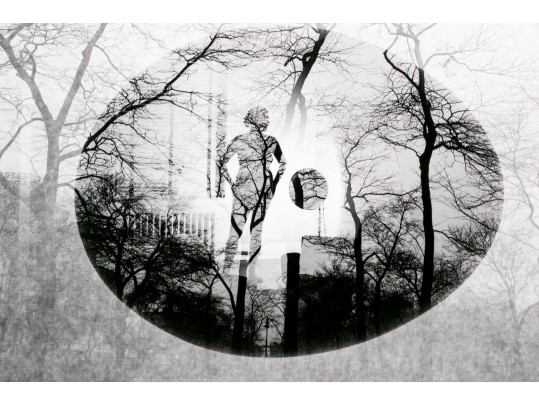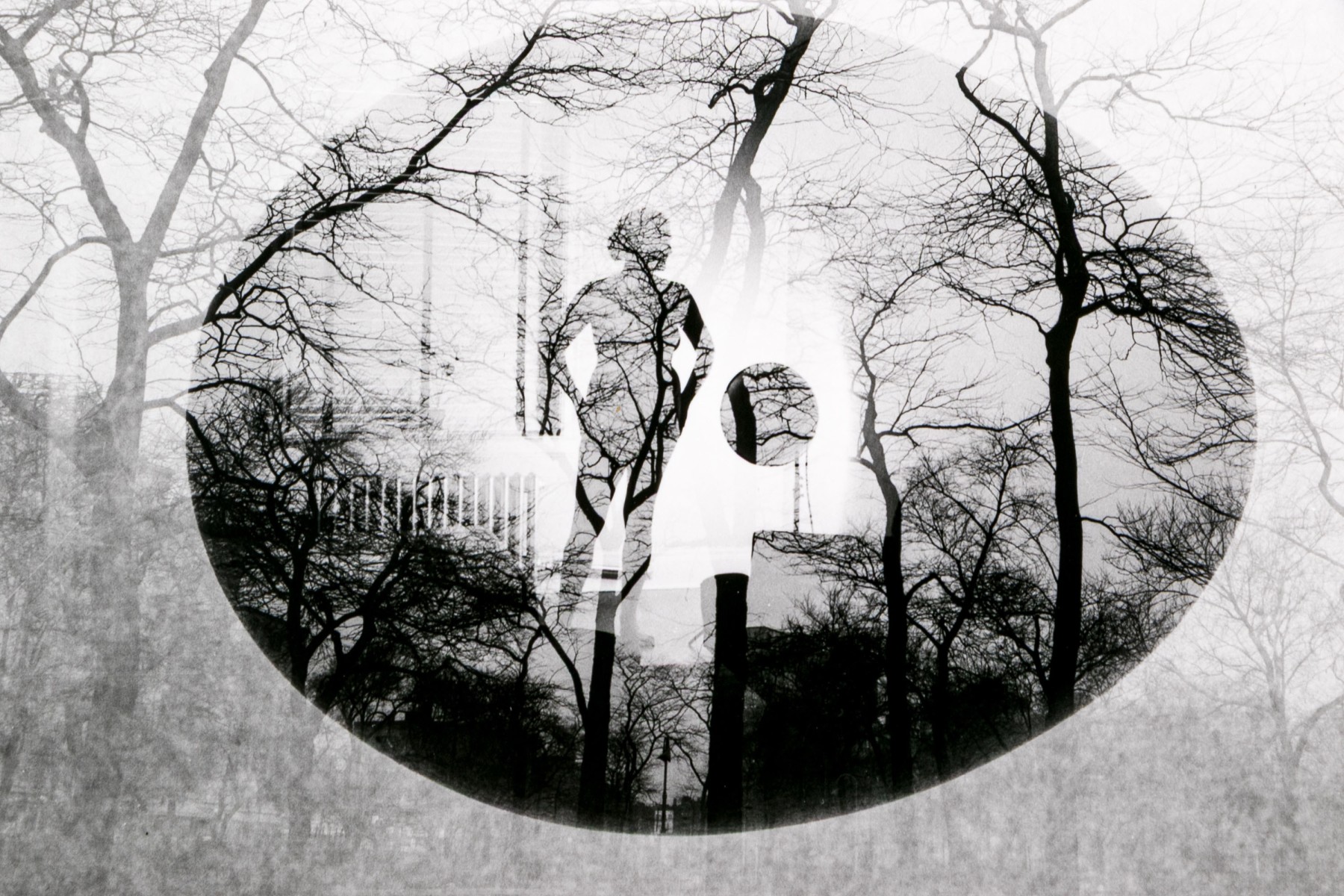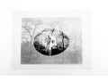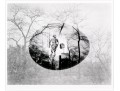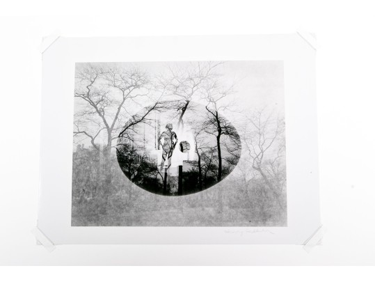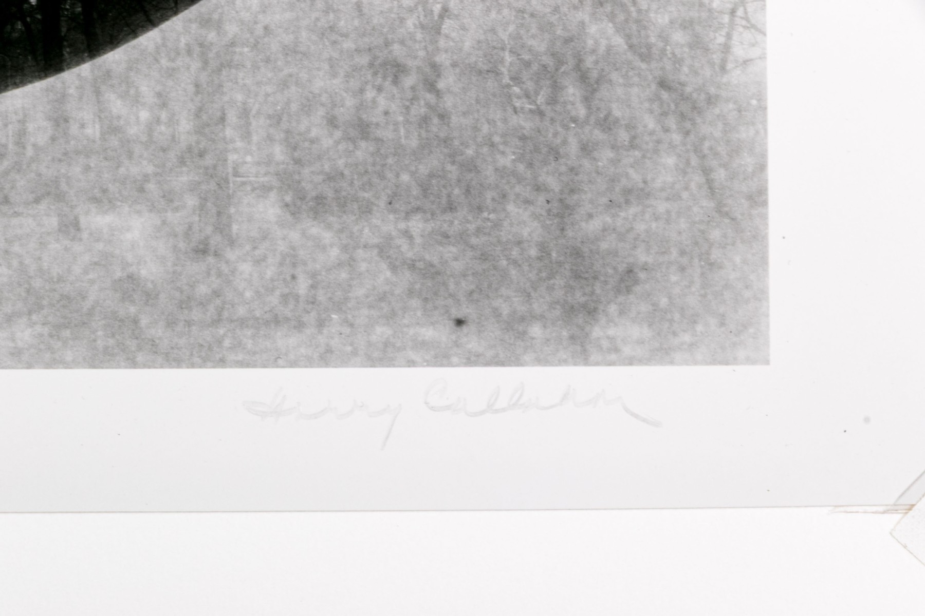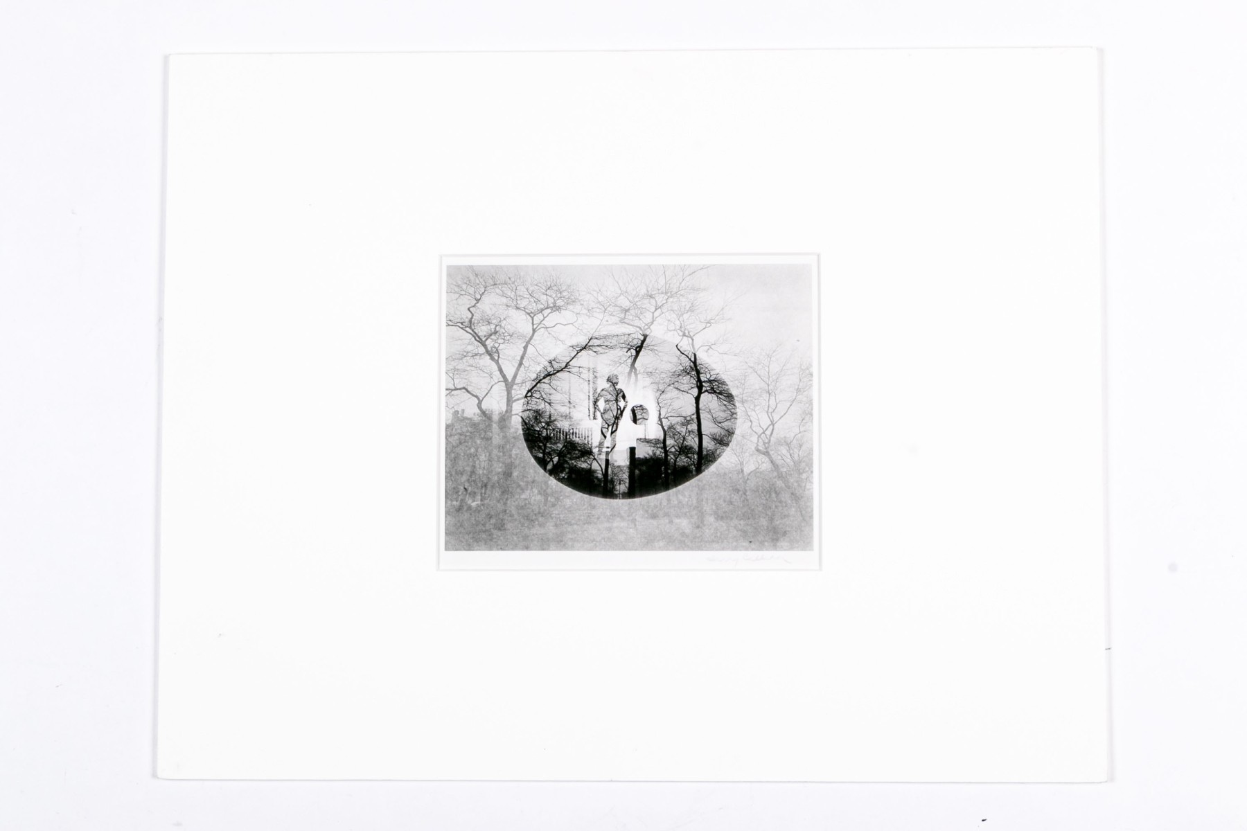 Harry Callahan (American, 1912-1999) "Eleanor, Chicago" gelatin silver print depicting the silhouette of a a female nude posed standing with hands on her hips overlaying a forested landscape with a circular window of clarity surrounded by a foggy effect. Pencil signed lower right. Bearing a label from Lallak + Tom Gallery denoting the piece as being printed later and having an original gallery price of $3,500. Unframed.