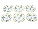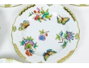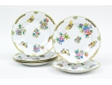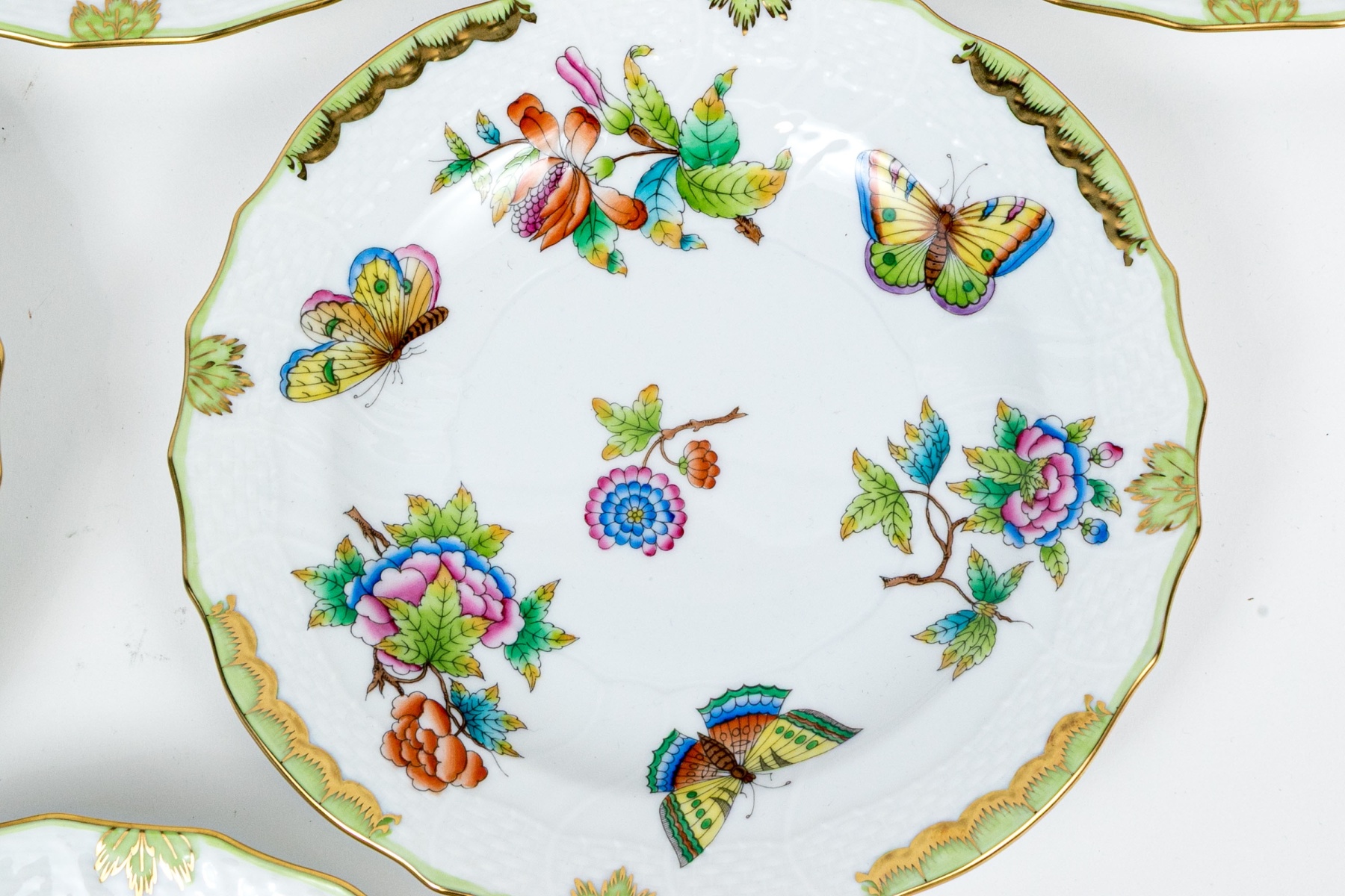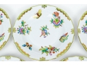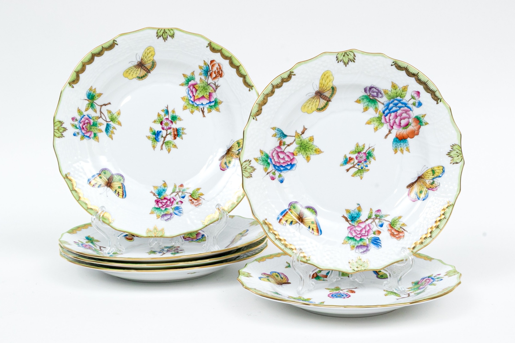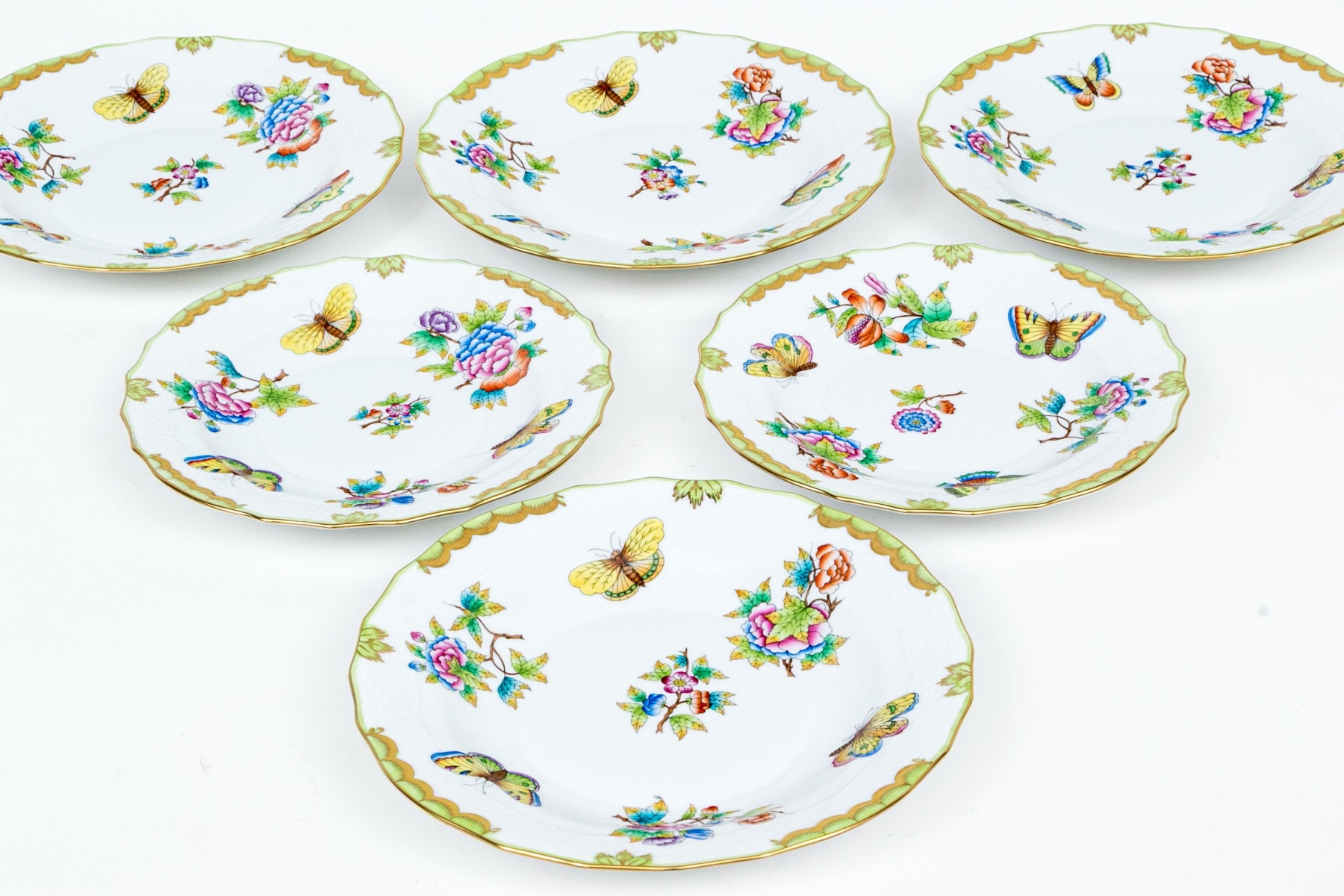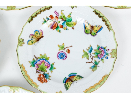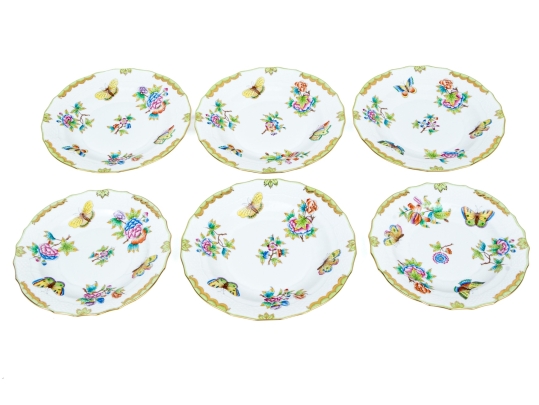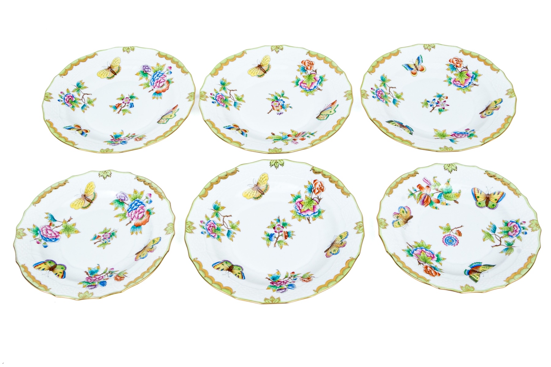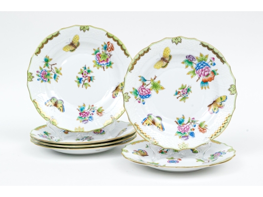 A group of six hand-painted Herend porcelain plates, each decorated in the celebrated Queen Victoria (VBO) pattern. The design features a vibrant array of multi-colored butterflies and blooming peonies, executed in Herend’s characteristic palette of vivid greens, yellows, pinks, purples, blues, and oranges.