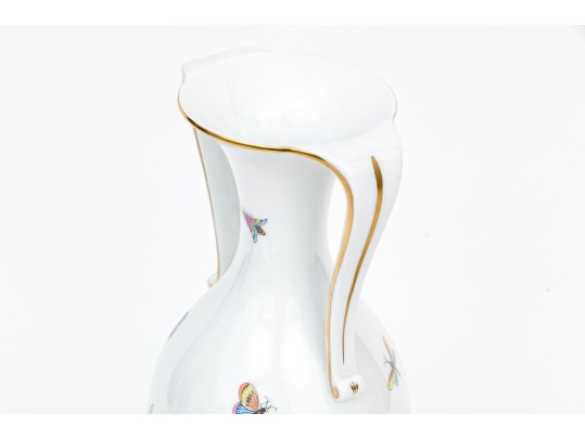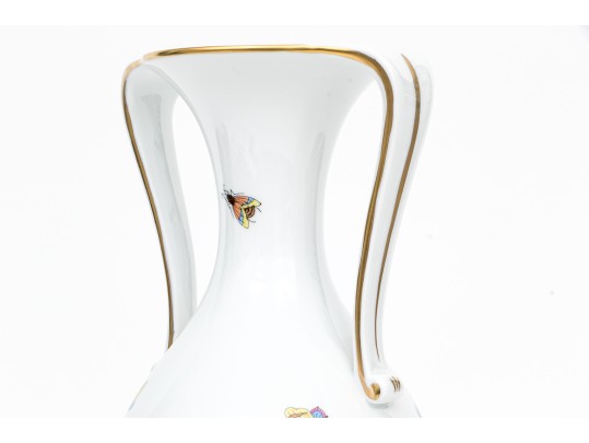 The vase’s tall, slender baluster form is enhanced by twin gilt handles and delicate 24k gold trim along the rim and base. Its hand-painted decoration depicts two detailed songbirds perched on leafy branches with necklaces, surrounded by butterflies, insects, and a dragonfly in flight. The underside bears the Herend Hungary blue shield hallmark with crossed paintbrushes, HANDPAINTED mark, and pattern code 7176/RO.