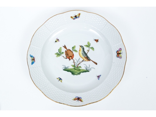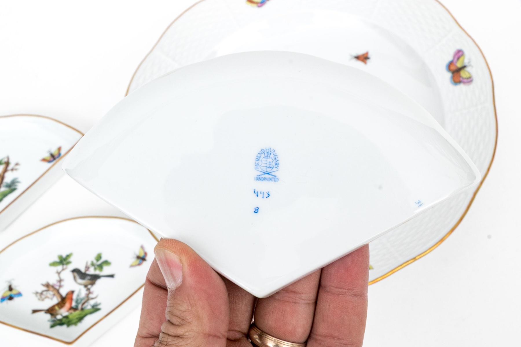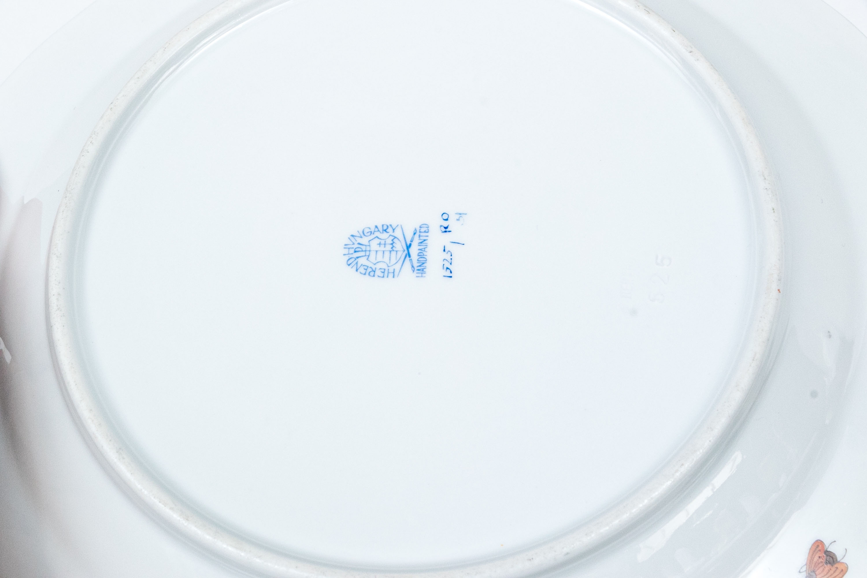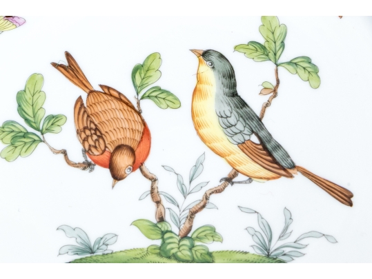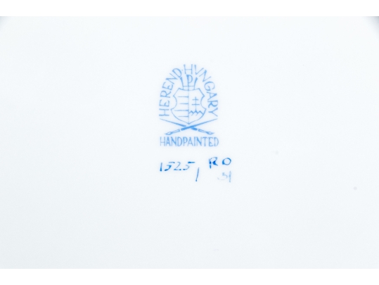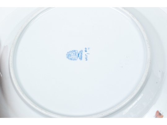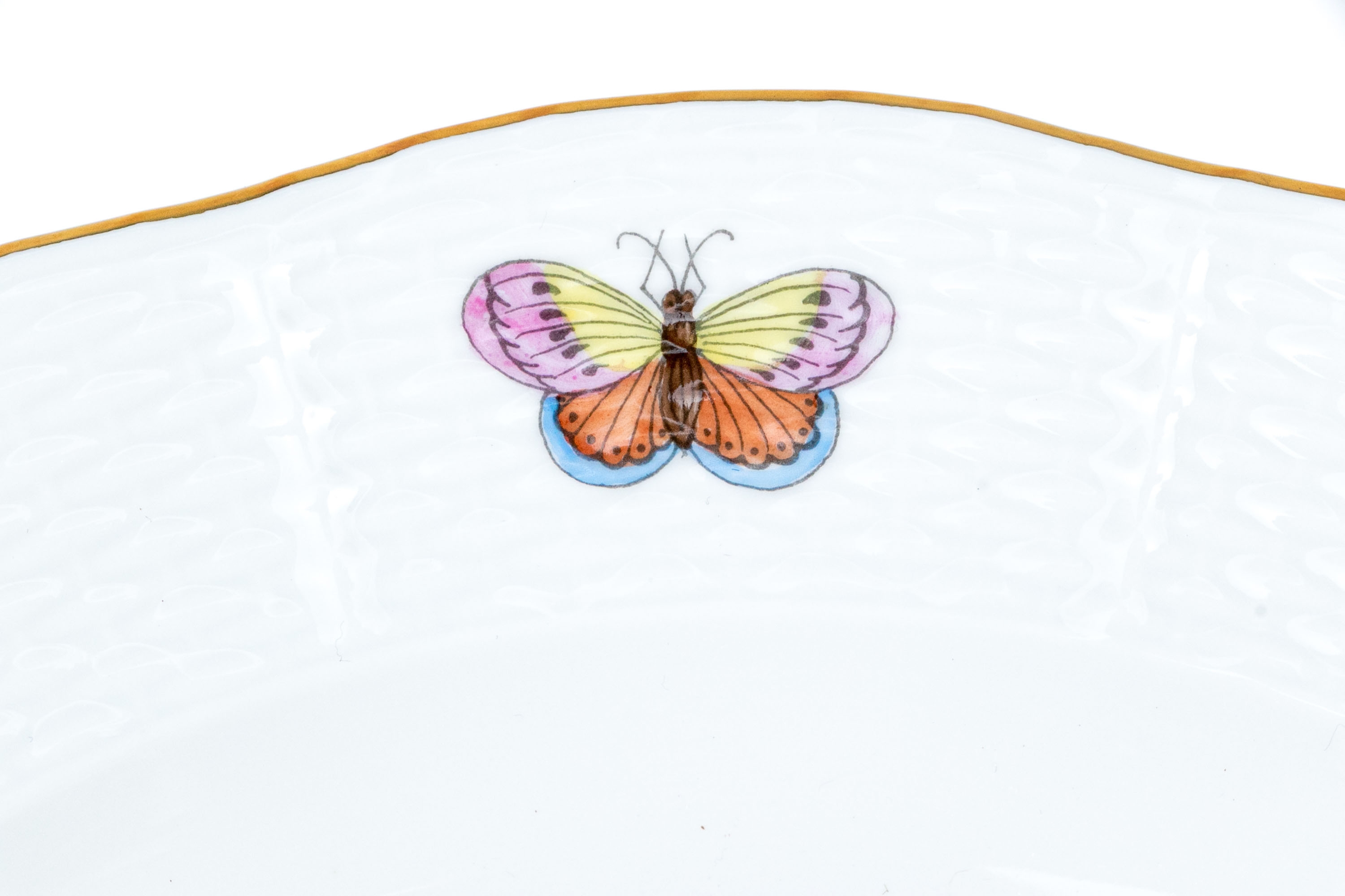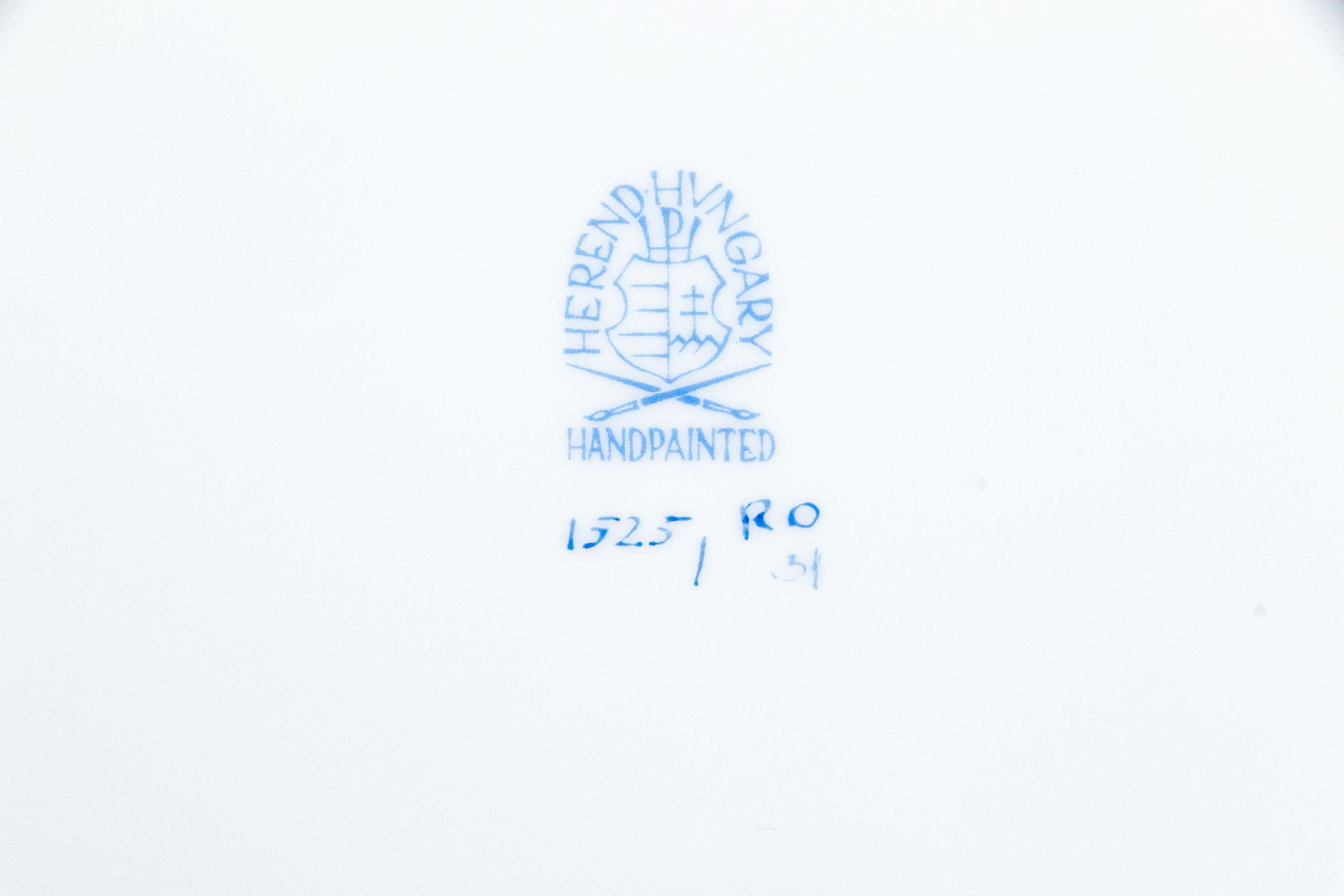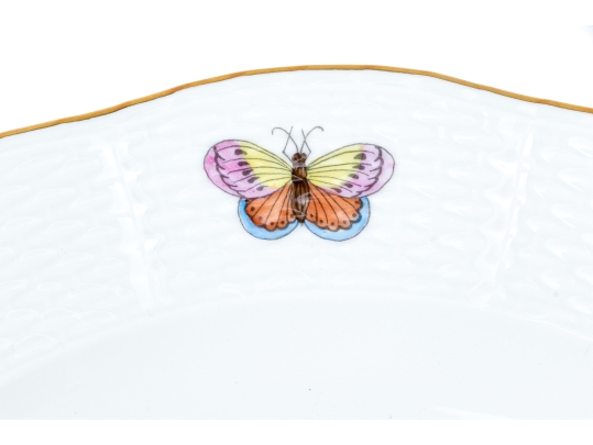 The design is accentuated with a gilded rim, intricate basketweave border relief, and brilliant enameling throughout. The underside of each piece bears the blue Herend shield mark with HANDPAINTED, and respective model numbers: