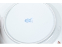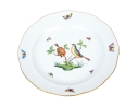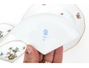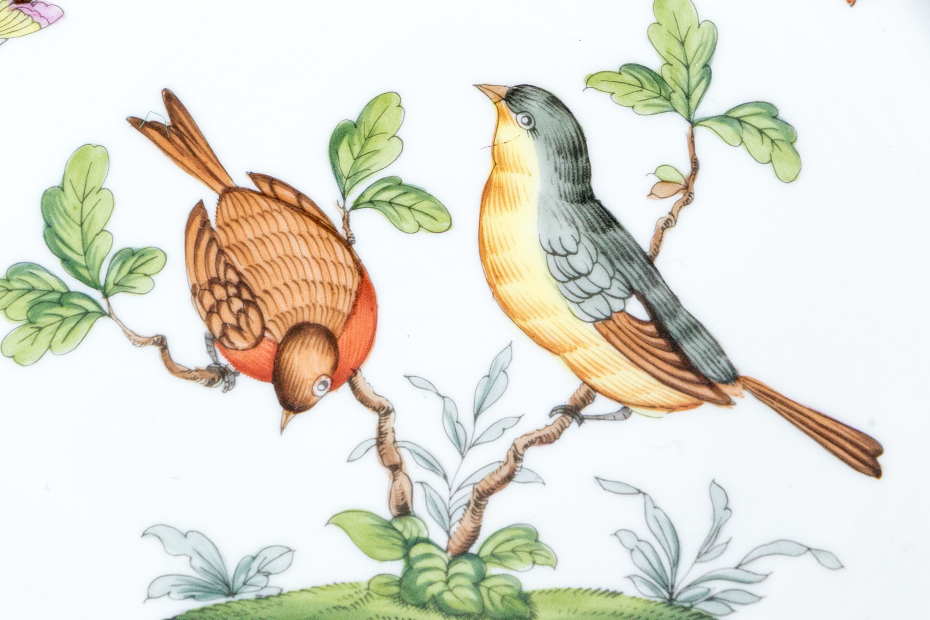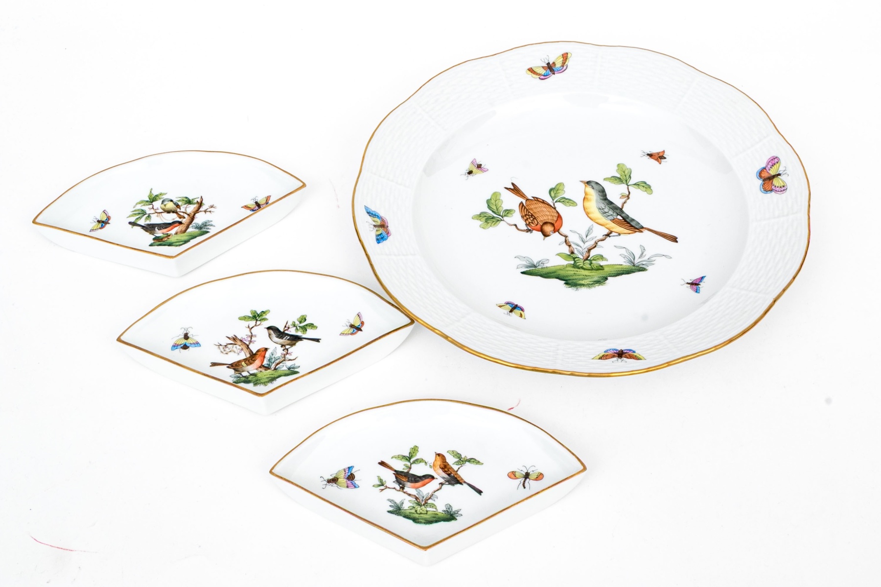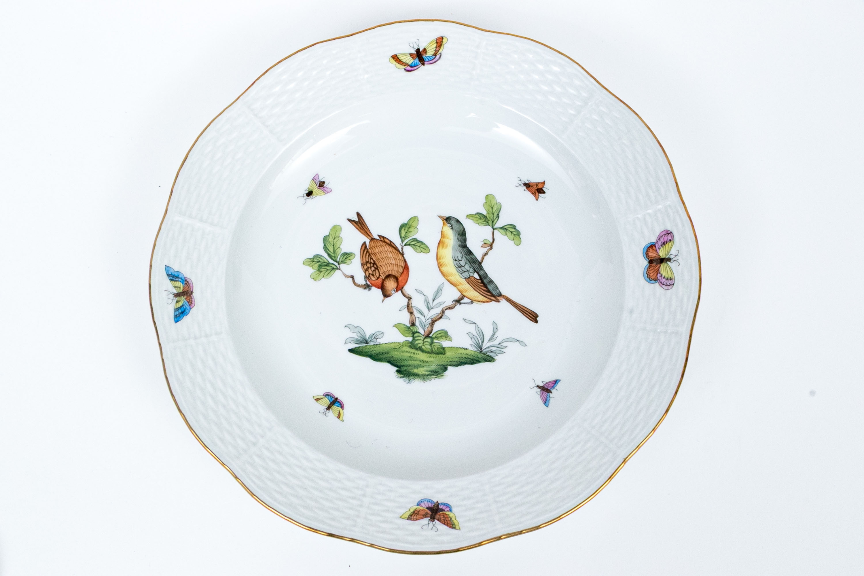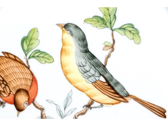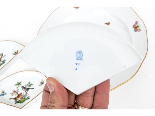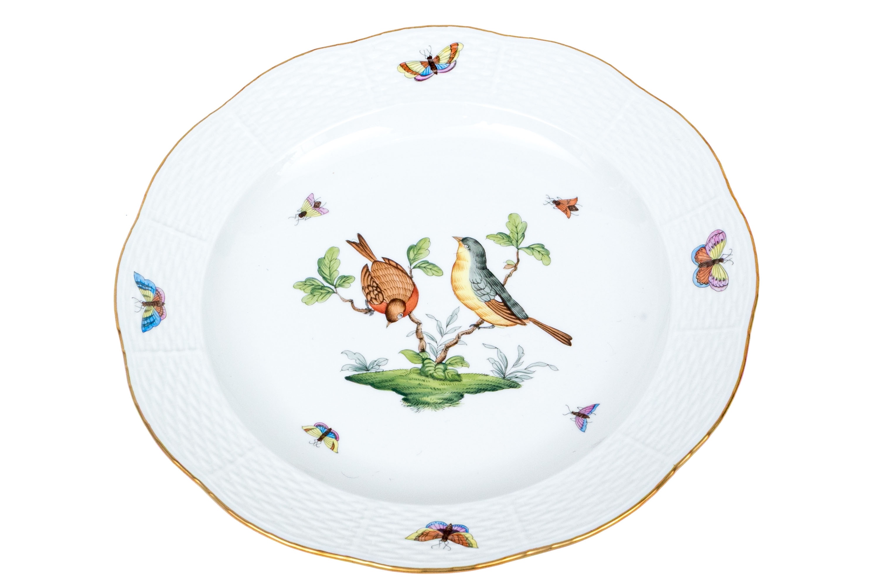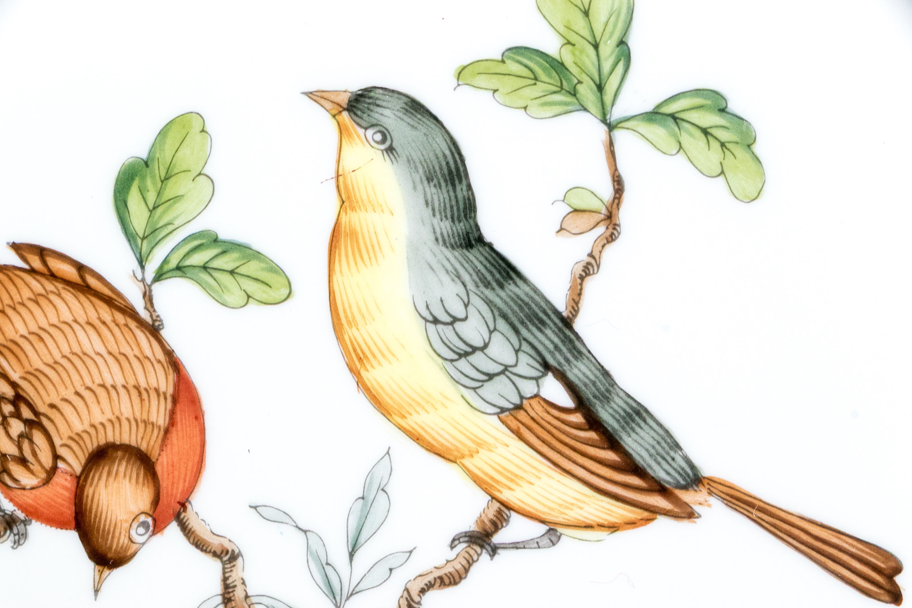 The design is accentuated with a gilded rim, intricate basketweave border relief, and brilliant enameling throughout. The underside of each piece bears the blue Herend shield mark with HANDPAINTED, and respective model numbers: