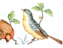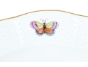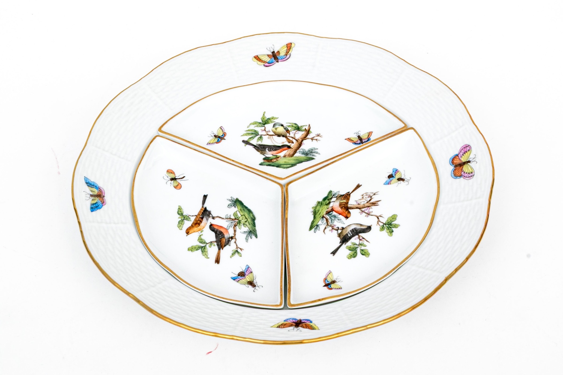 A Herend porcelain relish or divided serving dish set, comprising one central round platter and three removable fan-shaped dishes that fit perfectly within it. Each piece is exquisitely hand-painted with scenes of colorful birds perched on leafy branches, surrounded by delicate butterflies and insects.