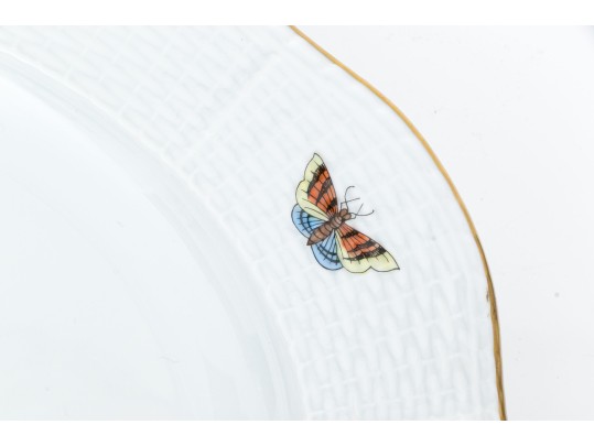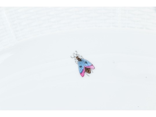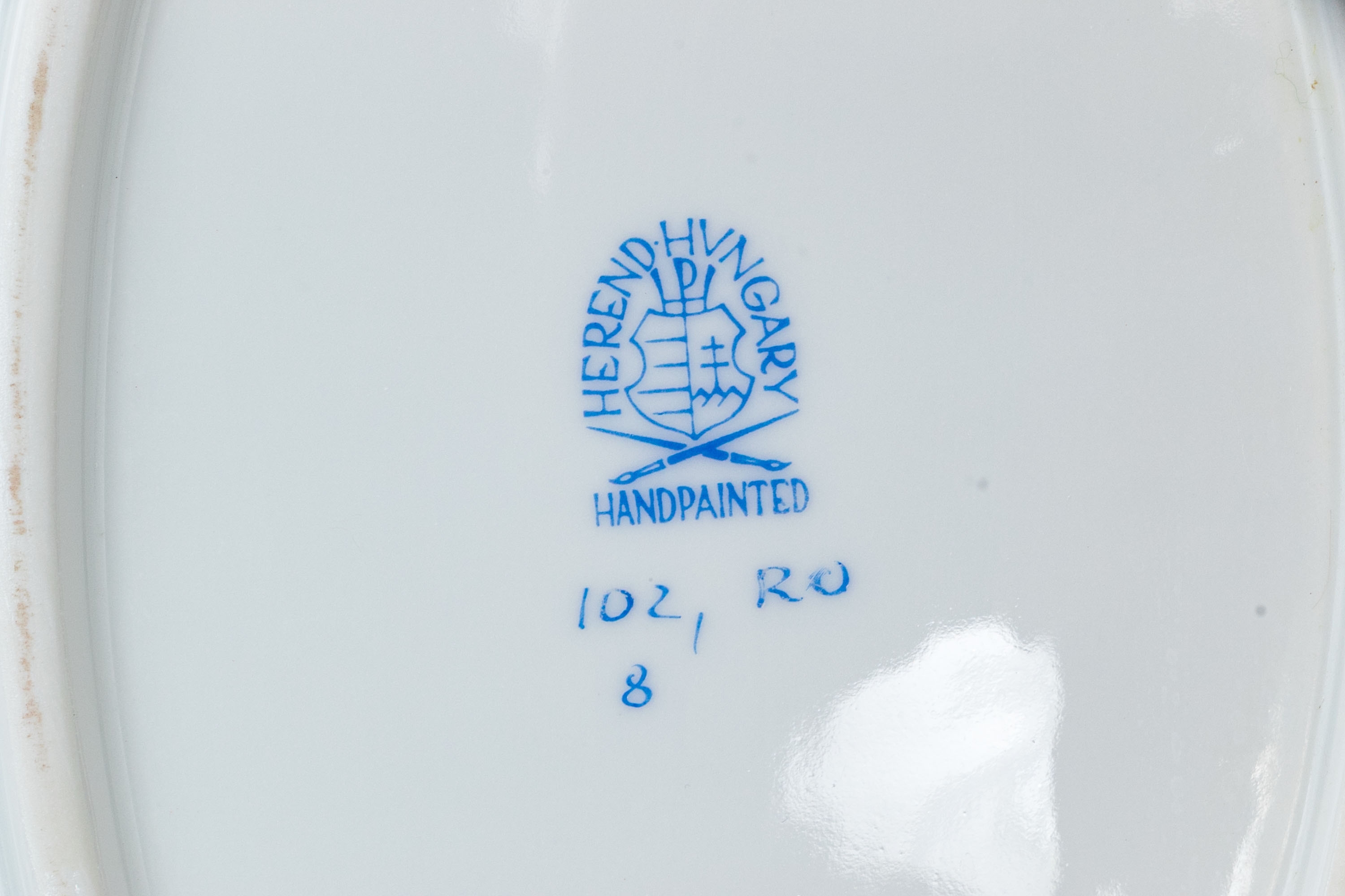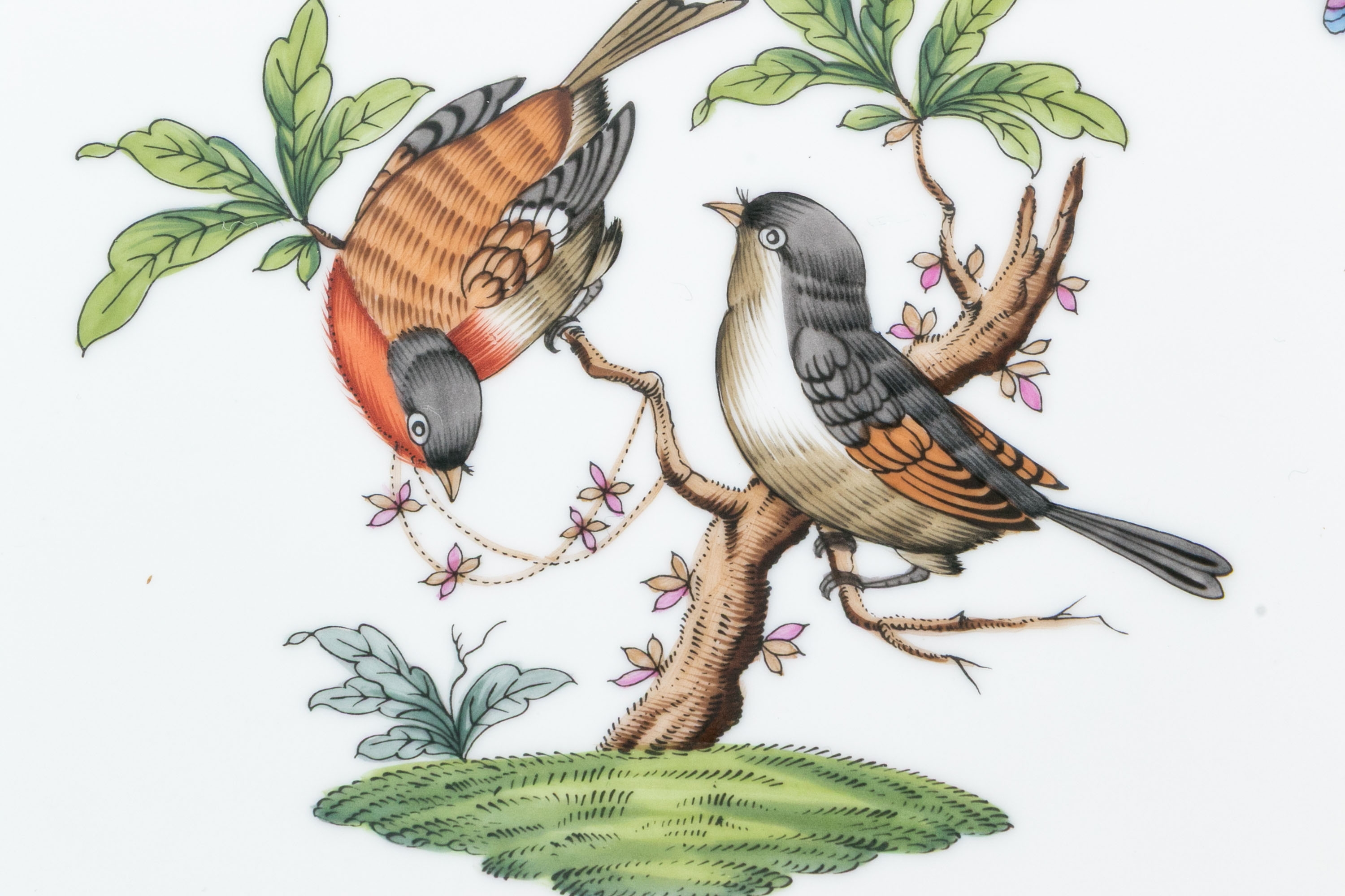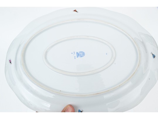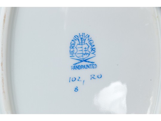 Condition: Excellent overall. The platter is free from chips, cracks, or repairs, and the glaze maintains a brilliant, smooth luster. The gilt edging shows no wear, and the hand-painted motifs remain bright, detailed, and crisp. Only minor, expected base wear is visible on the foot ring from shelf contact. The base is clean and well-marked, with a clear and sharp Herend factory stamp and impressed model number. The foot rim retains a clean ivory tone with only light, superficial scuffing consistent with careful display.