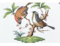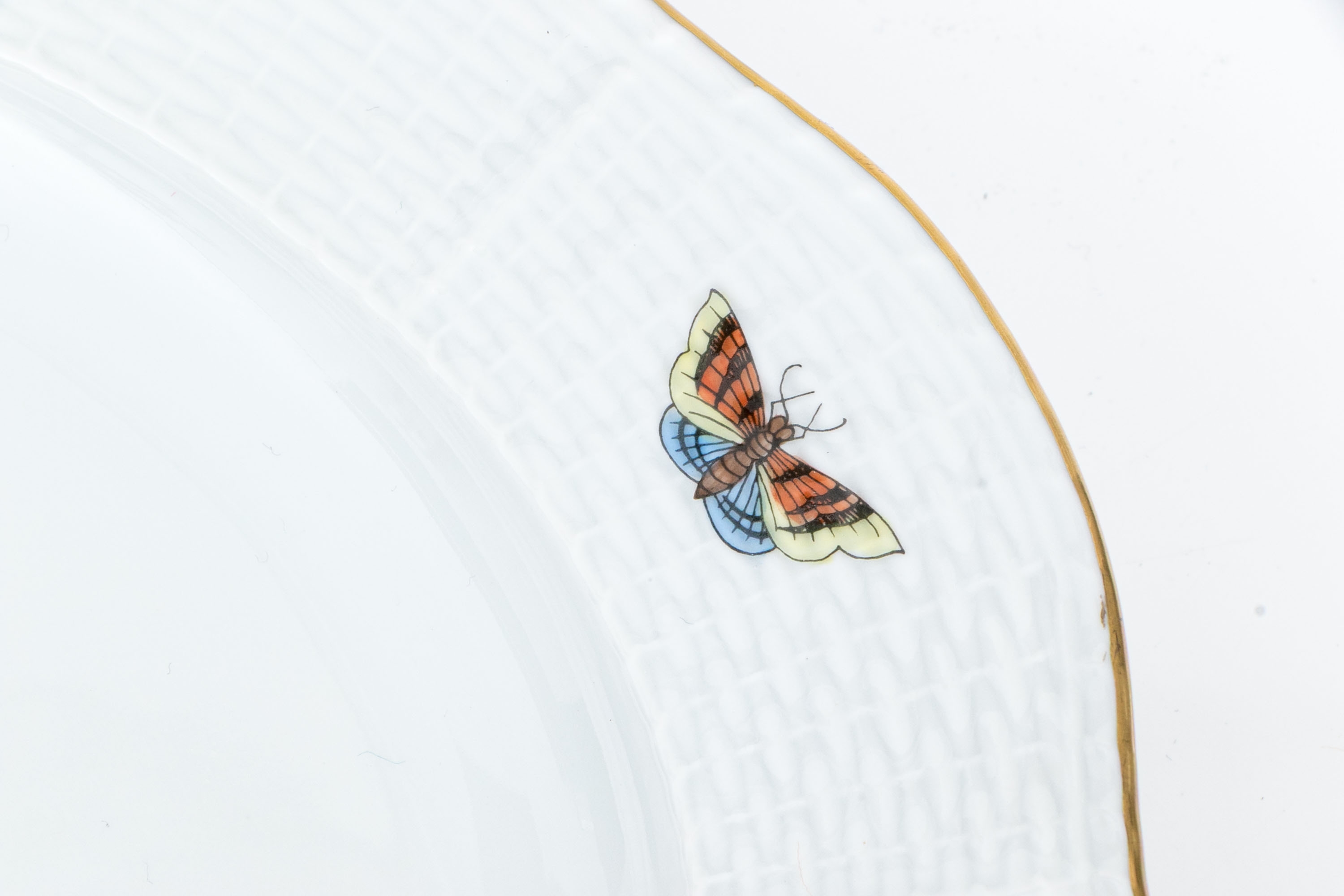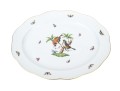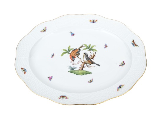Herend Hungary hand-painted porcelain oval platter, featuring the Rothschild Bird (RO) pattern with 24K gold edging. The platter showcases Herend’s classic osier (basketweave) relief border and a gently scalloped rim trimmed in gleaming gold. At its center, two vividly painted songbirds perch gracefully on a leafy branch above a grassy mound with necklace. Surrounding the scene, a flutter of multicolored butterflies and insects adds to the design. On the underside, the Herend Hungary blue shield hallmark with crossed paintbrushes appears, inscribed HANDPAINTED and numbered 102/RO.