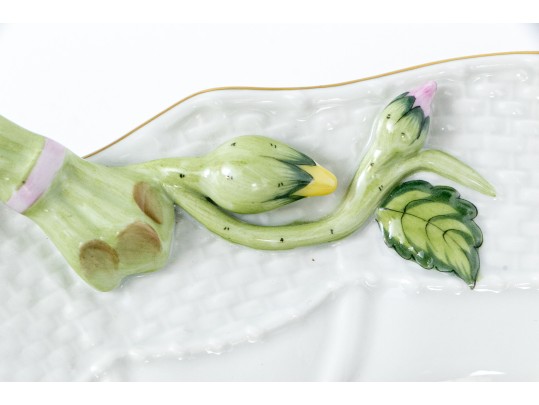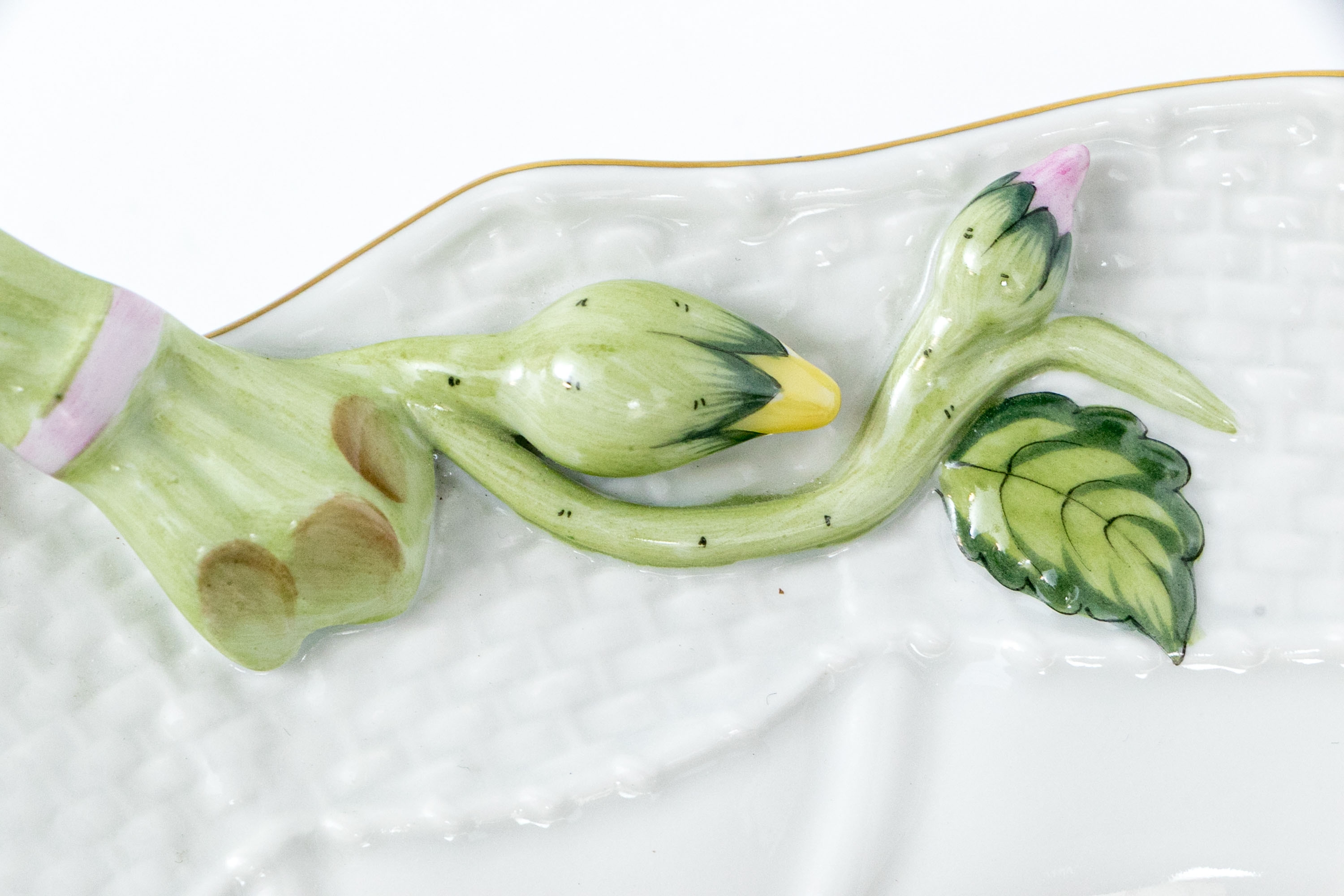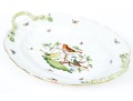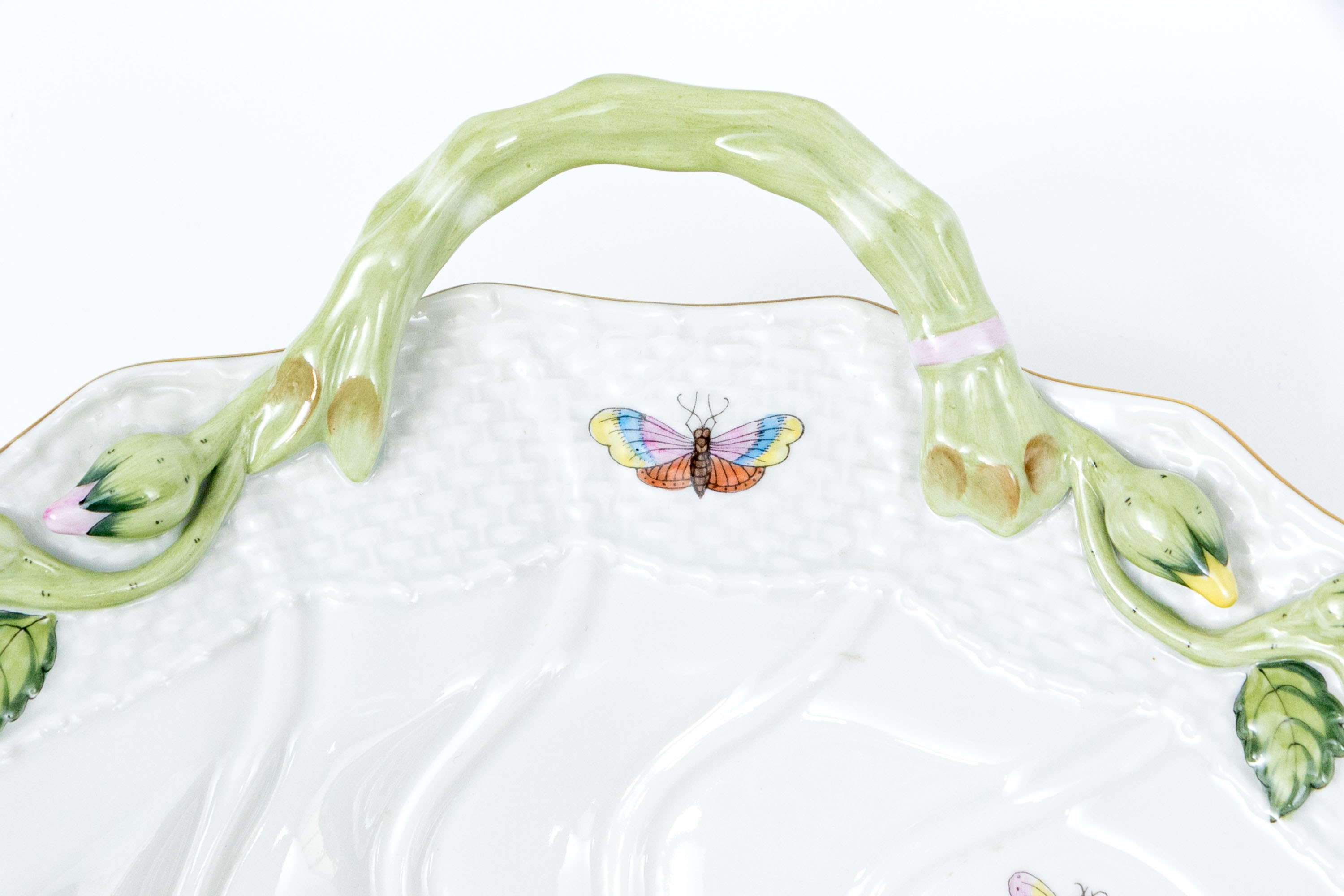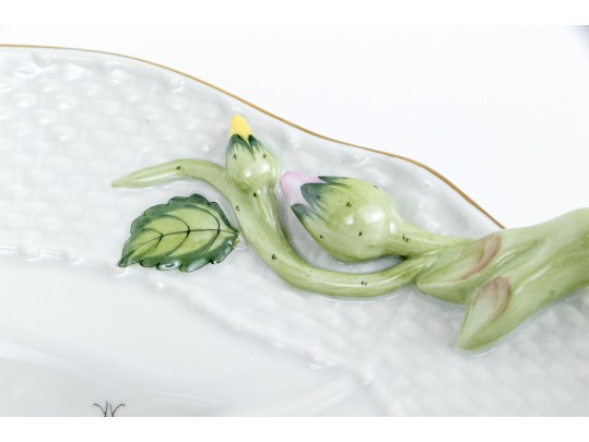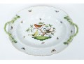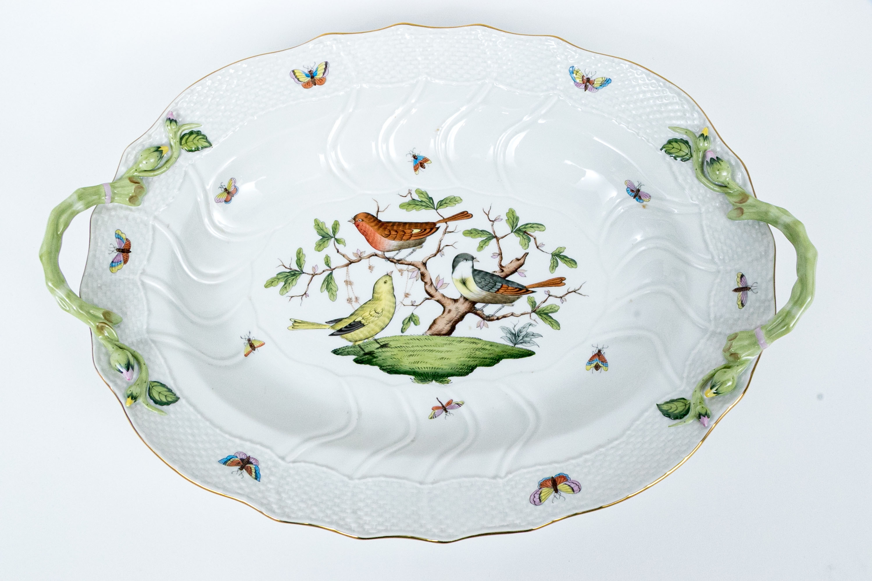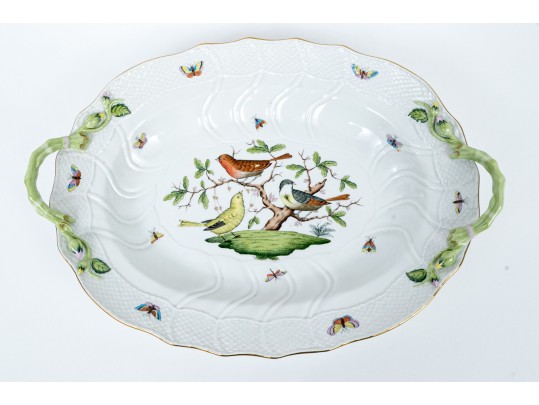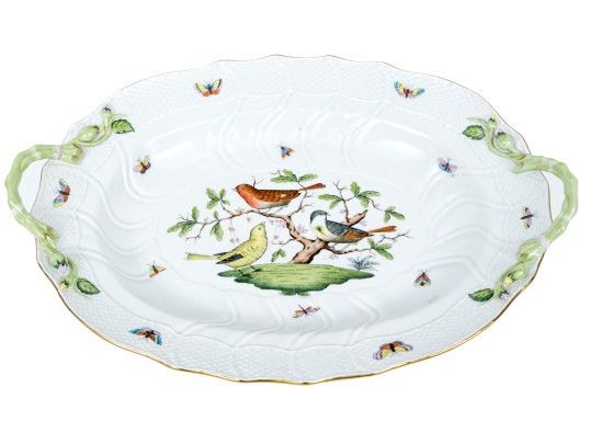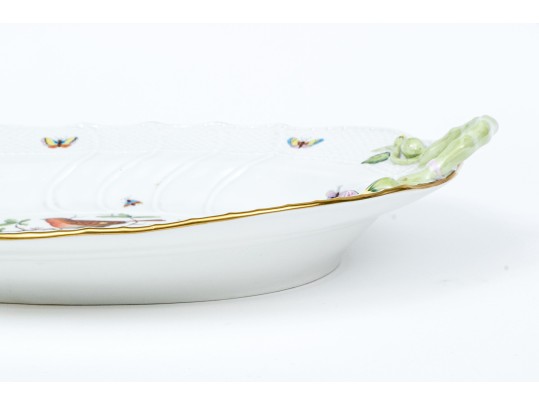 Herend Hungary hand-painted porcelain oval serving dish featuring the Rothschild Bird (RO) pattern with applied floral handles and 24K gold trim. This elegant handled dish is crafted in Herend’s signature osier (basketweave) molded pattern, with scalloped edges and delicate green branch-form handles adorned with bud and leaf appliqués at each end. The dish is richly decorated with Herend’s iconic Rothschild Bird scene at center, depicting three finely detailed songbirds perched on leafy branches with necklace, surrounded by colorful butterflies, beetles, and insects—each one uniquely hand-painted in vivid enamel hues. The design is framed with a softly fluted interior and finished with a hand-applied gold rim. The underside bears the Herend Hungary blue shield hallmark with crossed paintbrushes, HANDPAINTED, and pattern number 1125/RO.