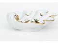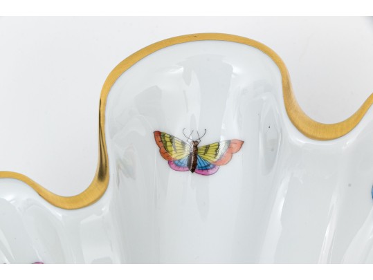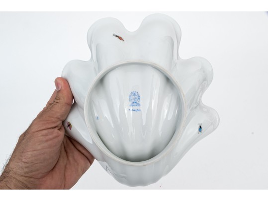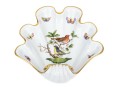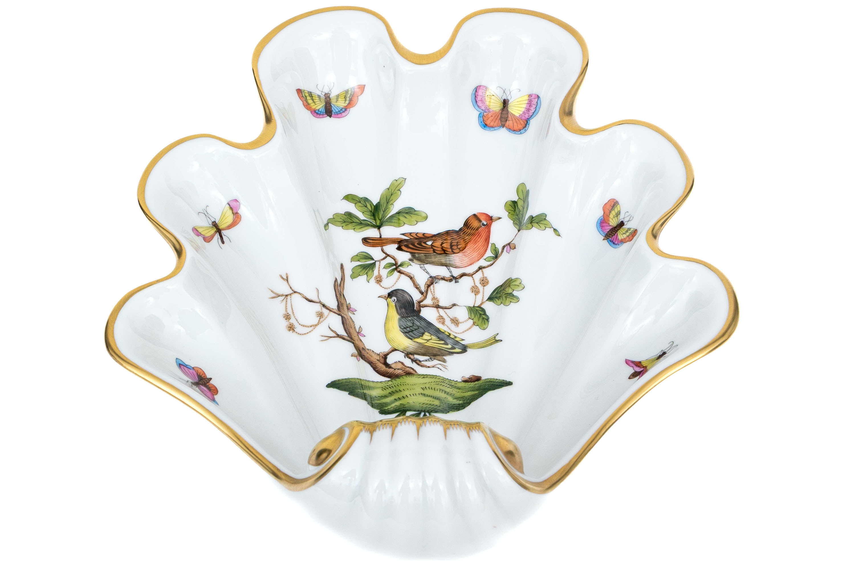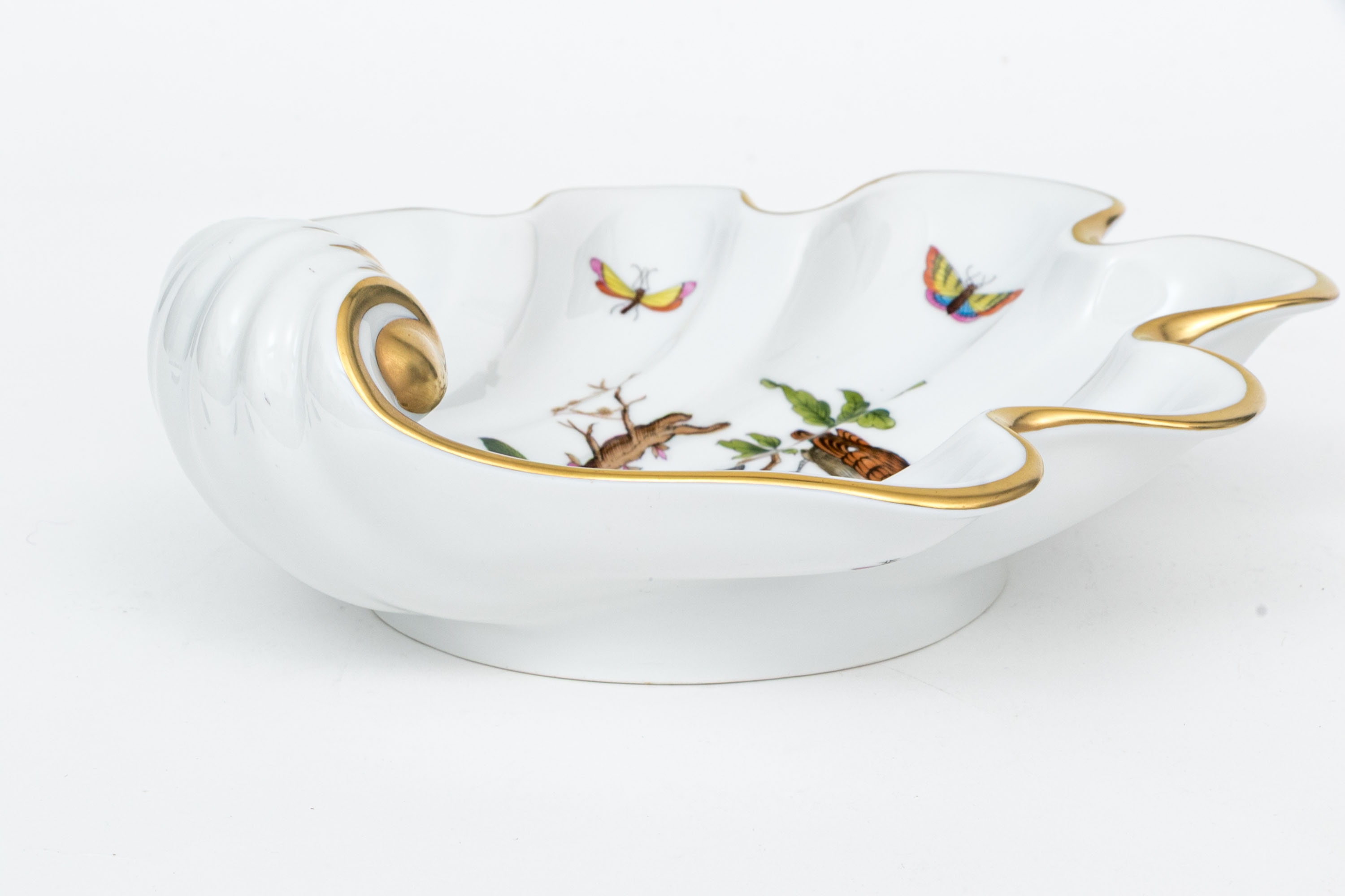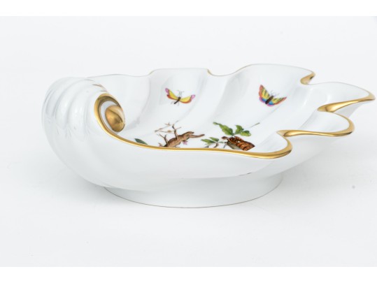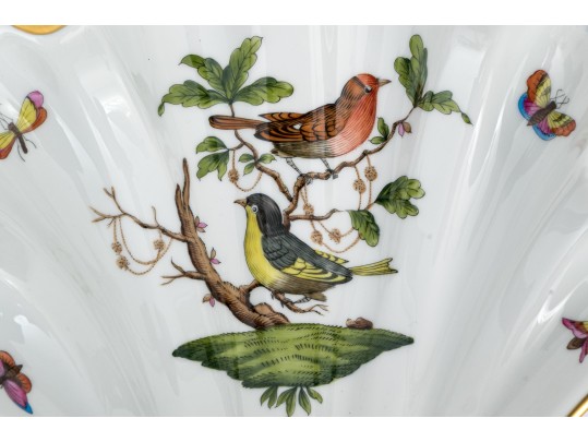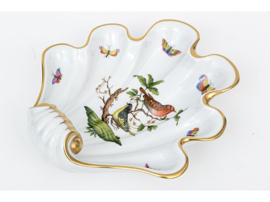 Herend Hungary hand-painted porcelain shell-form dish, featuring the Rothschild Bird (RO) pattern with 24K gold accents. The piece is formed in a scalloped, fan-like shell shape, its flowing curves highlighted by a continuous gilded rim. At the center, a beautifully detailed hand-painted vignette depicts two colorful songbirds perched on a flowering branch with two necklaces, surrounded by delicate butterflies and winged insects, rendered in bright, multicolored enamels. The piece’s underside bears the Herend Hungary blue shield hallmark with crossed paintbrushes, inscribed HANDPAINTED and marked 7444/RO.