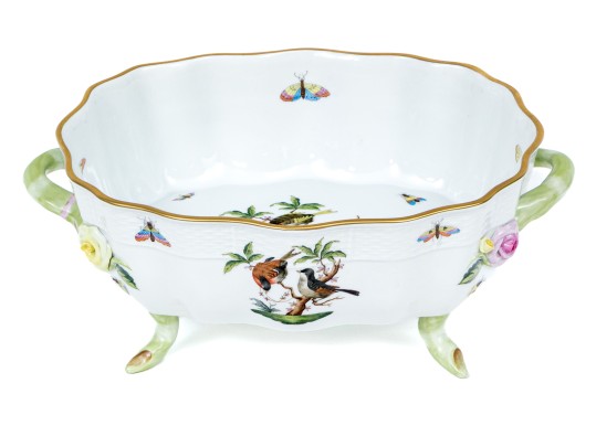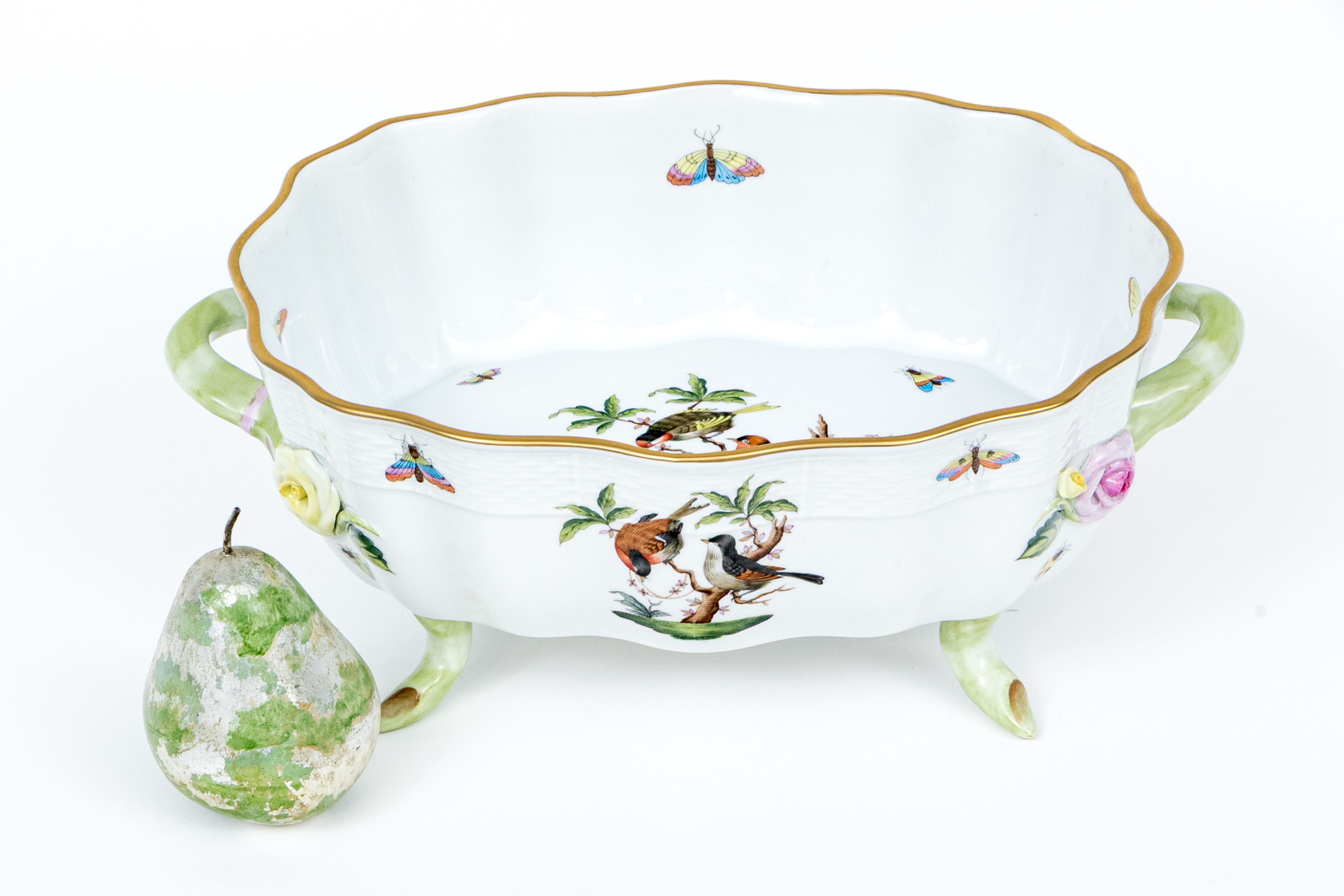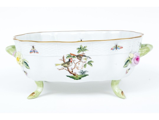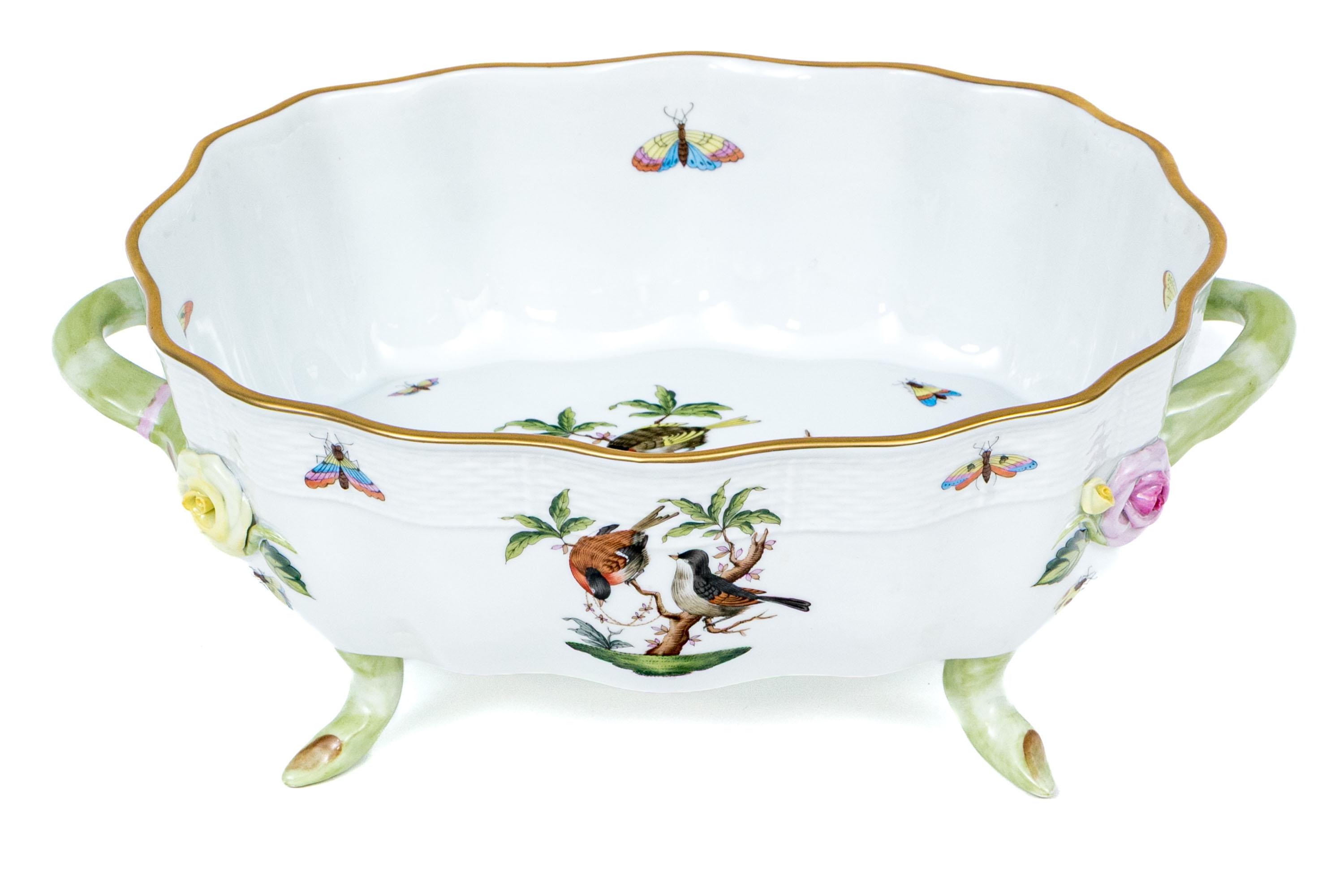 Herend centerpiece bowl is hand-painted in the classic Rothschild Bird (RO) pattern. The pattern, rich with naturalistic detail, depicts pairs of songbirds perched amid leafy branches with necklace, framed by fluttering butterflies and insects painted in delicate pastel hues. The bowl’s scalloped rim is highlighted with hand-applied 24K gilt trim, and the body is accented by applied porcelain roses and leafy handles in soft green tones. The bowl rests on three branch-like legs, each delicately shaded to suggest natural wood and foliage. The underside bears the blue Herend Hungary shield hallmark, inscribed HEREND HUNGARY HANDPAINTED with model number 7653/RO.