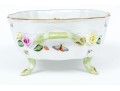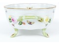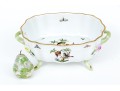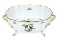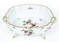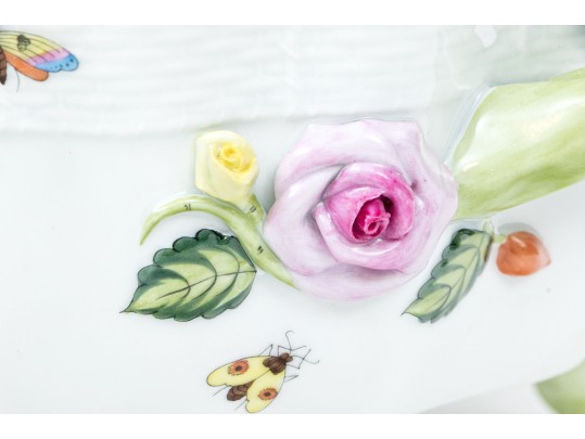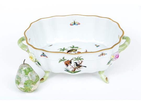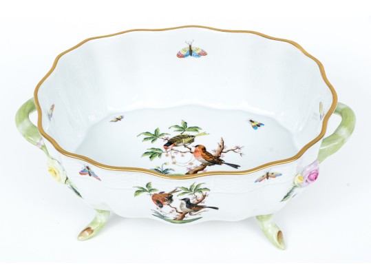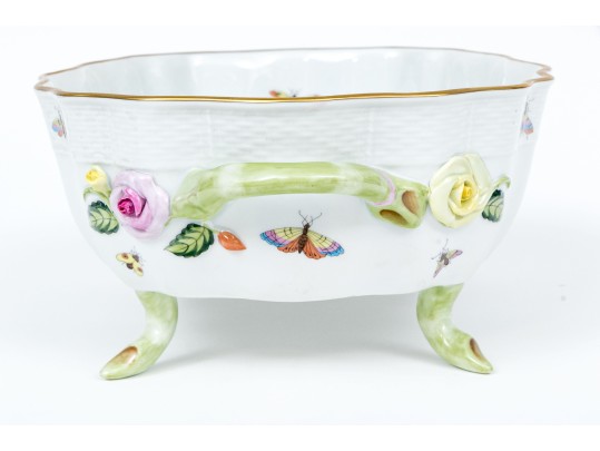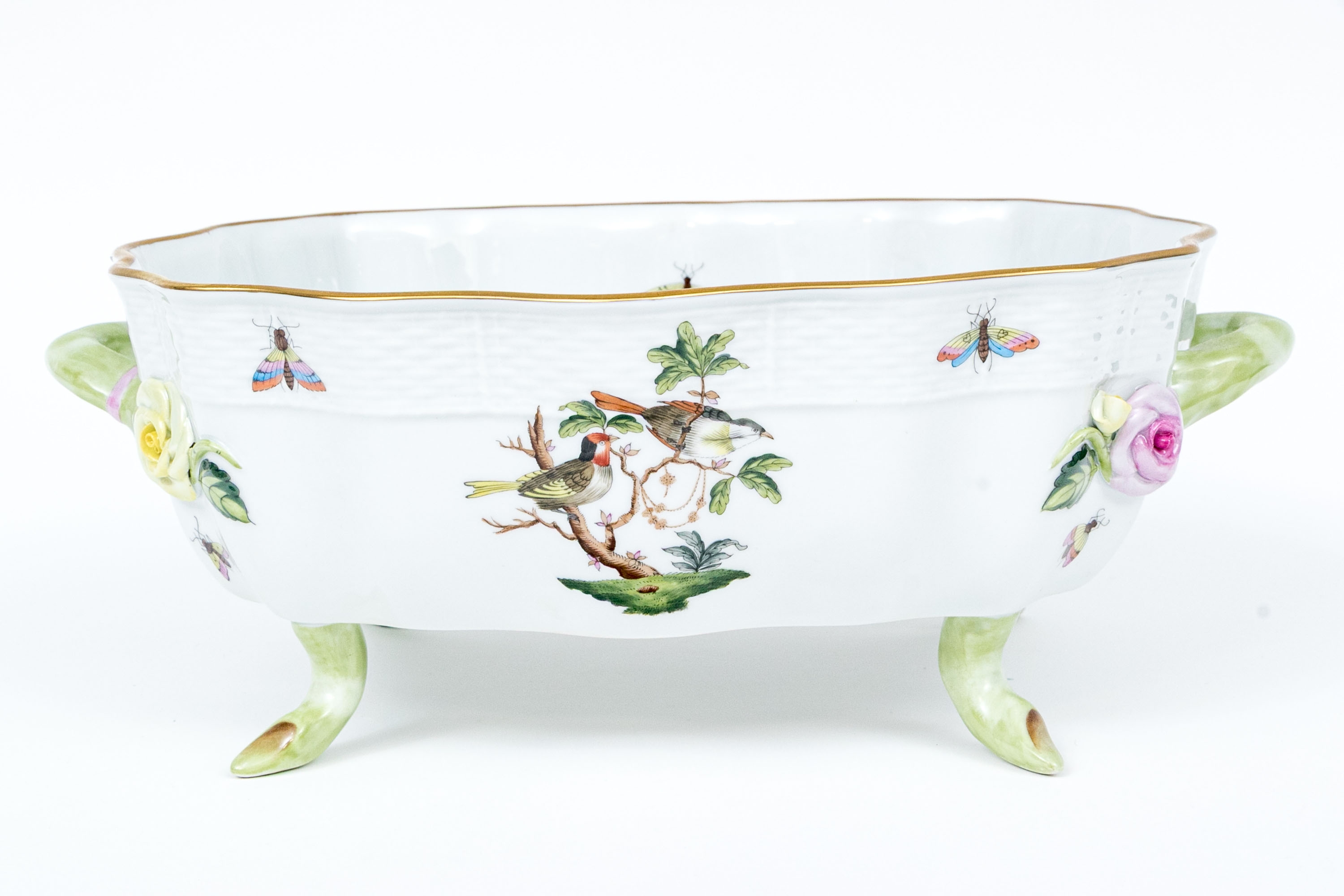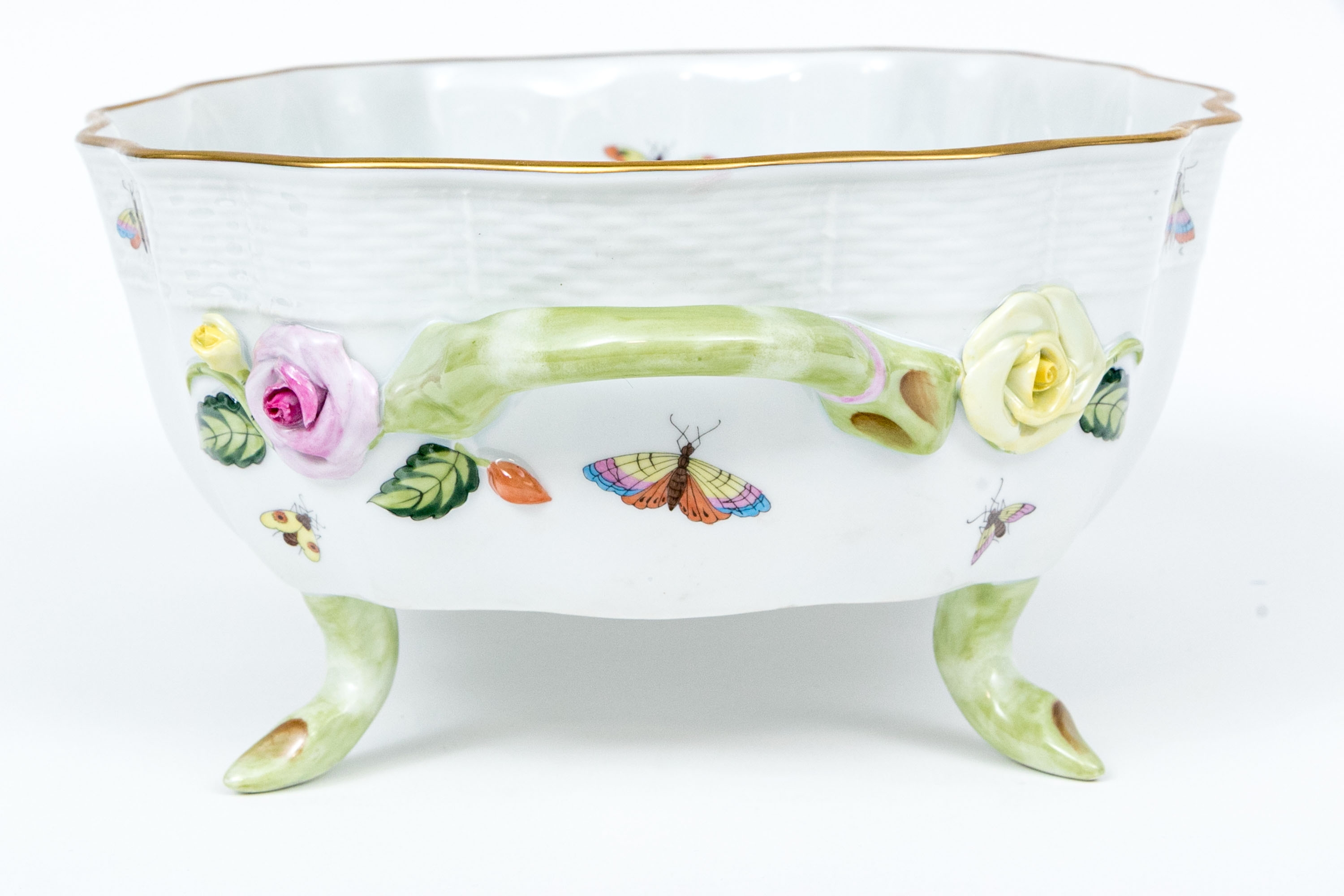 Herend centerpiece bowl is hand-painted in the classic Rothschild Bird (RO) pattern. The pattern, rich with naturalistic detail, depicts pairs of songbirds perched amid leafy branches with necklace, framed by fluttering butterflies and insects painted in delicate pastel hues. The bowl’s scalloped rim is highlighted with hand-applied 24K gilt trim, and the body is accented by applied porcelain roses and leafy handles in soft green tones. The bowl rests on three branch-like legs, each delicately shaded to suggest natural wood and foliage. The underside bears the blue Herend Hungary shield hallmark, inscribed HEREND HUNGARY HANDPAINTED with model number 7653/RO.