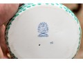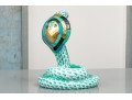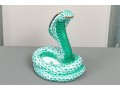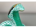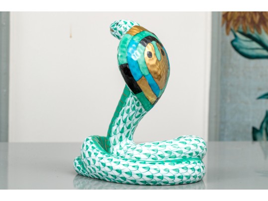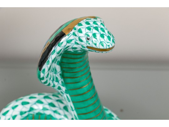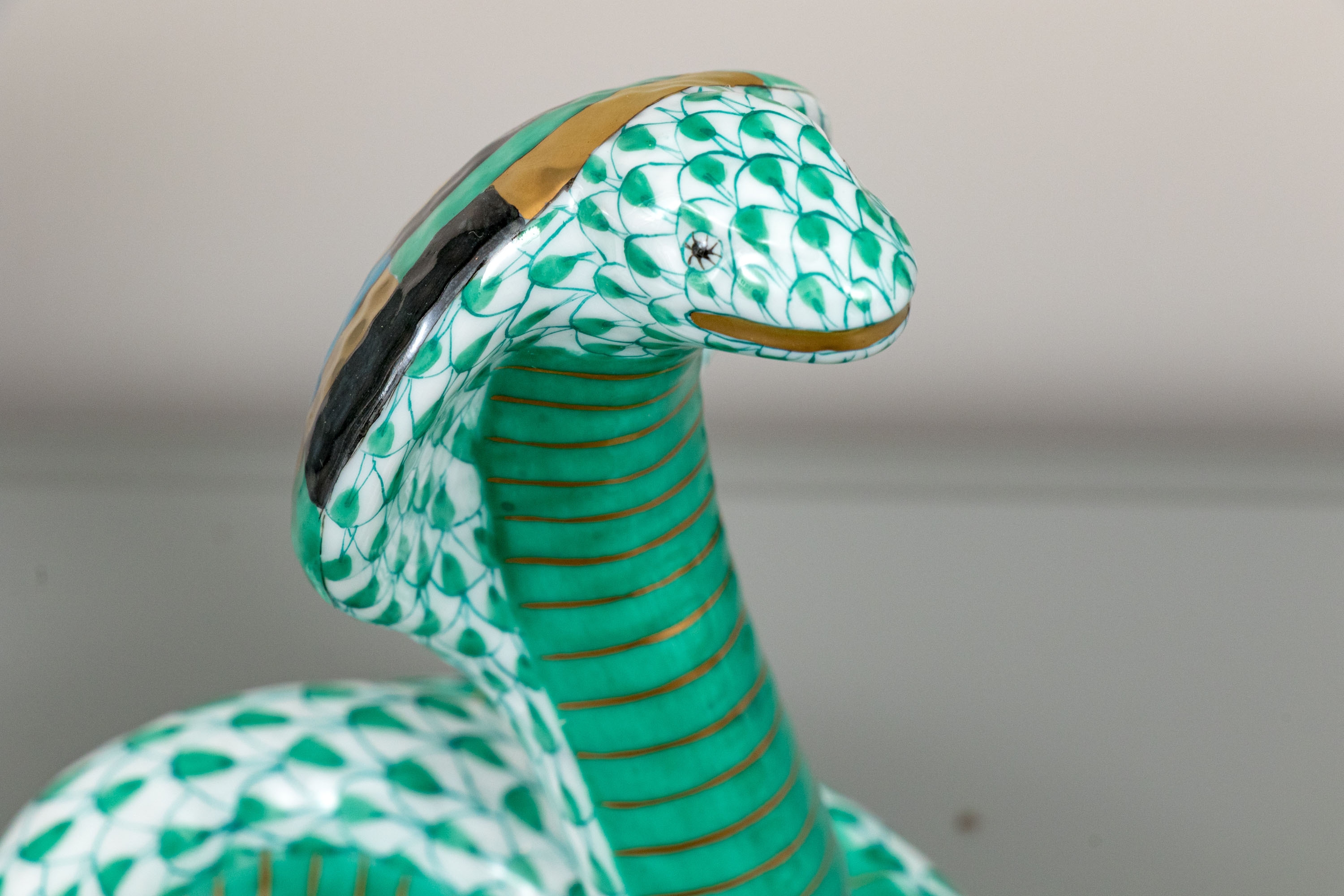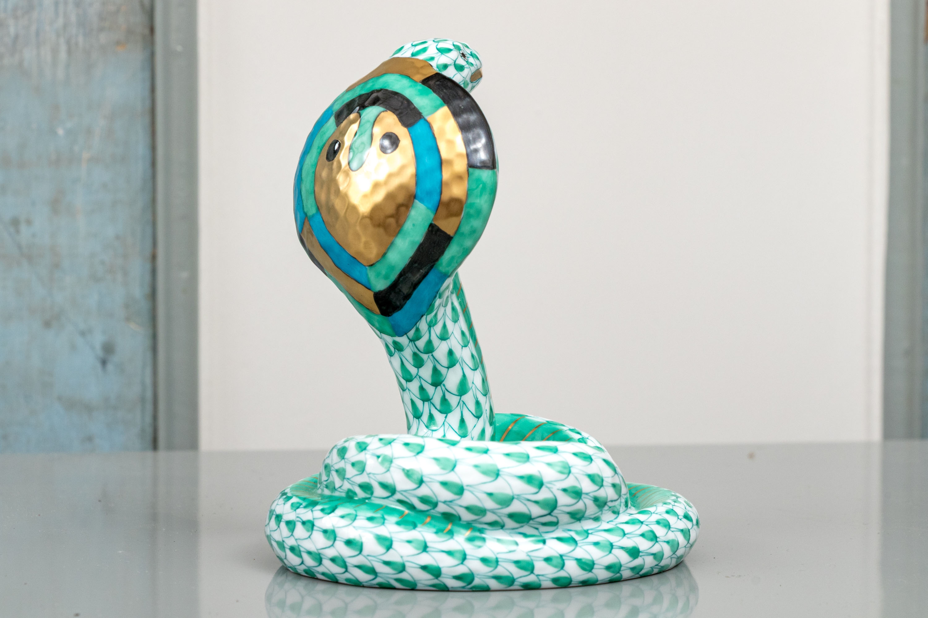 Herend Hungary hand-painted porcelain cobra, exquisitely modeled in the brand’s signature green fishnet (VHV) pattern with 24K gold embellishments. The coiled serpent is poised in a classic striking stance, its hood fully flared and meticulously detailed with bold concentric turquoise, black, and gold rings..The cobra’s scales shimmer in shades of emerald green over pure white porcelain, with gold accents highlighting its sinuous form. Its gilded eyes, fangs, and tongue add an element of intensity to this exceptional sculptural figure. The underside bears the Herend Hungary blue shield and crossed paintbrush hallmark, inscribed Handpainted and numbered possibly 5588, with impressed factory marks and painter’s code 278.