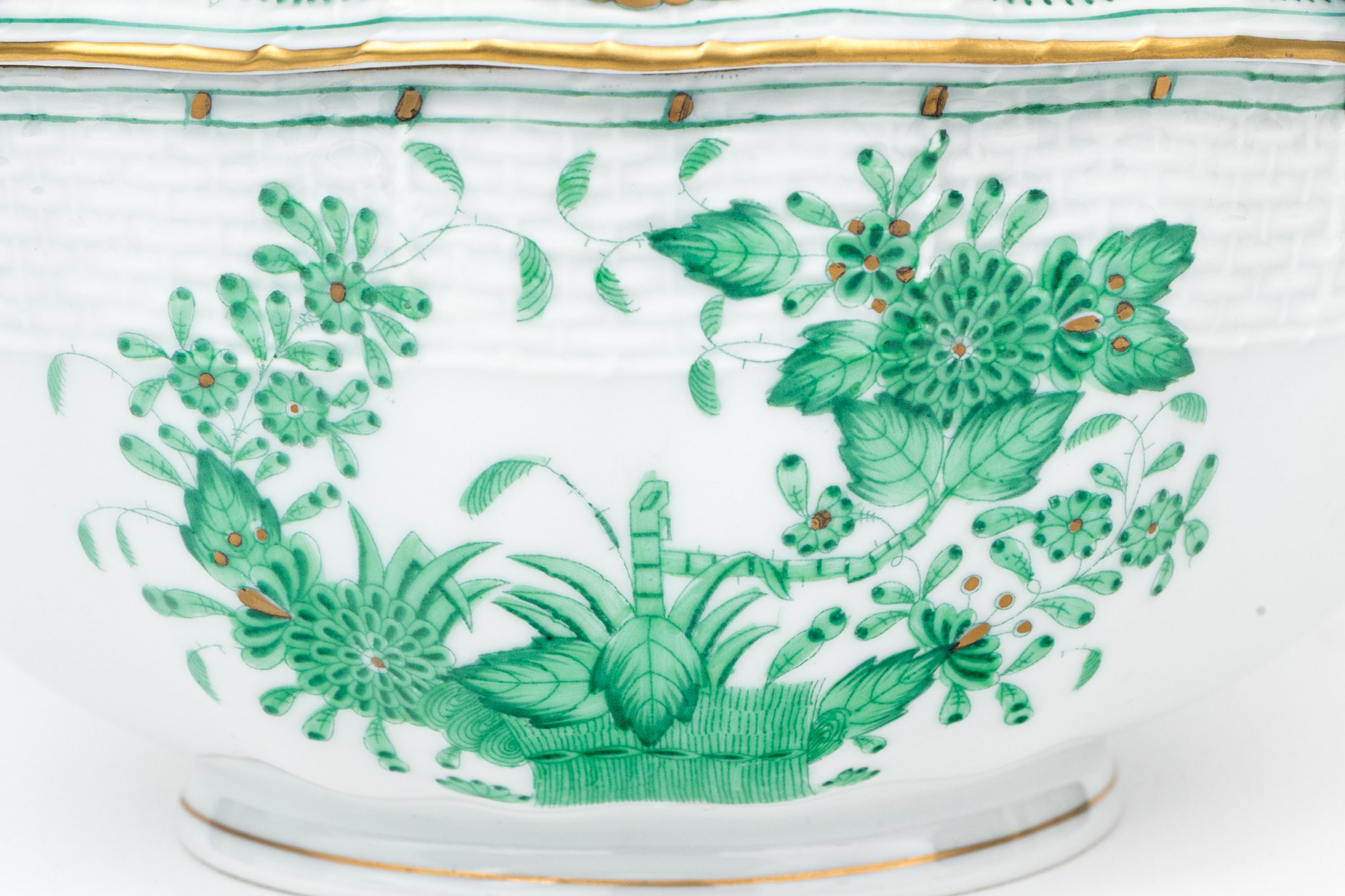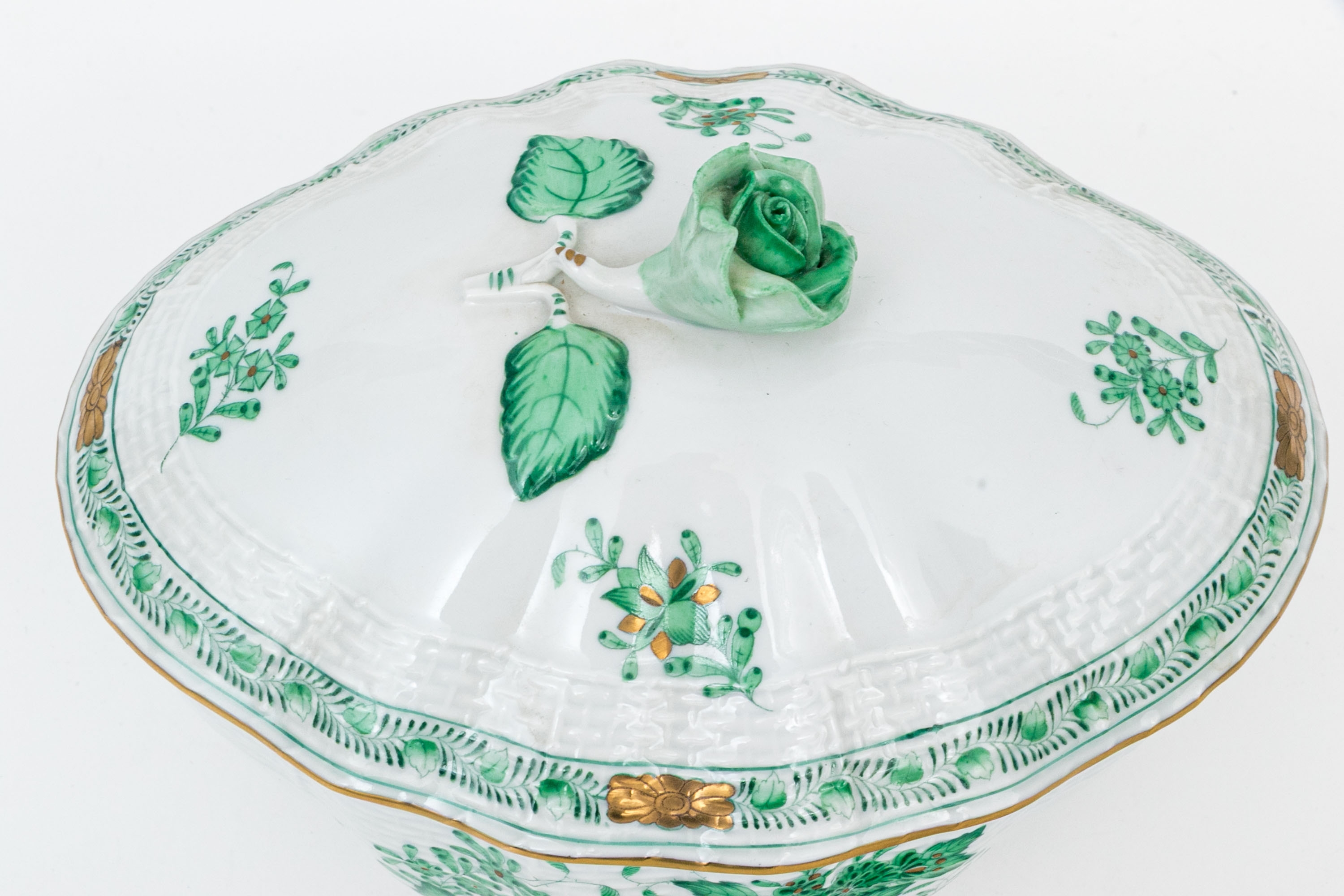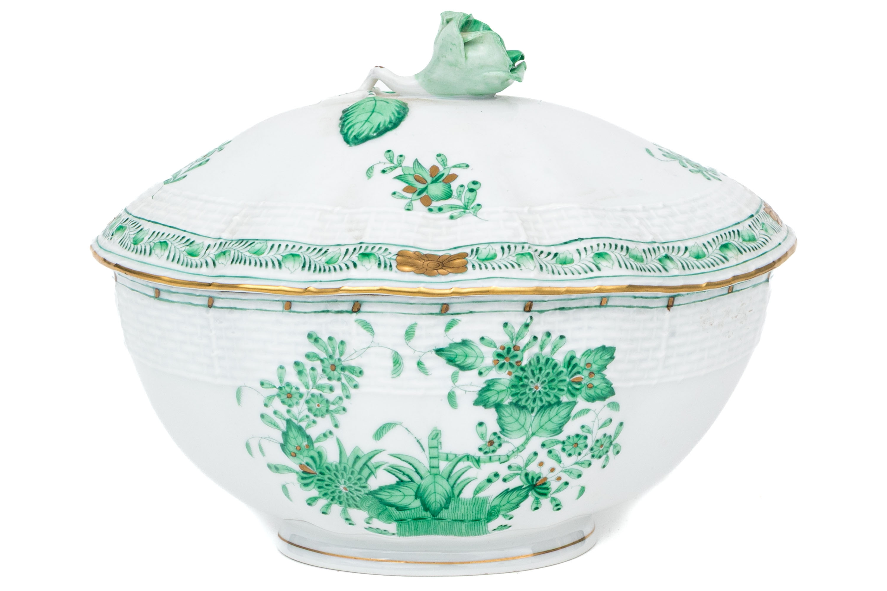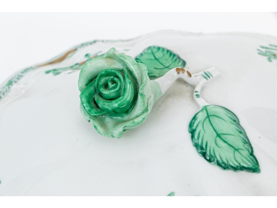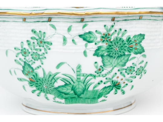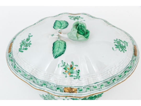 Herend Hungary hand-painted porcelain covered tureen, decorated in the Chinese Bouquet Green (Apponyi Green, AV) pattern with 24K gold accents and a sculptural rose finial. The lidded bowl features Herend’s signature basketweave (osier) texture around the rim and body, gracefully complemented by a scalloped edge gilded in gold. The surface is hand-painted with lush green peony blossoms and stylized foliage, arranged in the classic Apponyi floral motif. The lid is adorned with matching floral sprays and crowned by a beautifully modeled hand-formed green rose finial resting on two delicately painted leaves. The rim’s banding showcases a garland of leafy vines interspersed with golden flowers, adding dimension and symmetry to the design. The underside bears the Herend Hungary blue shield hallmark with crossed paintbrushes, inscribed HANDPAINTED and marked 6016/AV.