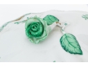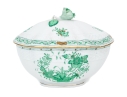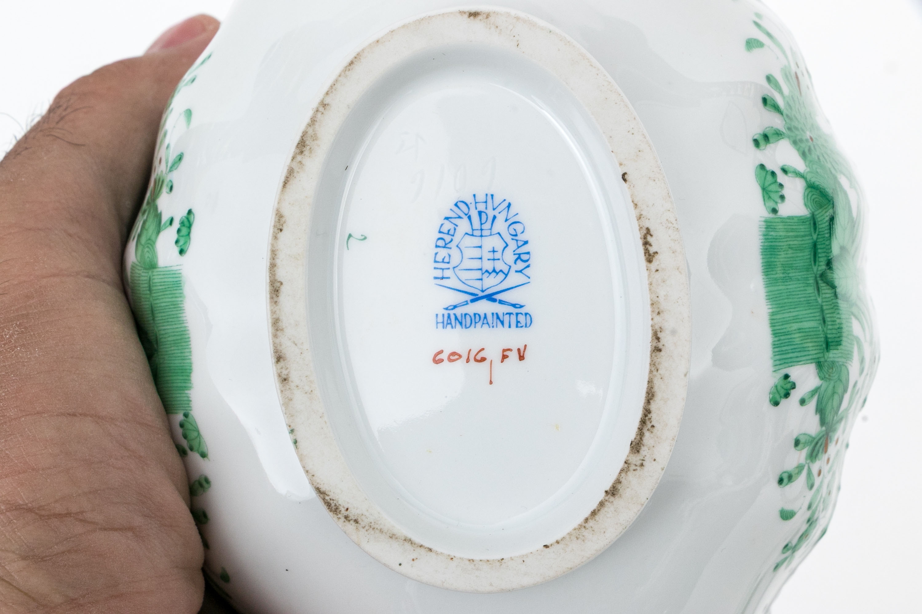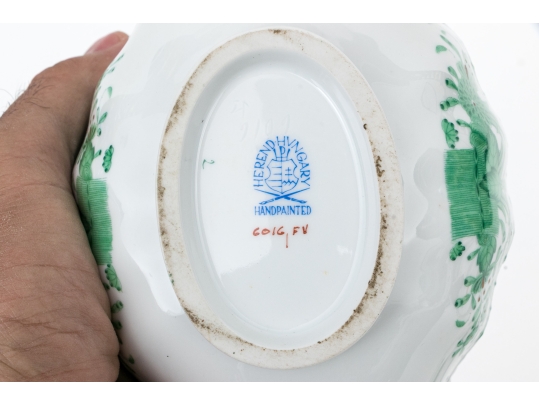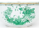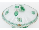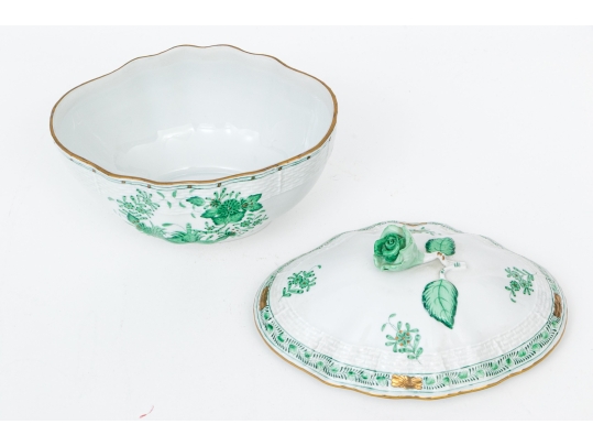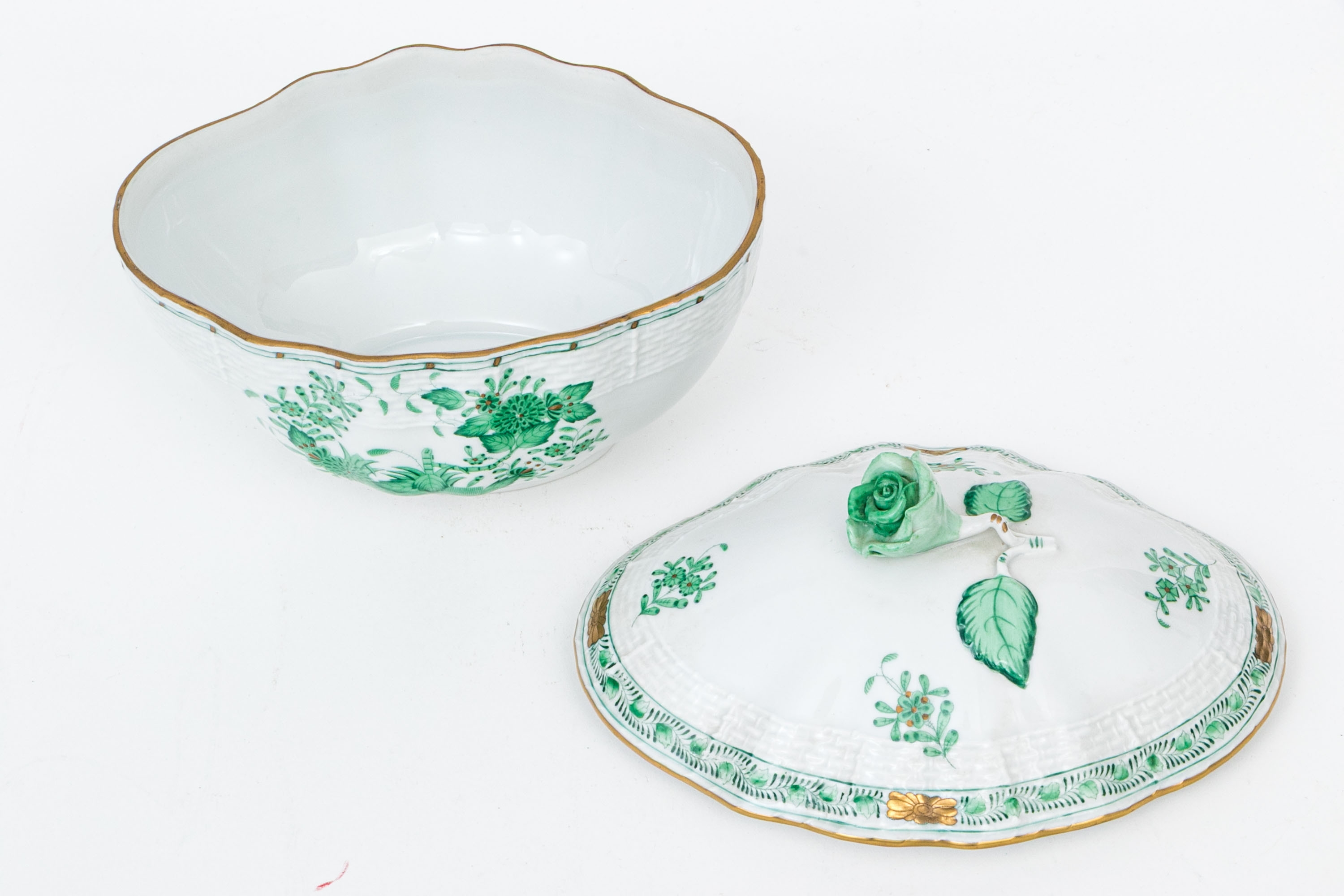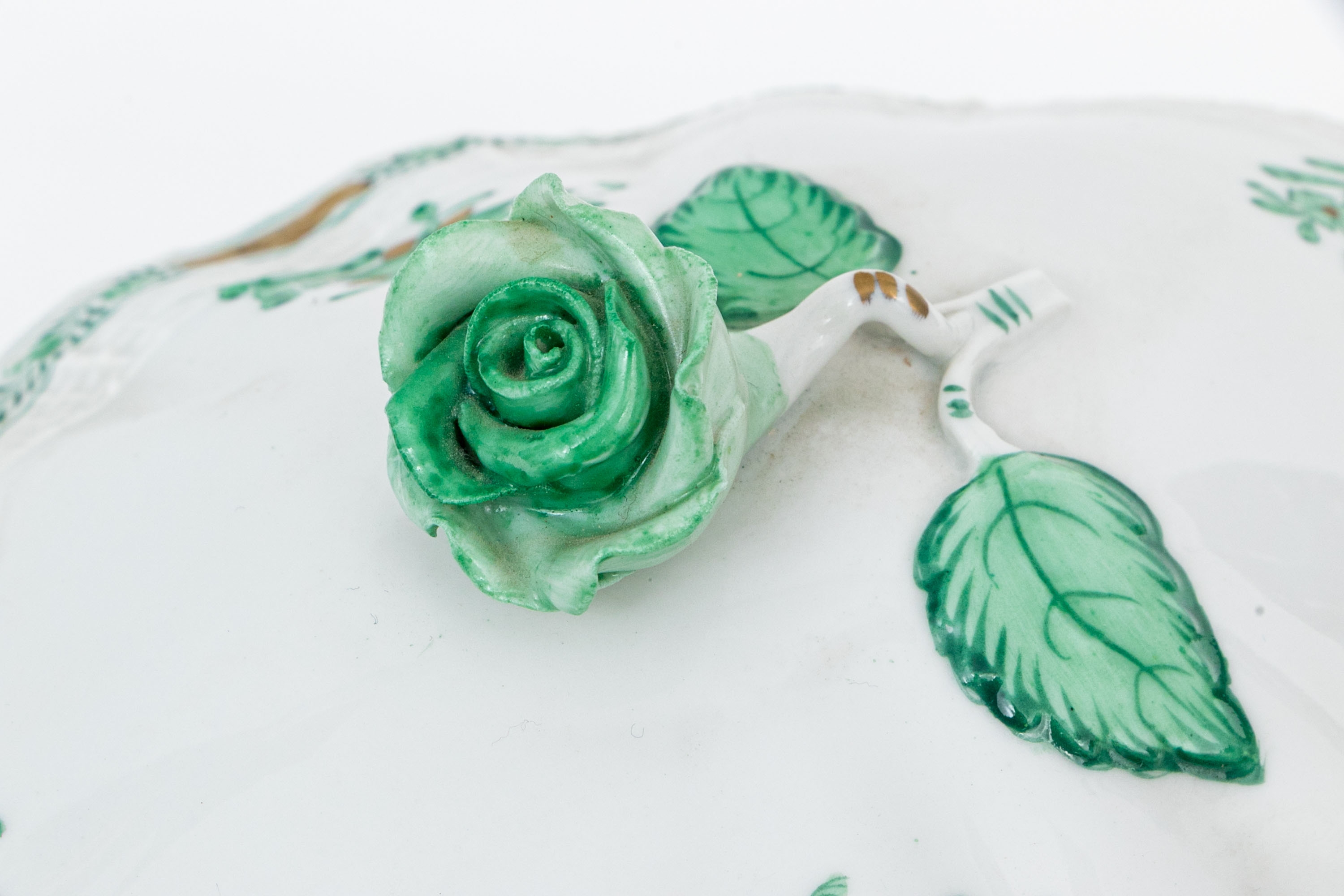 Herend Hungary hand-painted porcelain covered tureen, decorated in the Chinese Bouquet Green (Apponyi Green, AV) pattern with 24K gold accents and a sculptural rose finial. The lidded bowl features Herend’s signature basketweave (osier) texture around the rim and body, gracefully complemented by a scalloped edge gilded in gold. The surface is hand-painted with lush green peony blossoms and stylized foliage, arranged in the classic Apponyi floral motif. The lid is adorned with matching floral sprays and crowned by a beautifully modeled hand-formed green rose finial resting on two delicately painted leaves. The rim’s banding showcases a garland of leafy vines interspersed with golden flowers, adding dimension and symmetry to the design. The underside bears the Herend Hungary blue shield hallmark with crossed paintbrushes, inscribed HANDPAINTED and marked 6016/AV.