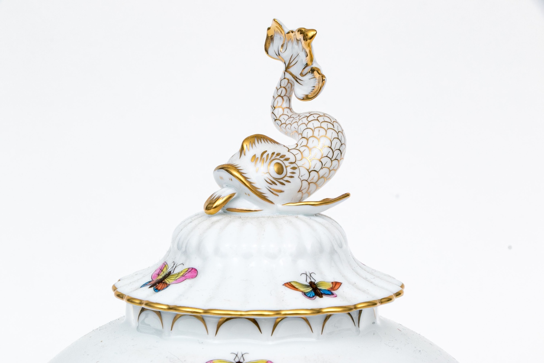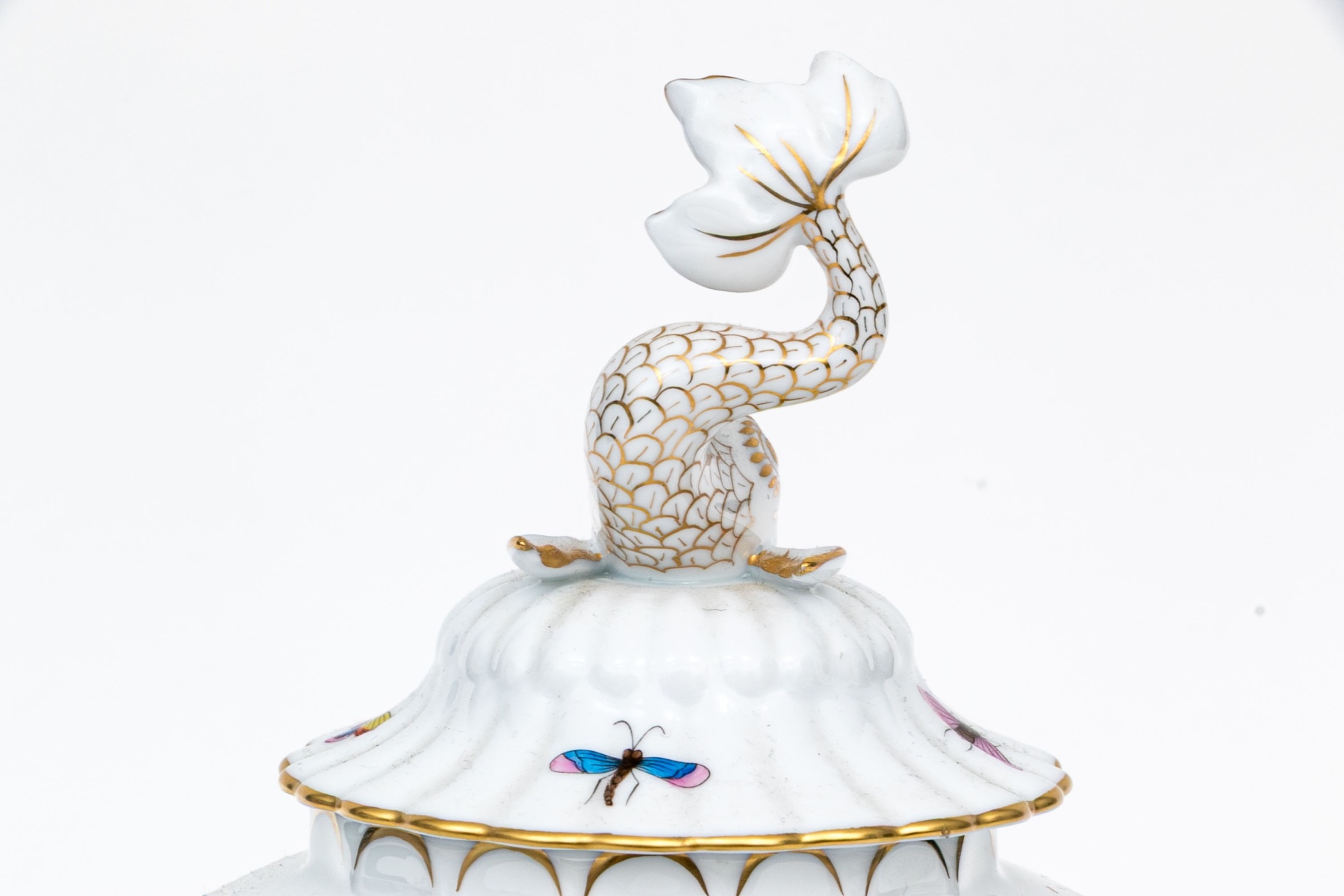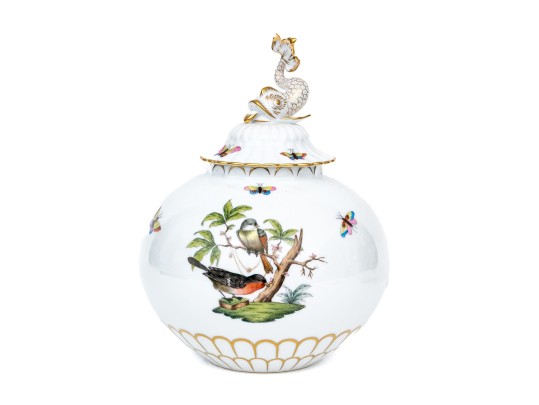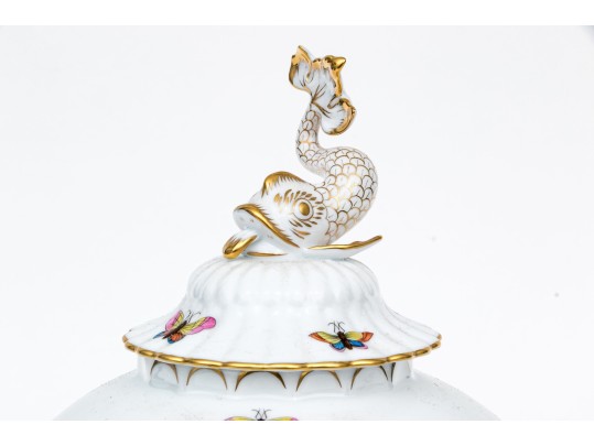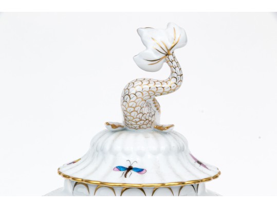 The rounded body features a gently fluted foot and neck edged in hand-painted 24K gold scalloping, framing vivid scenes from the Rothschild Bird series. Each panel depicts a pair of colorful songbirds perched amid delicately rendered branches with necklace with green foliage and blossoms, surrounded by fluttering butterflies and insects, painted in Herend’s signature bright enamels. The domed lid continues the decoration with butterflies and gold edging and is topped with a three-dimensional dolphin finial — modeled with dramatic curvature and detailed with gilt scales and highlights. The underside bears the blue Herend Hungary shield mark, inscribed HANDPAINTED, and pattern number 6542-0-18/RO.