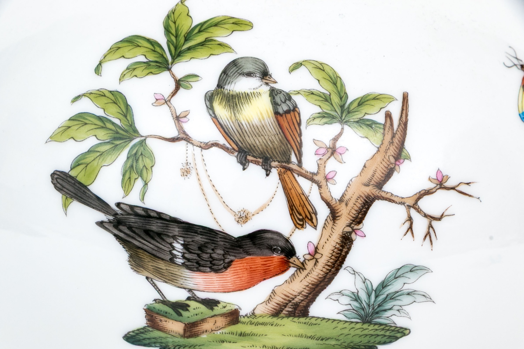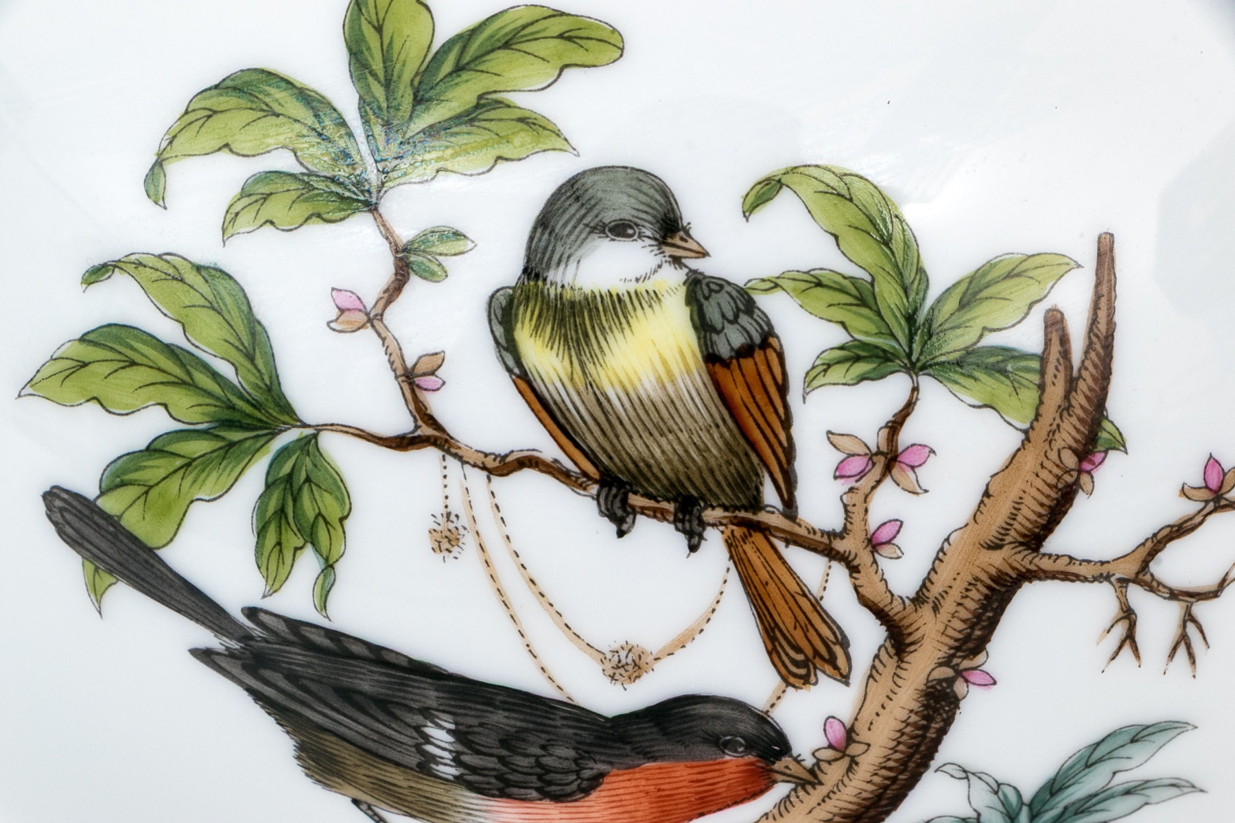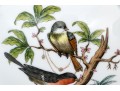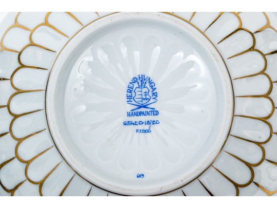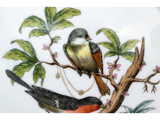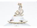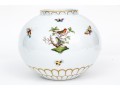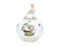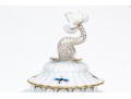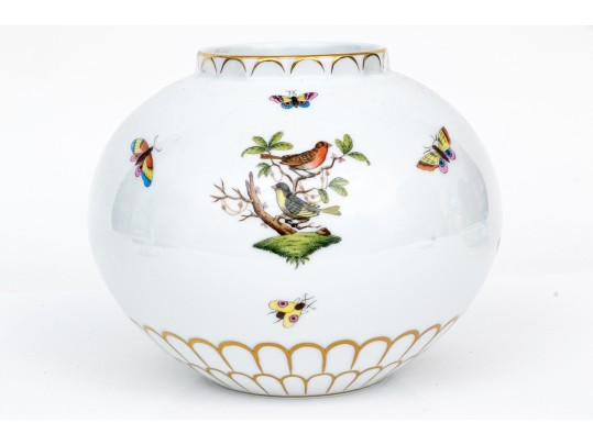 The rounded body features a gently fluted foot and neck edged in hand-painted 24K gold scalloping, framing vivid scenes from the Rothschild Bird series. Each panel depicts a pair of colorful songbirds perched amid delicately rendered branches with necklace with green foliage and blossoms, surrounded by fluttering butterflies and insects, painted in Herend’s signature bright enamels. The domed lid continues the decoration with butterflies and gold edging and is topped with a three-dimensional dolphin finial — modeled with dramatic curvature and detailed with gilt scales and highlights. The underside bears the blue Herend Hungary shield mark, inscribed HANDPAINTED, and pattern number 6542-0-18/RO.