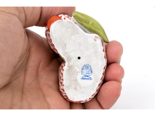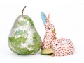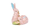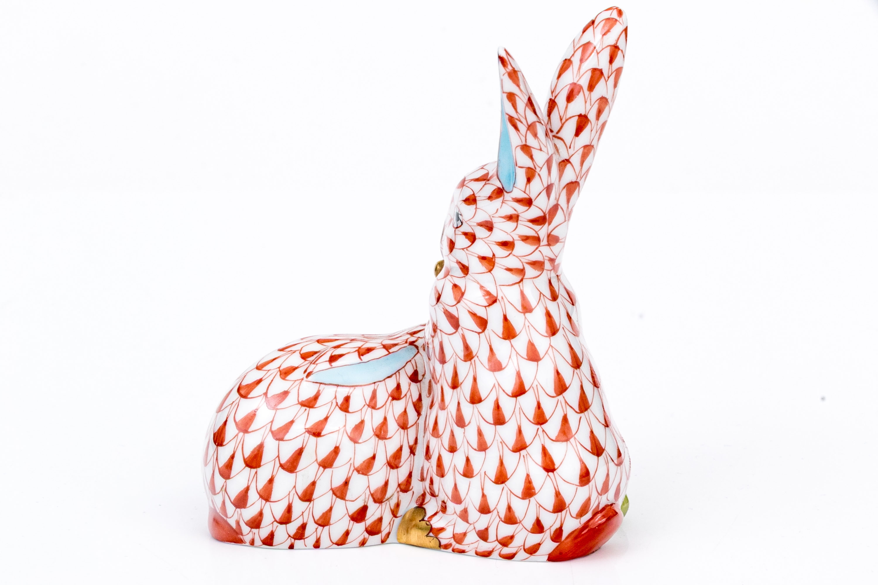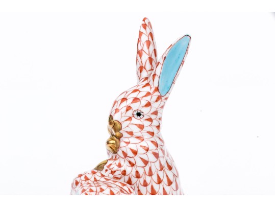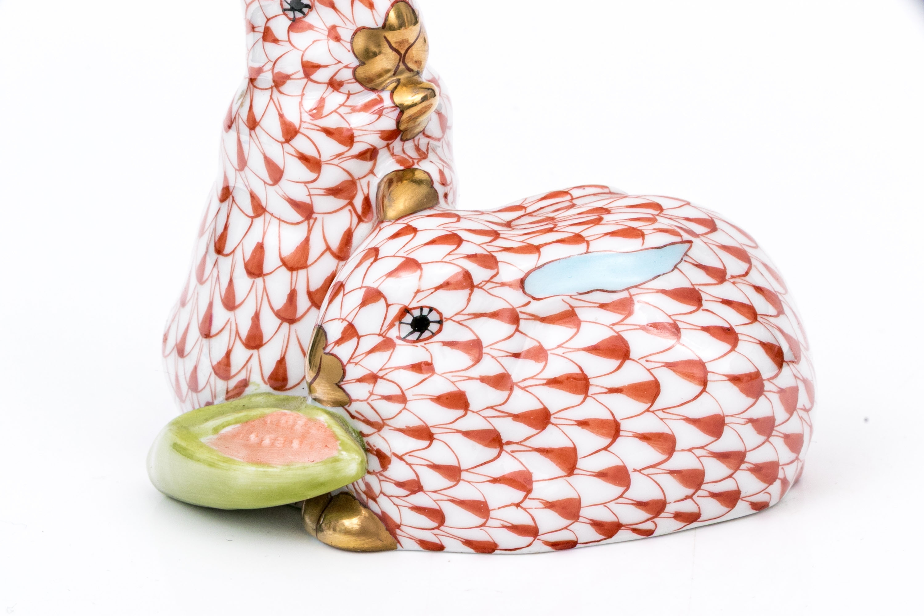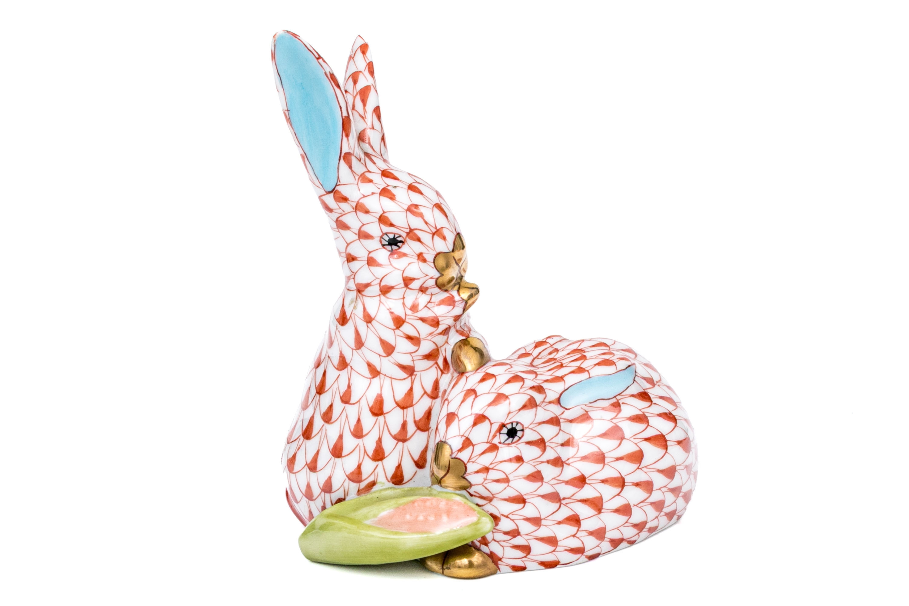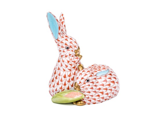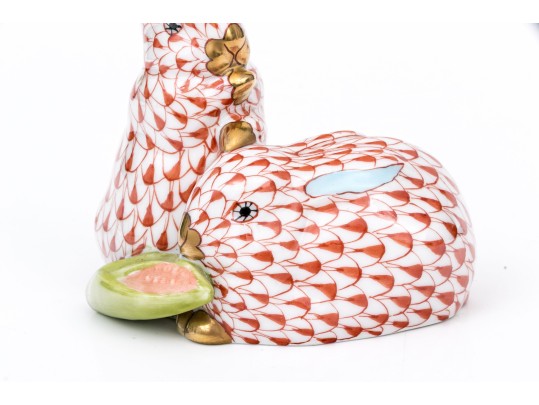 Delightful hand-painted porcelain figure by Herend Hungary depicting two rabbits in the iconic rust fishnet pattern, one sitting upright beside a reclining companion nibbling an ear of corn. Each rabbit features sky-blue inner ears and 24K gilt accents to the eyes, paws, and corn husk edges. Marked on underside with the blue Herend Hungary shield and crossed paintbrushes, stamped Handpainted.