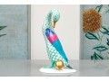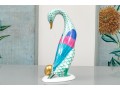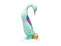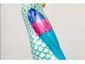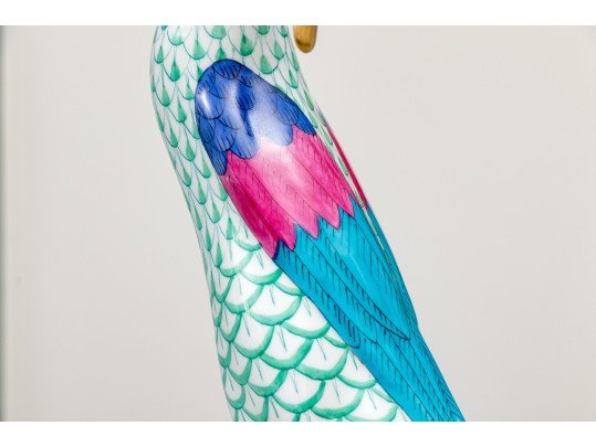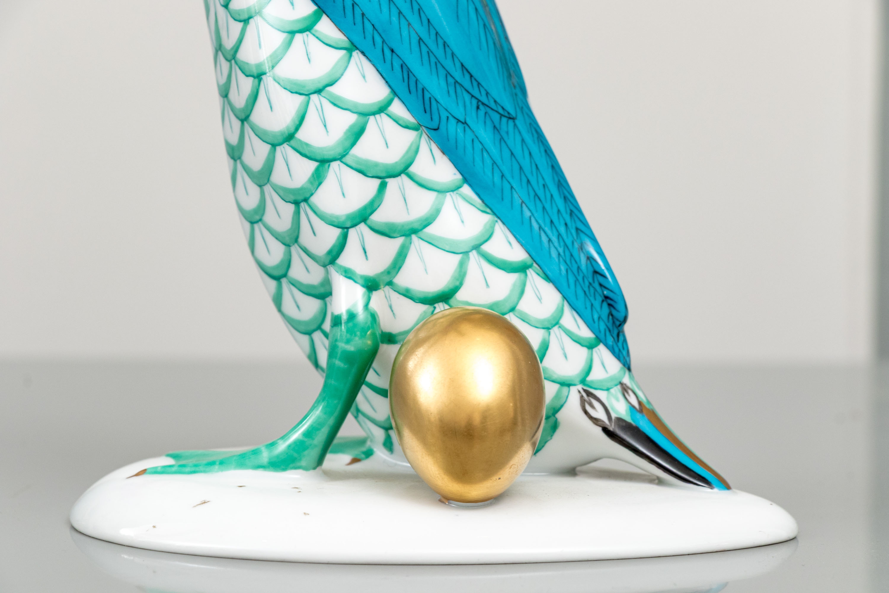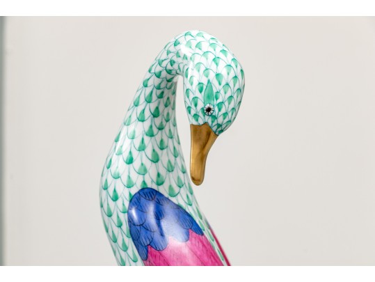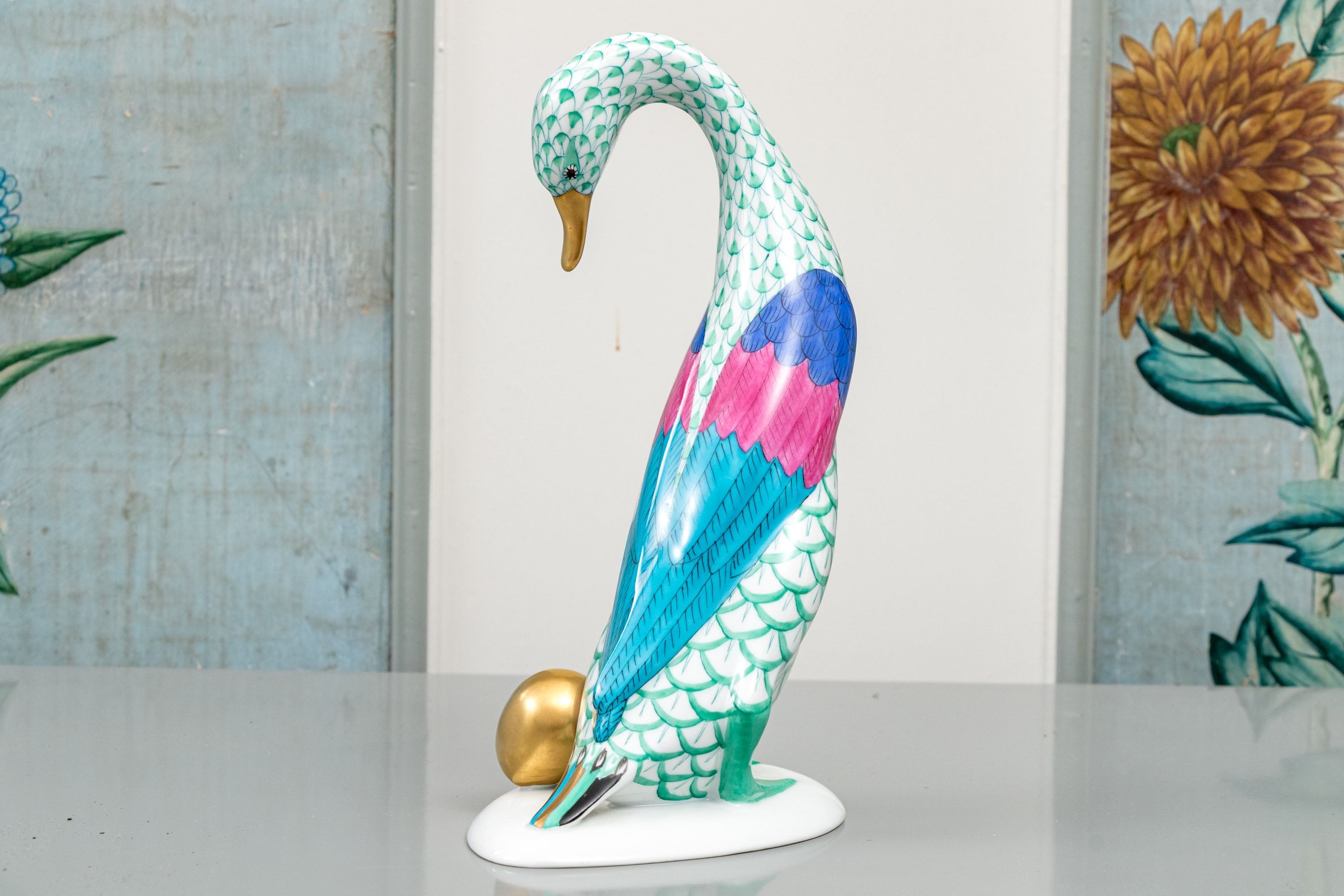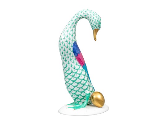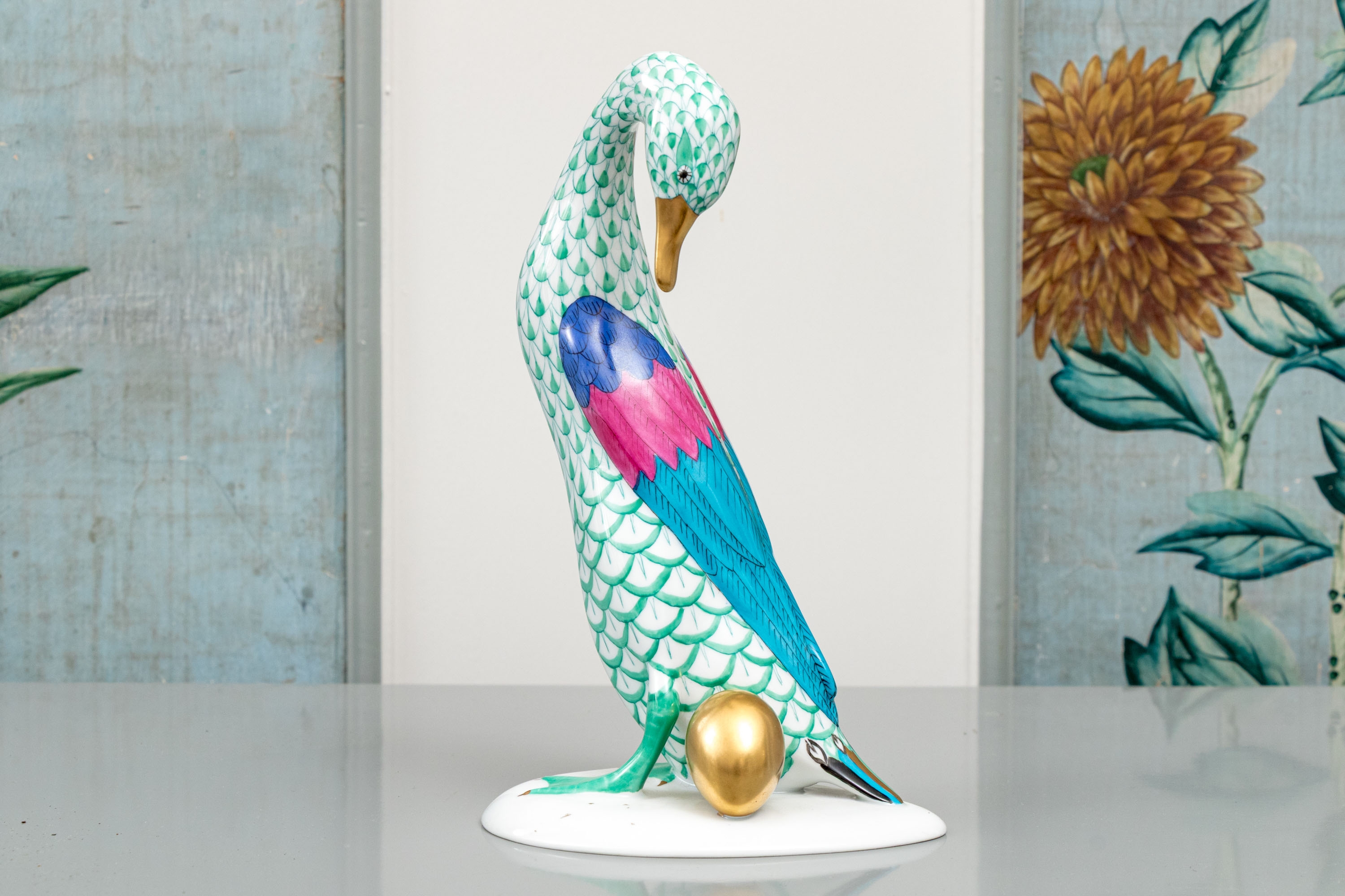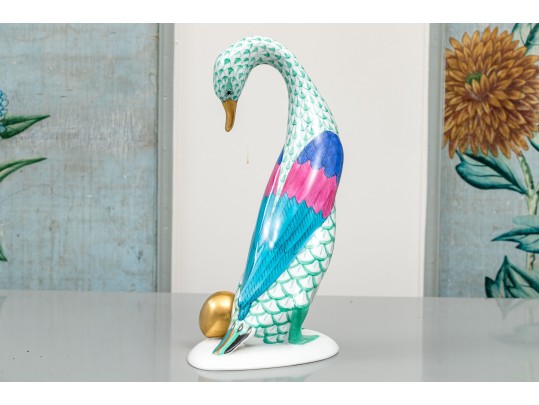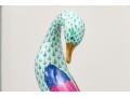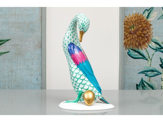 Herend porcelain goose figurine, hand-painted in the green fishnet (VHV) pattern with vivid accent colors and 24K gold embellishments. The goose is depicted standing over a gold egg, its long neck elegantly curved downward in a protective gesture..The bird’s body features Herend’s signature green fishnet design, accented by vibrant cobalt blue and magenta feathers on the wings. Its beak and feet are finished in rich gold, contrasting beautifully with the delicate green scales and white porcelain ground. The underside bears the Herend Hungary blue shield and crossed paintbrush mark, stamped Handpainted with impressed factory marks and painter’s numbers.