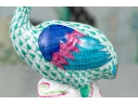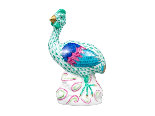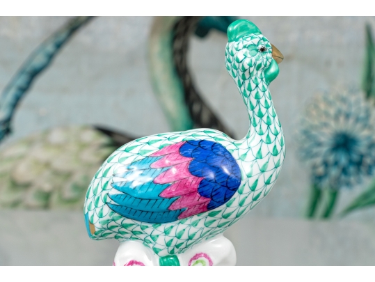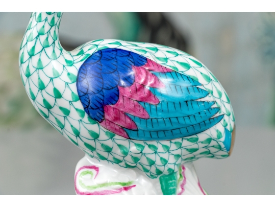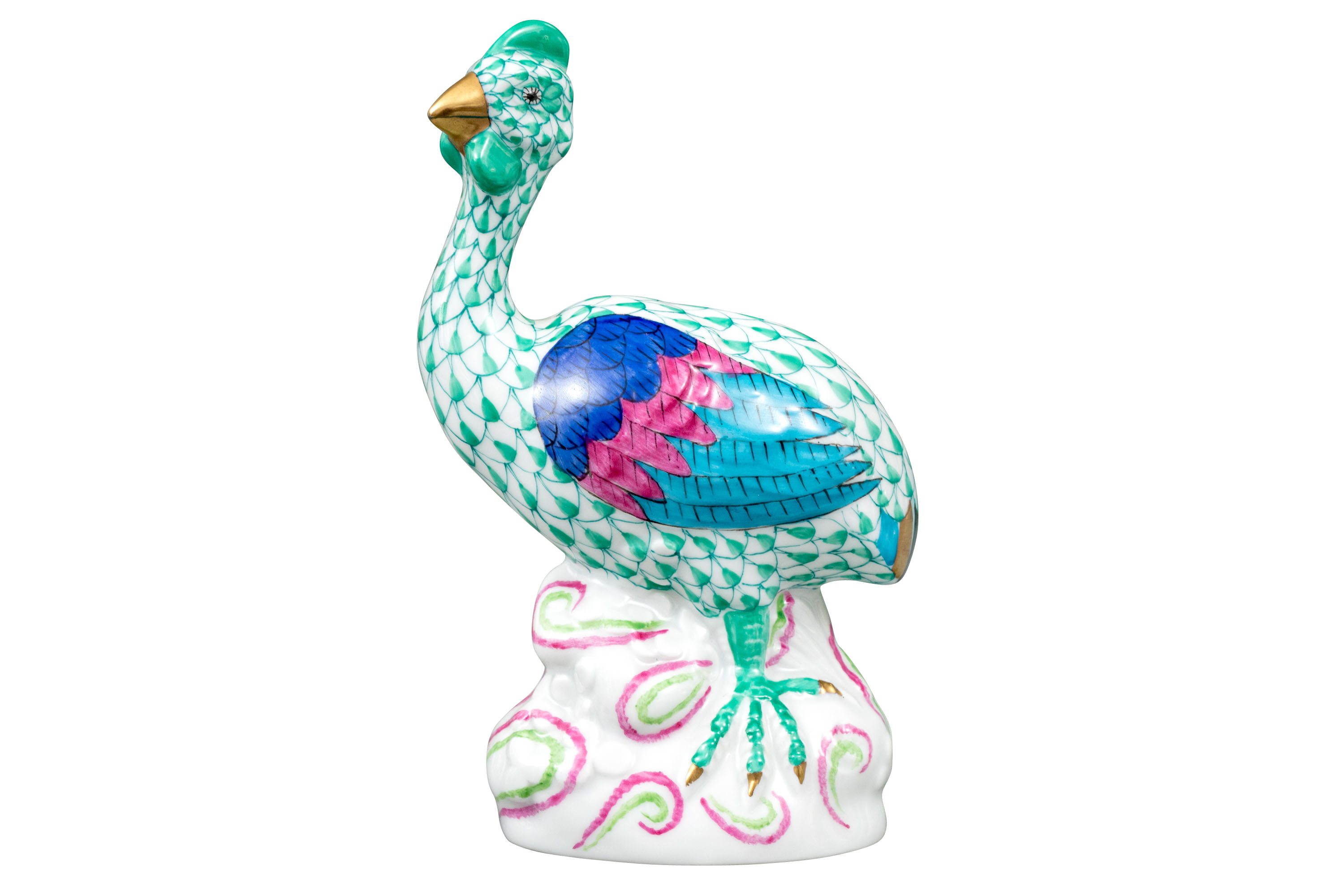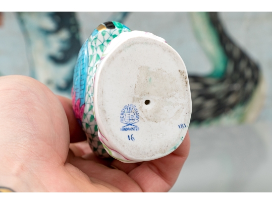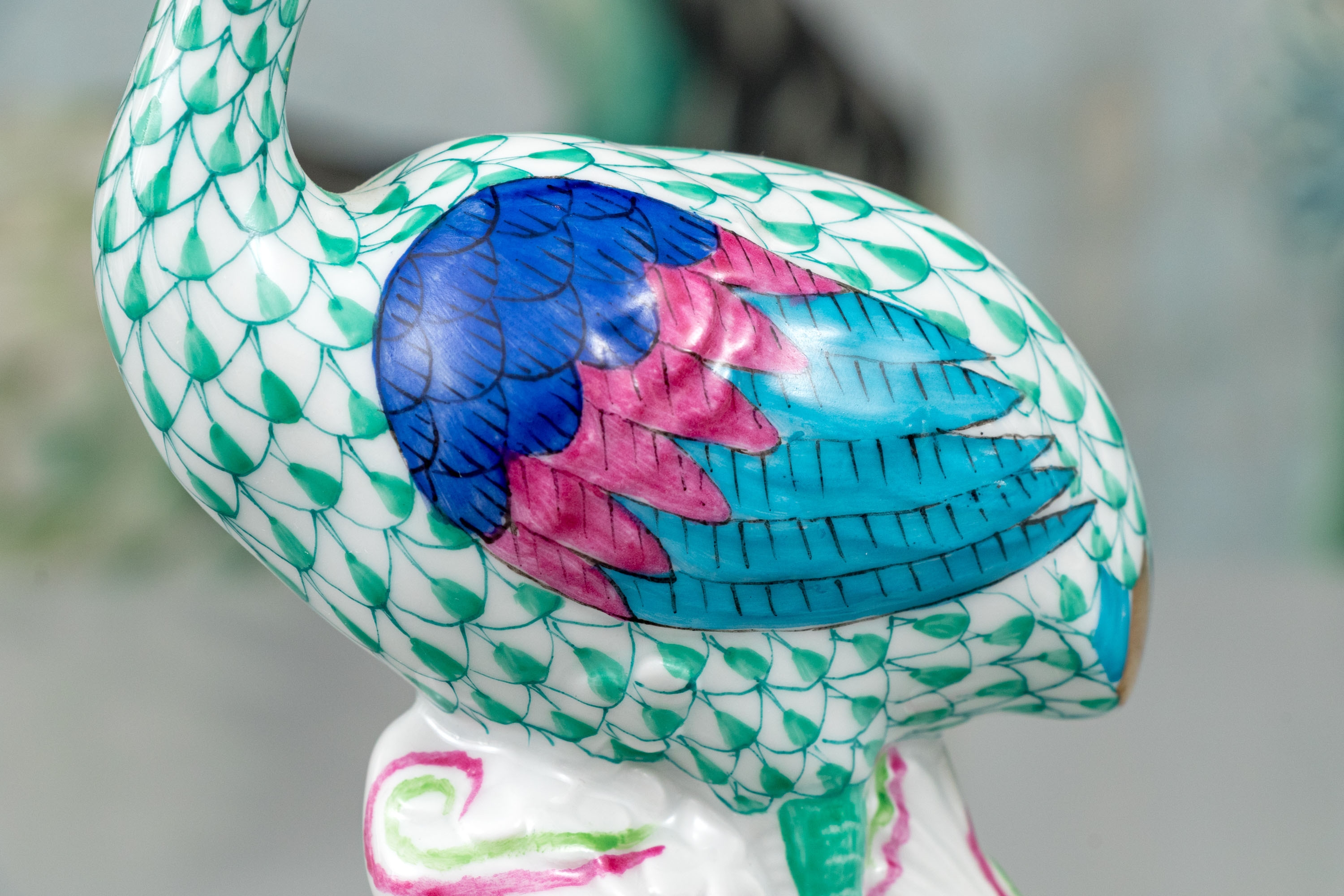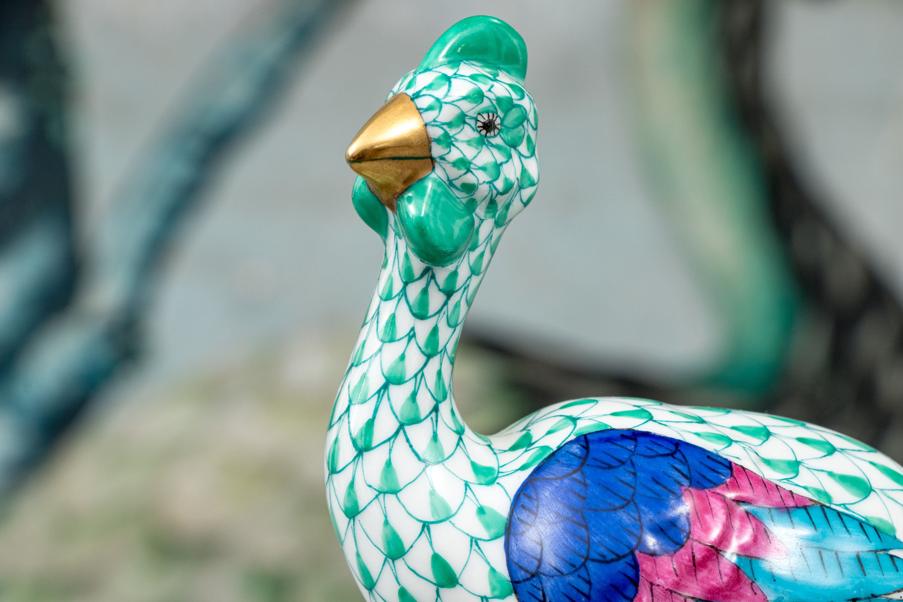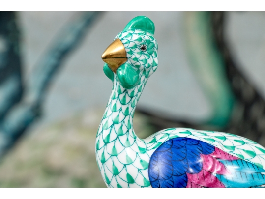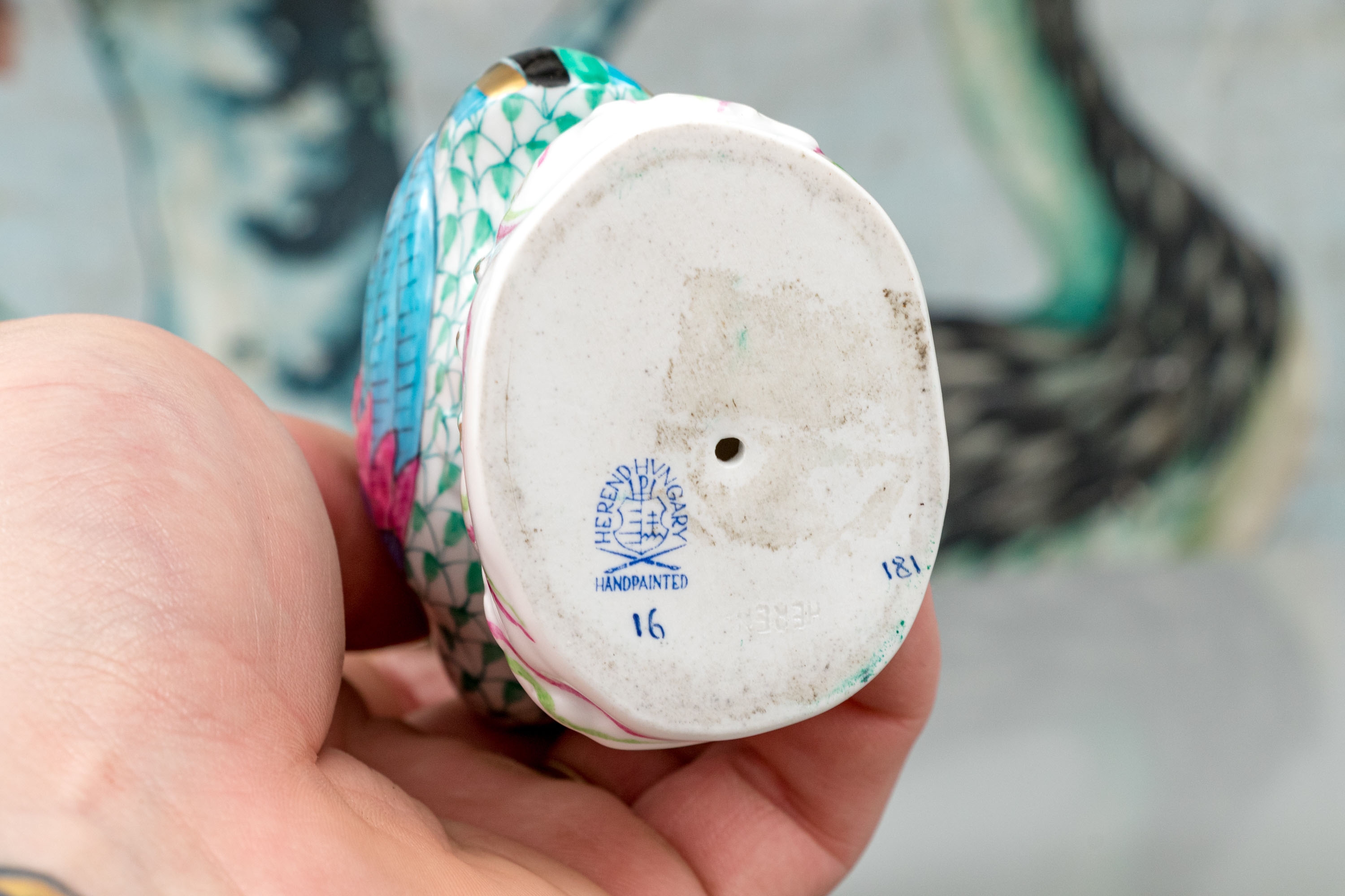 The feathers are adorned in Herend’s signature green fishnet design, accented with brilliantly painted plumage in hues of royal blue, magenta, and turquoise, and finished with 24K gold details on the beak and claws. The underside bears the Herend Hungary blue shield and crossed paintbrush mark, inscribed Handpainted and numbered 181 and 16, with impressed factory marks.
