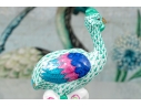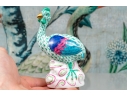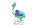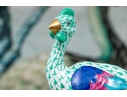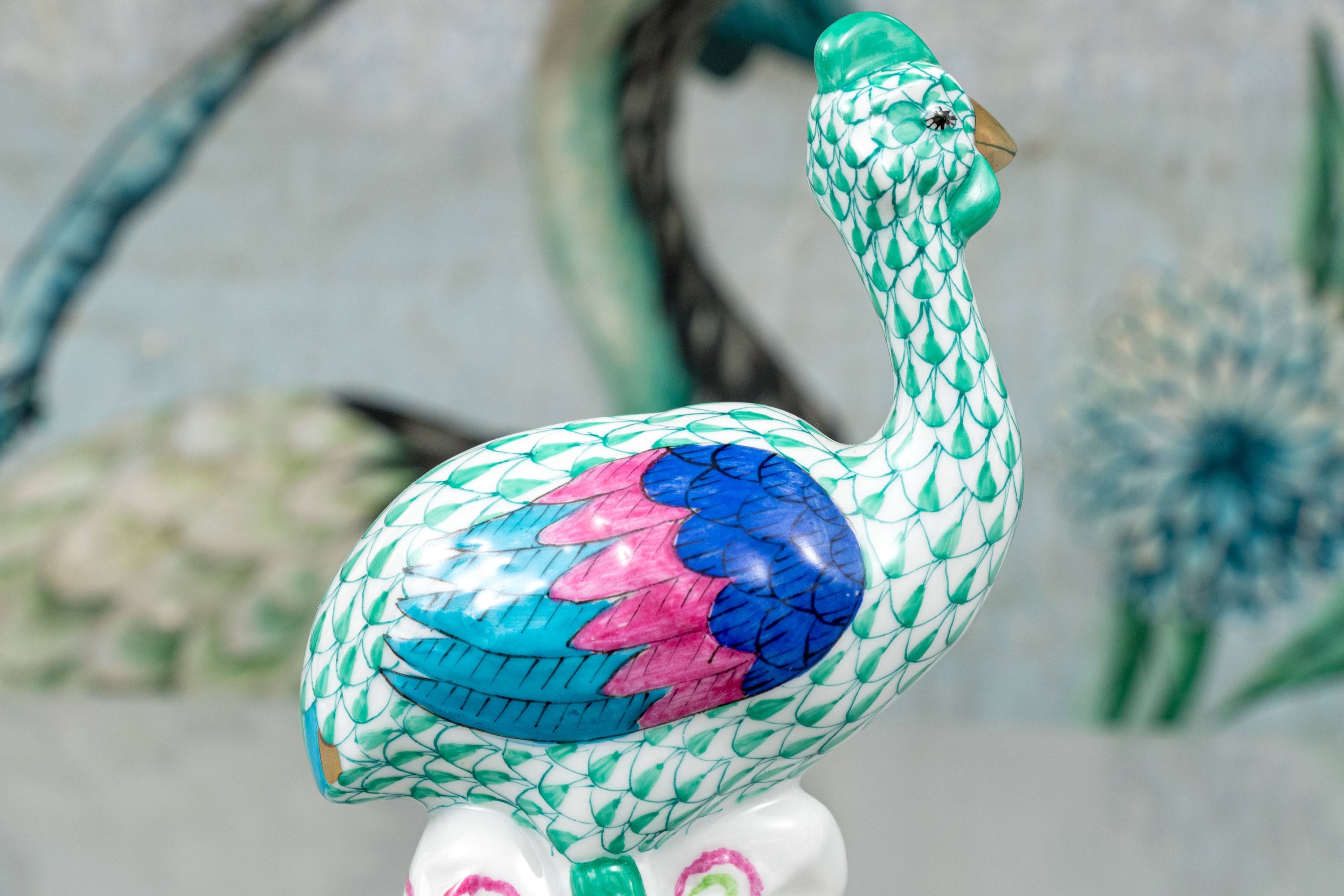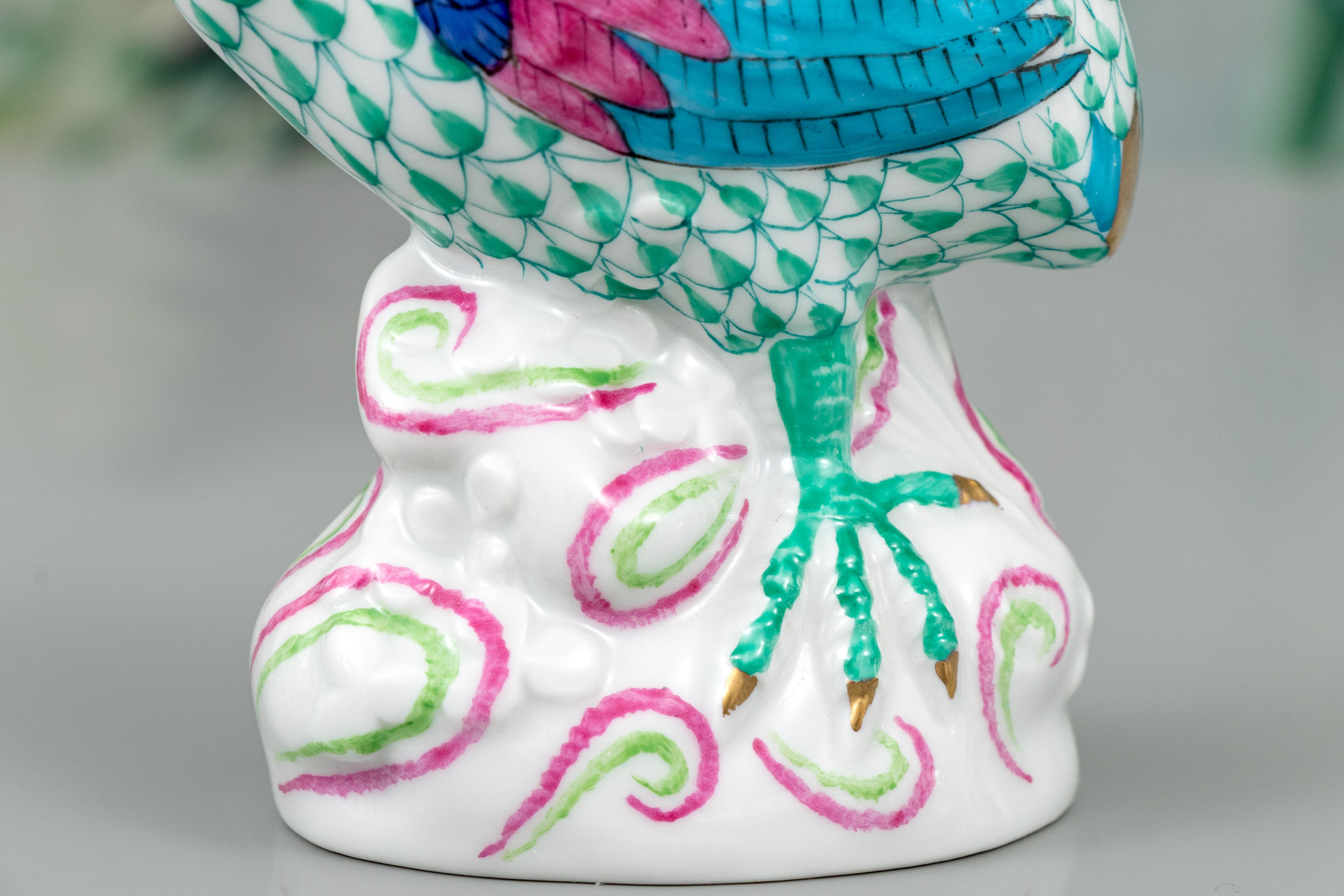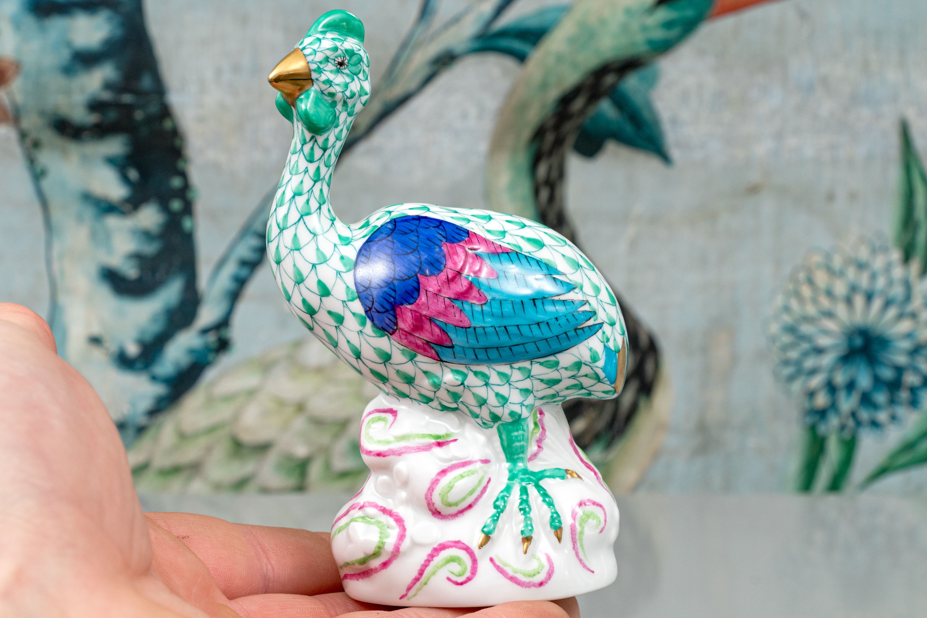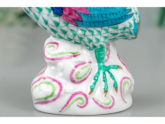Herend porcelain bird figurine, hand-painted in the green fishnet (VHV) pattern with vibrant, multi-color detailing. The bird stands gracefully atop a white porcelain base accented with whimsical green and pink scrollwork.