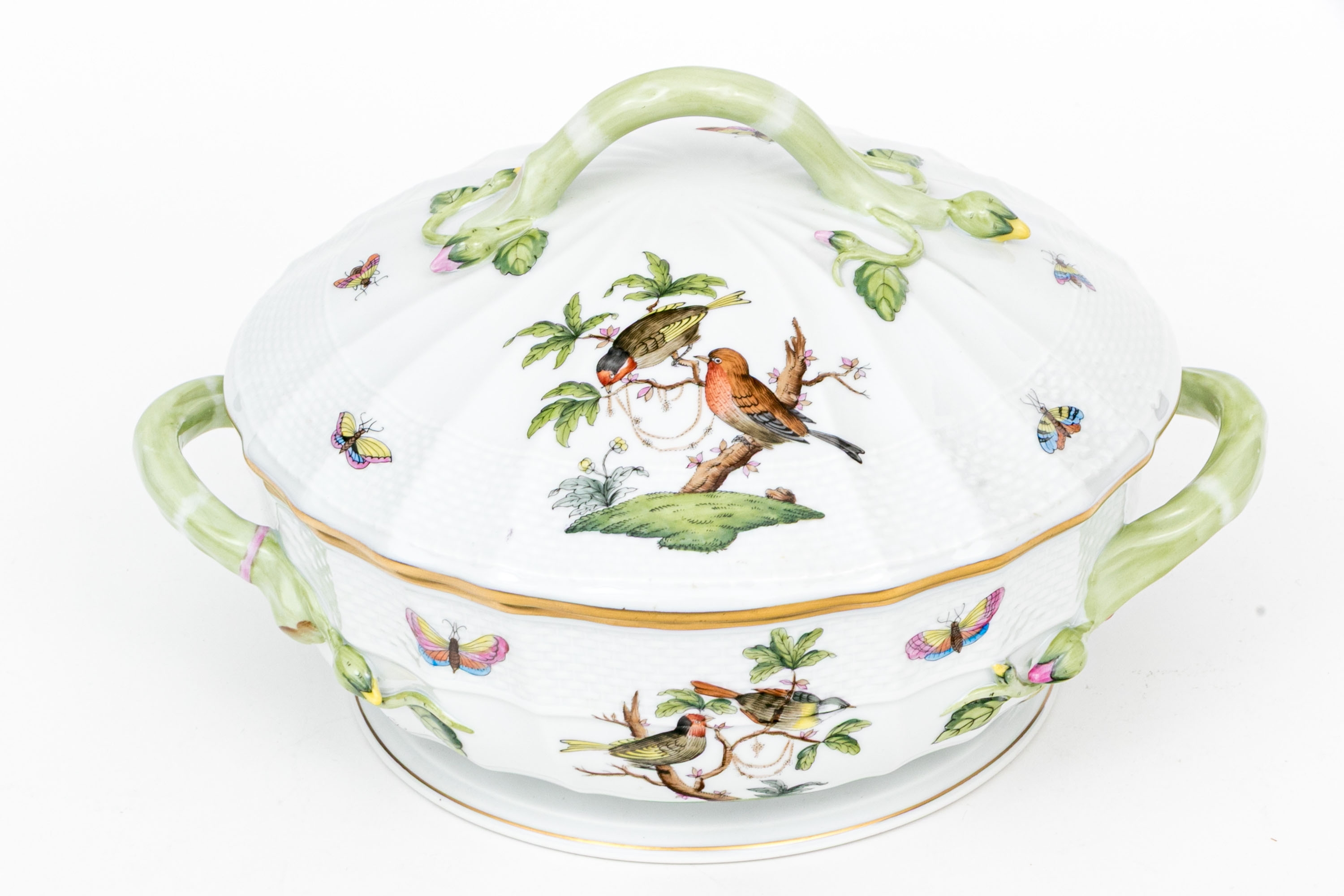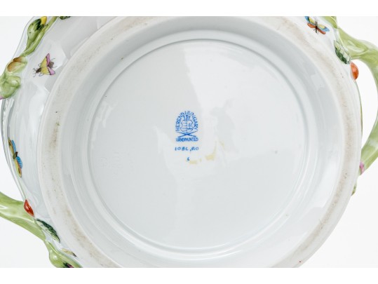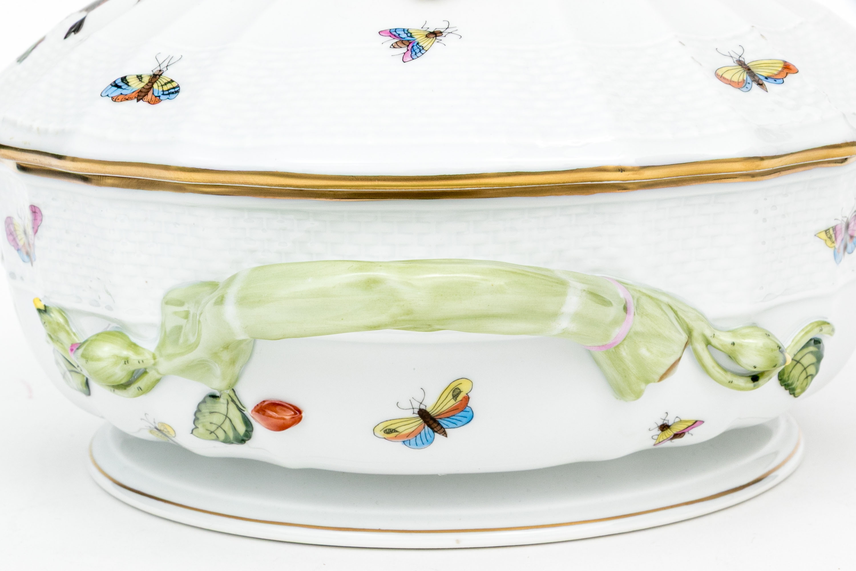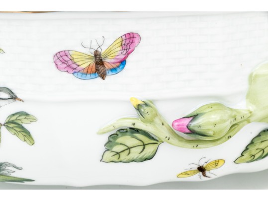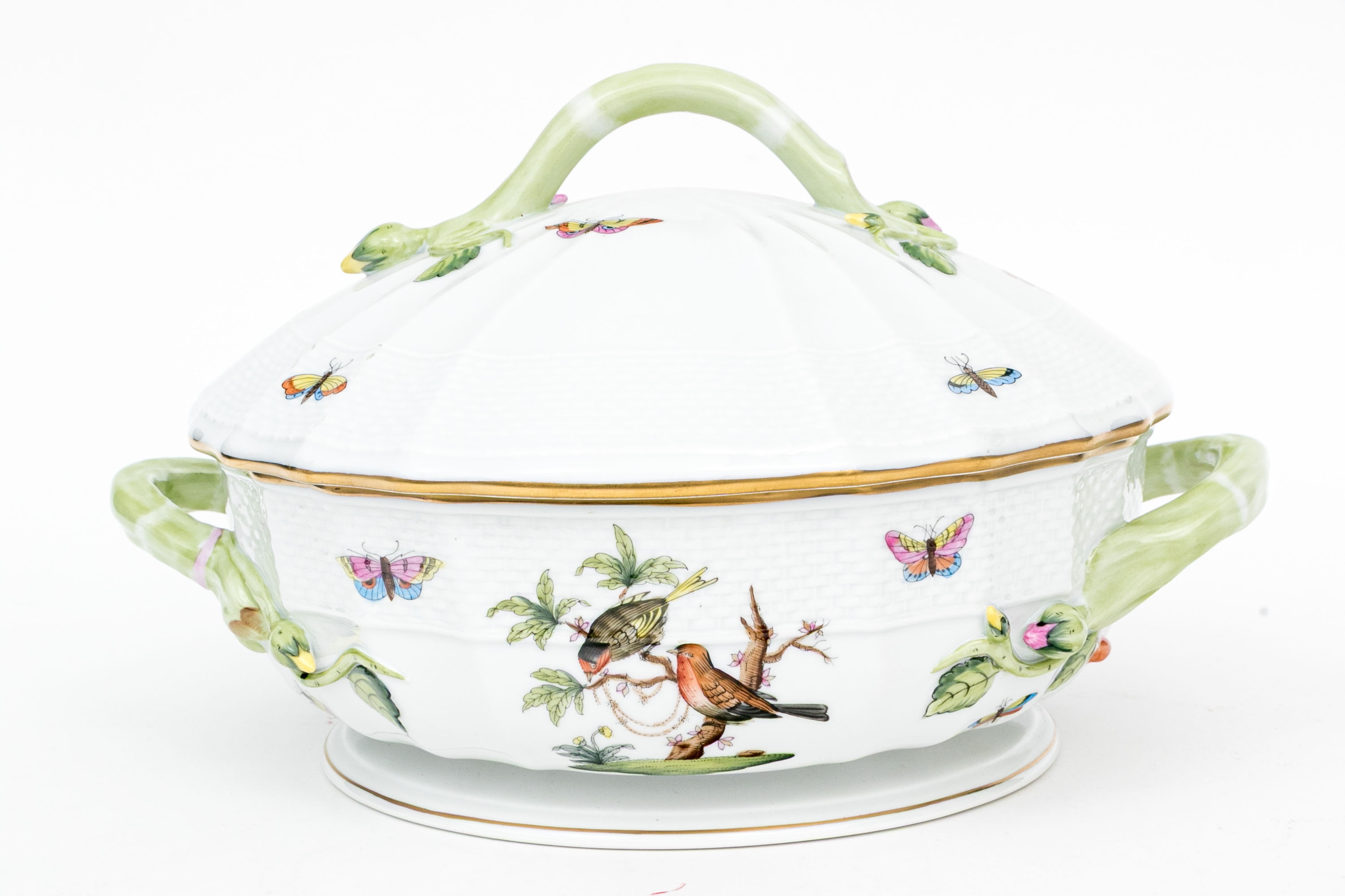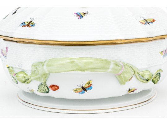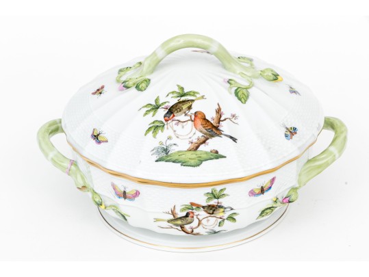 Herend porcelain tureen features the Rothschild Bird (RO) design. The decoration depicts pairs of colorful birds perched on flowering branches with necklace, surrounded by delicate butterflies, dragonflies, and insects — all rendered in exquisite hand-painted detail and vivid enamel colors. The body and lid display Herend’s signature basketweave relief pattern, enhancing the dimensional texture of the porcelain. The applied handles are formed as curling green branches accented with small rosebuds, while the domed lid is crowned with an elegant, naturalistic branch-form finial. The piece rests on a circular footed base with a thin gilt accent line, and the rim and finial edges are also trimmed in hand-applied gold. The underside bears the blue Herend Hungary shield mark, hand-painted and inscribed 1086/RO.