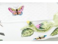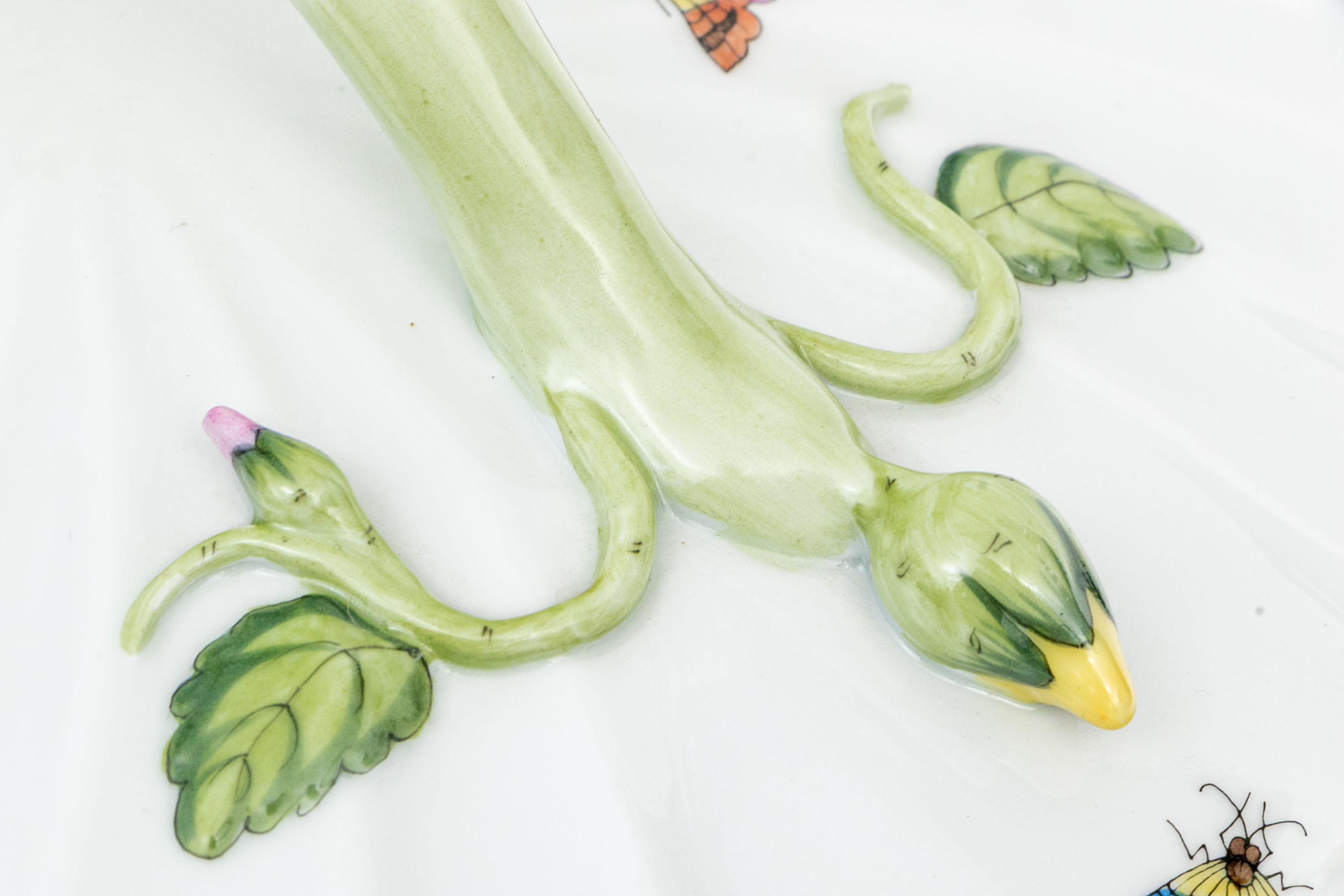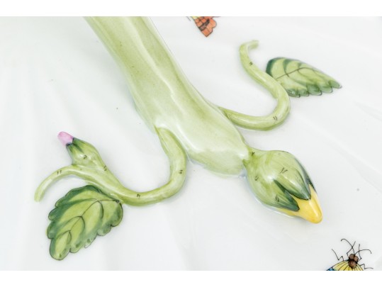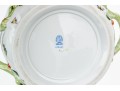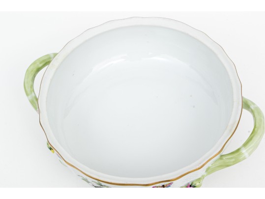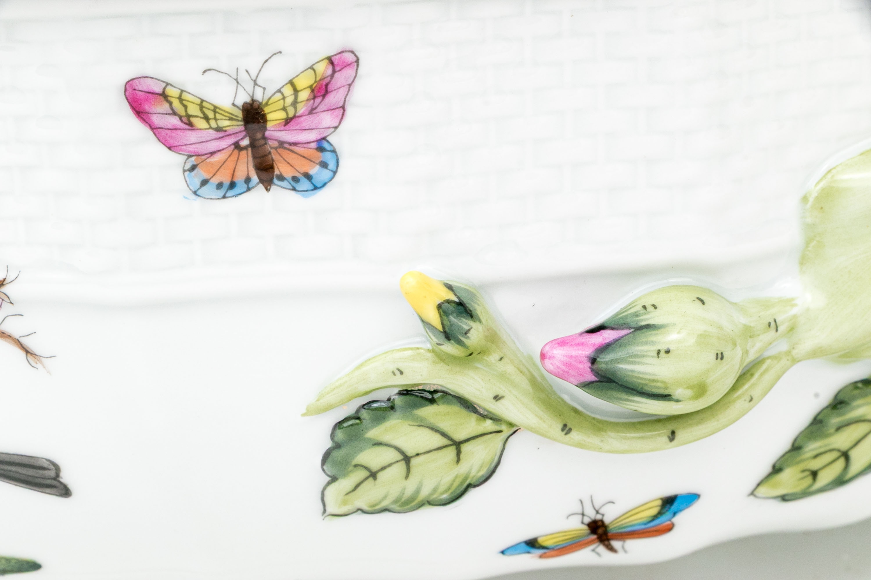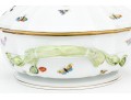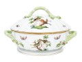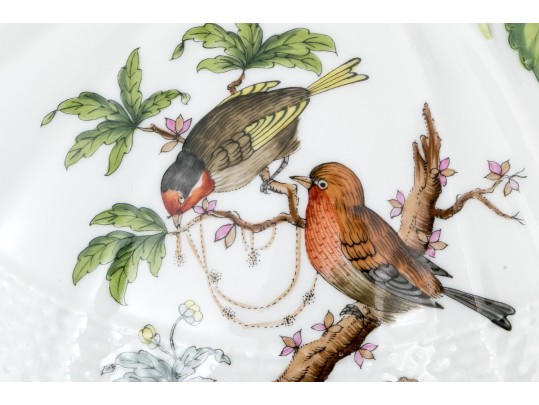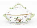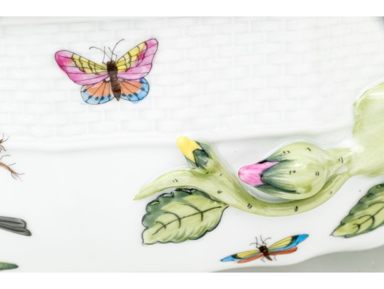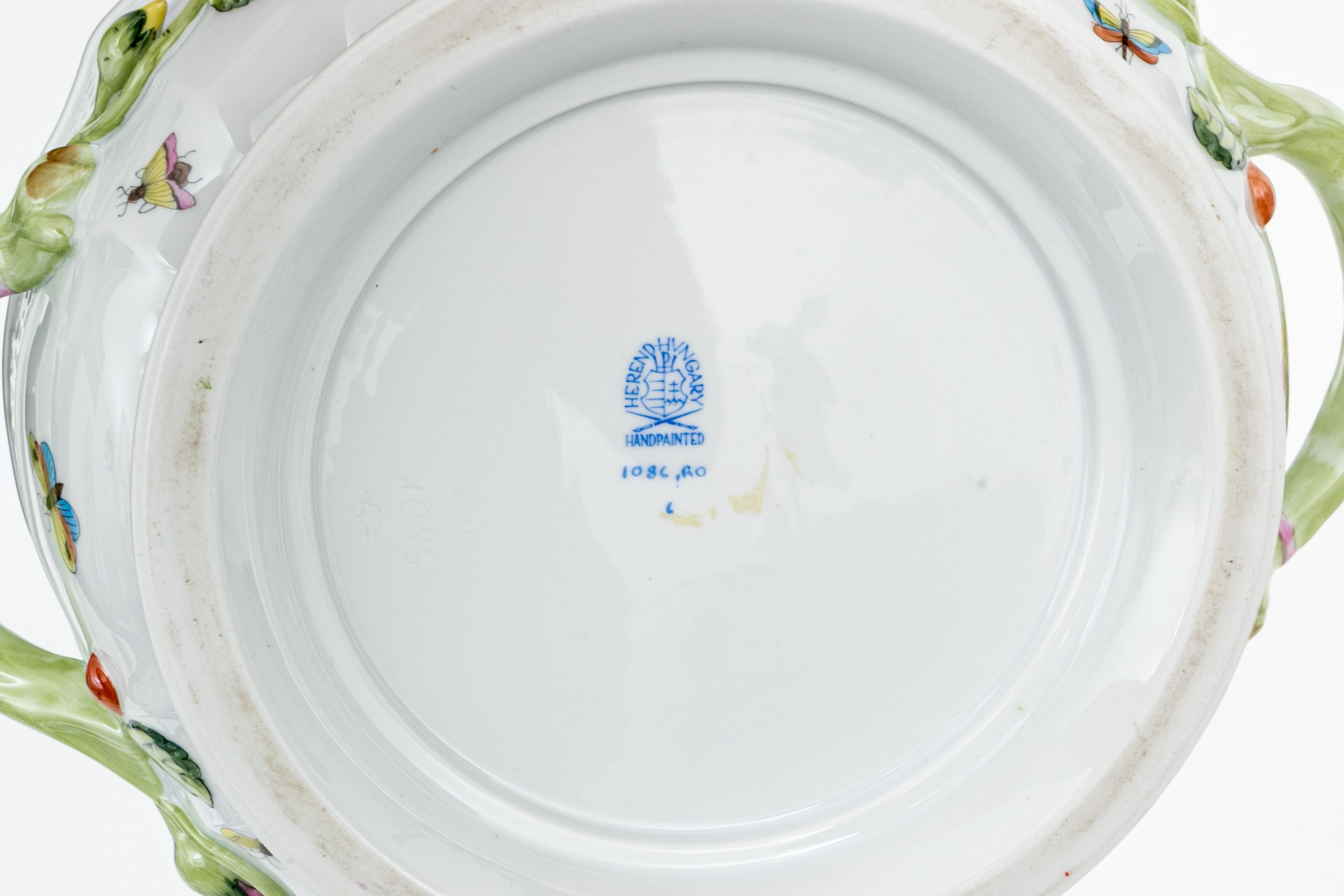 Herend porcelain tureen features the Rothschild Bird (RO) design. The decoration depicts pairs of colorful birds perched on flowering branches with necklace, surrounded by delicate butterflies, dragonflies, and insects — all rendered in exquisite hand-painted detail and vivid enamel colors. The body and lid display Herend’s signature basketweave relief pattern, enhancing the dimensional texture of the porcelain. The applied handles are formed as curling green branches accented with small rosebuds, while the domed lid is crowned with an elegant, naturalistic branch-form finial. The piece rests on a circular footed base with a thin gilt accent line, and the rim and finial edges are also trimmed in hand-applied gold. The underside bears the blue Herend Hungary shield mark, hand-painted and inscribed 1086/RO.