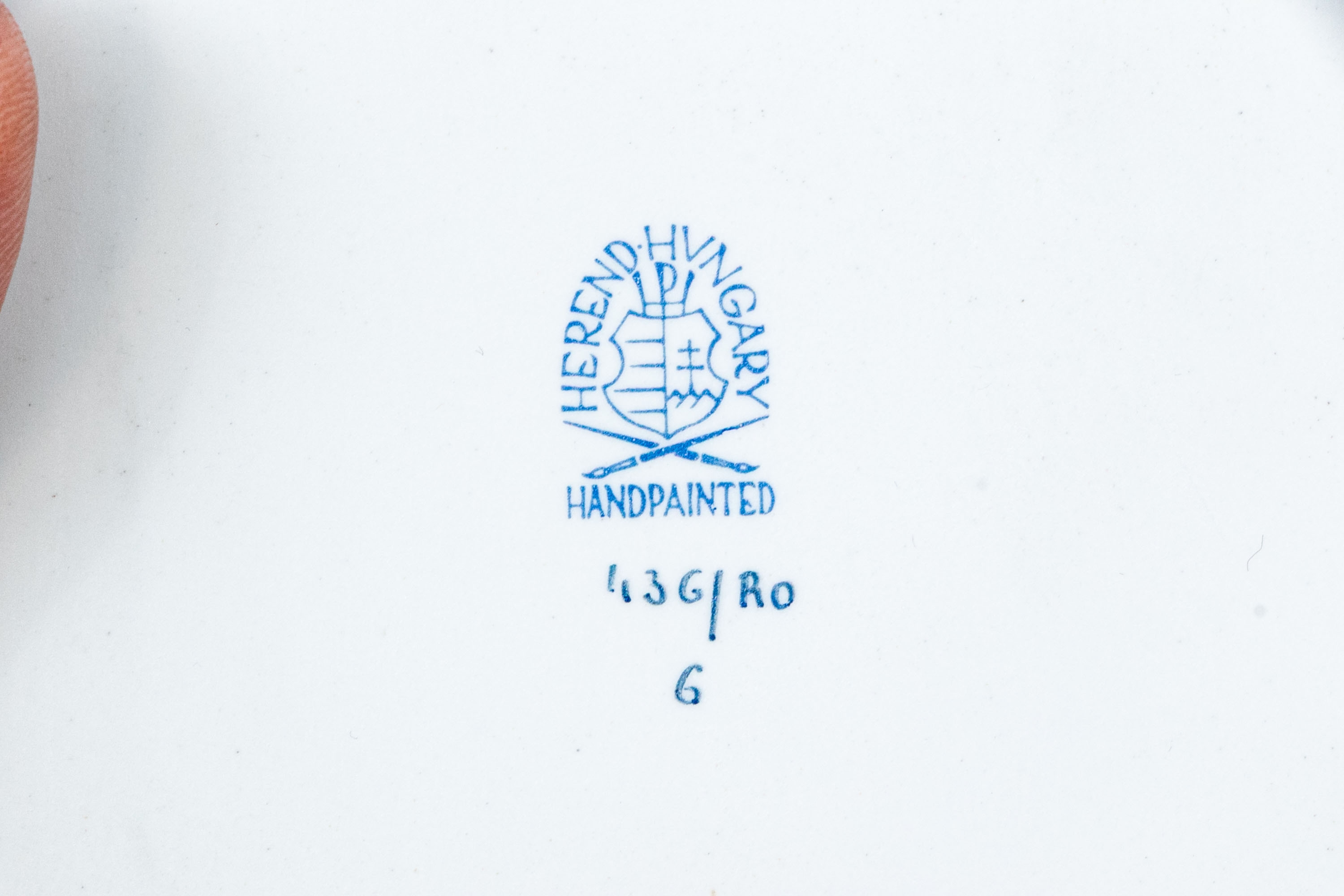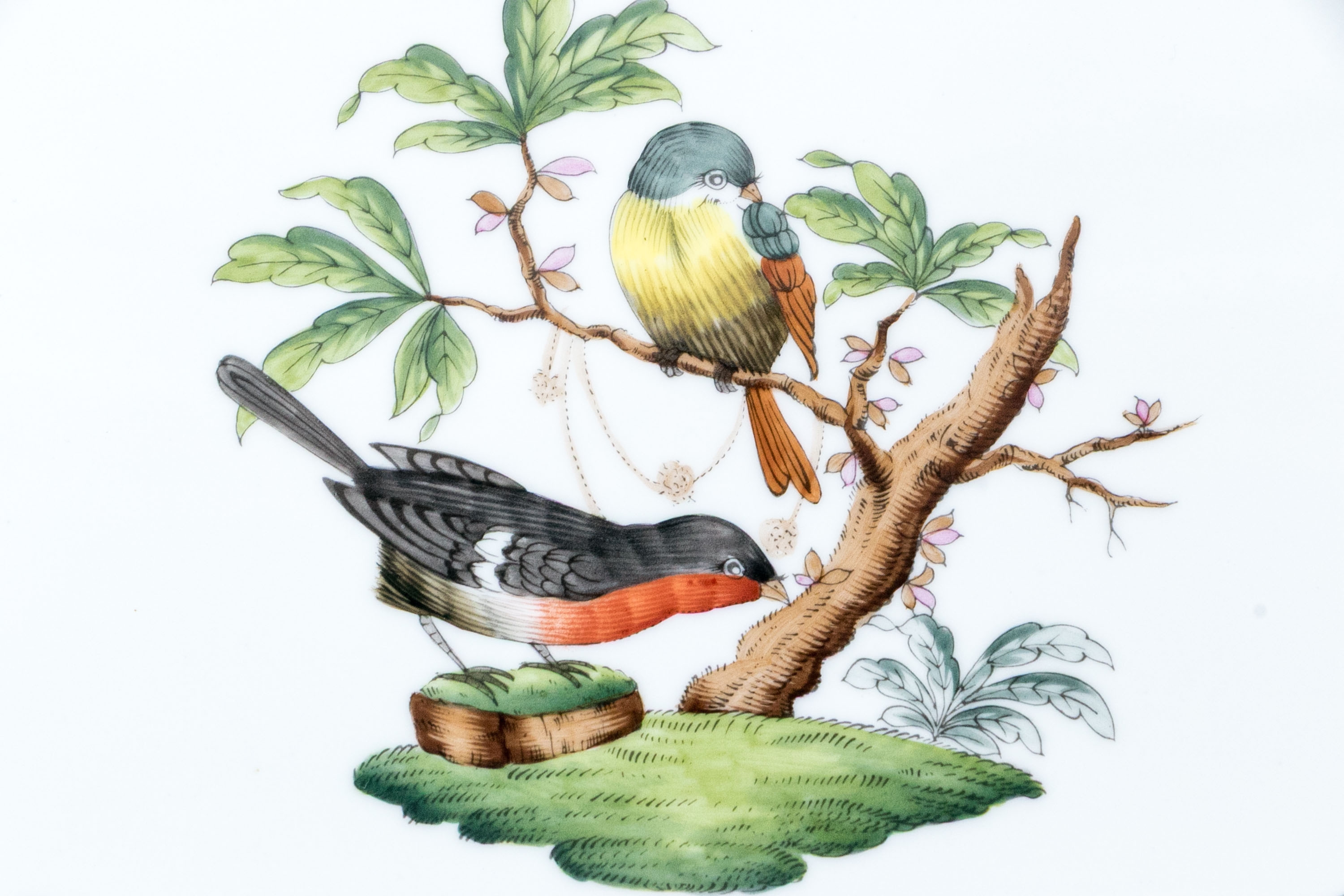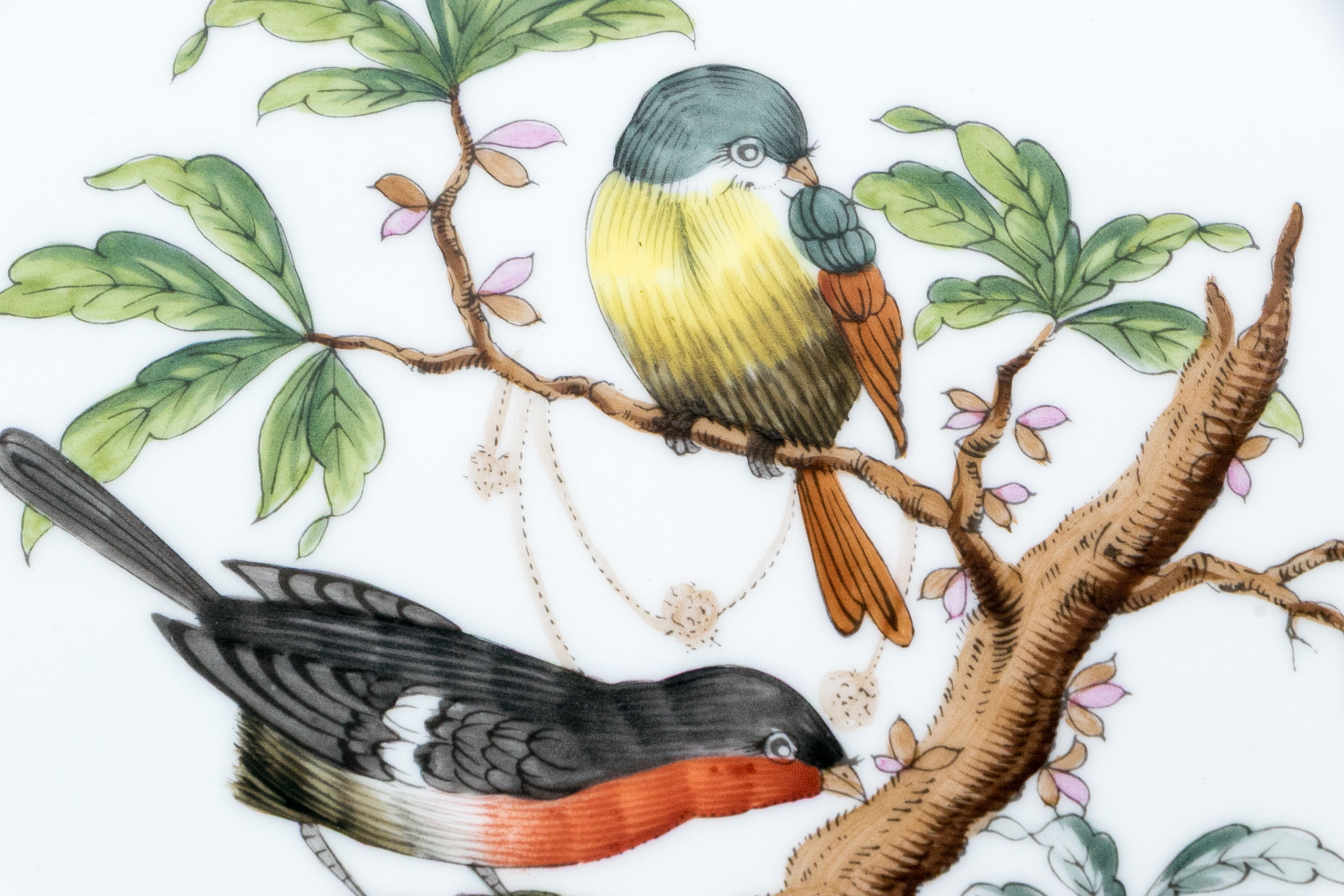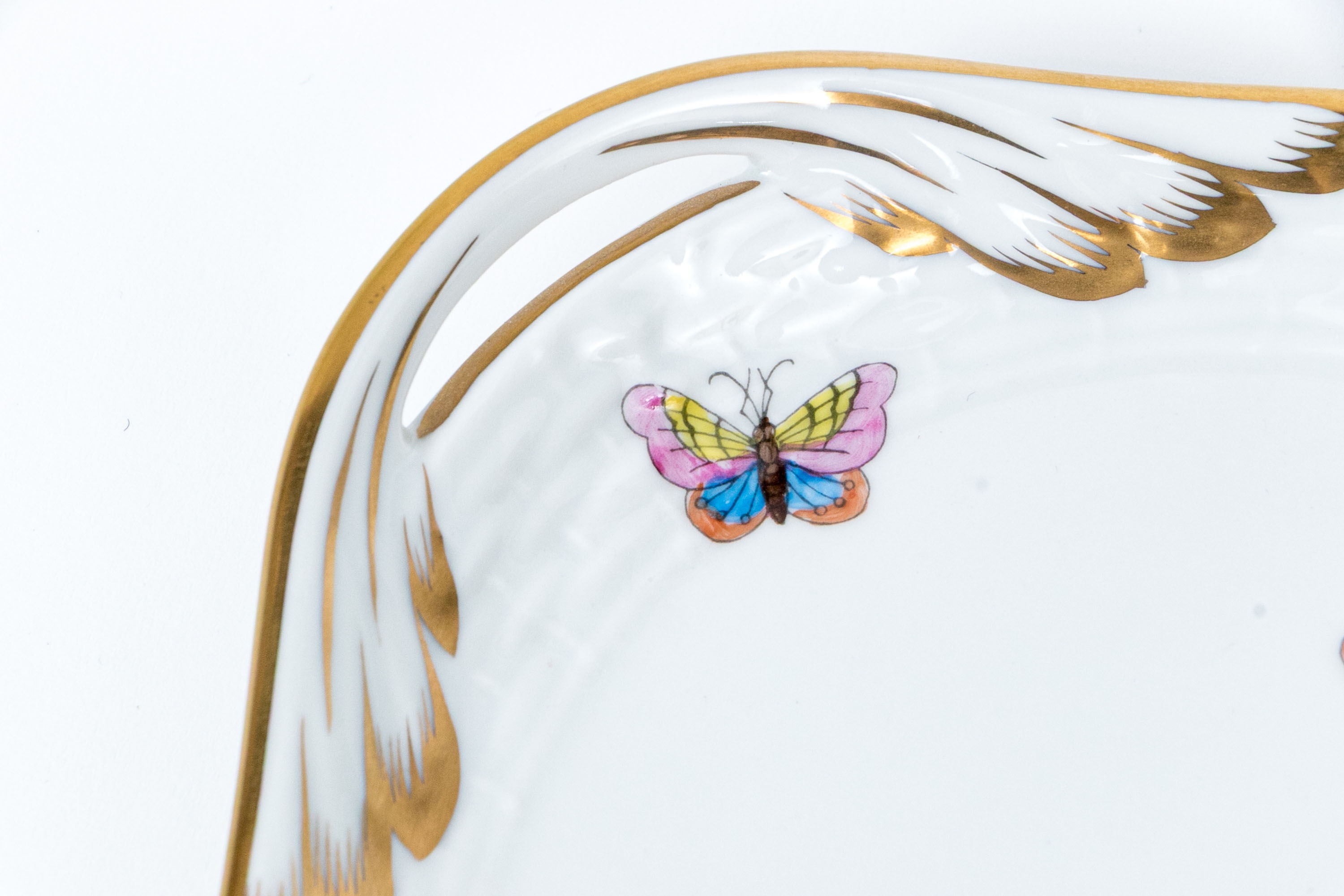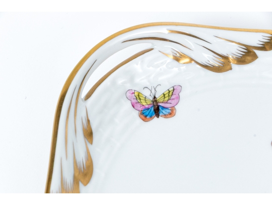 The tray’s gilded scalloped rim and handles are accented with raised relief details typical of Herend’s “Rothschild Bird” service. Each element is individually hand-painted in vibrant enamel colors with meticulous attention to naturalistic detail. The underside bears the Herend Hungary blue shield mark, HANDPAINTED, and the pattern and form number 436/RO.