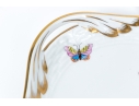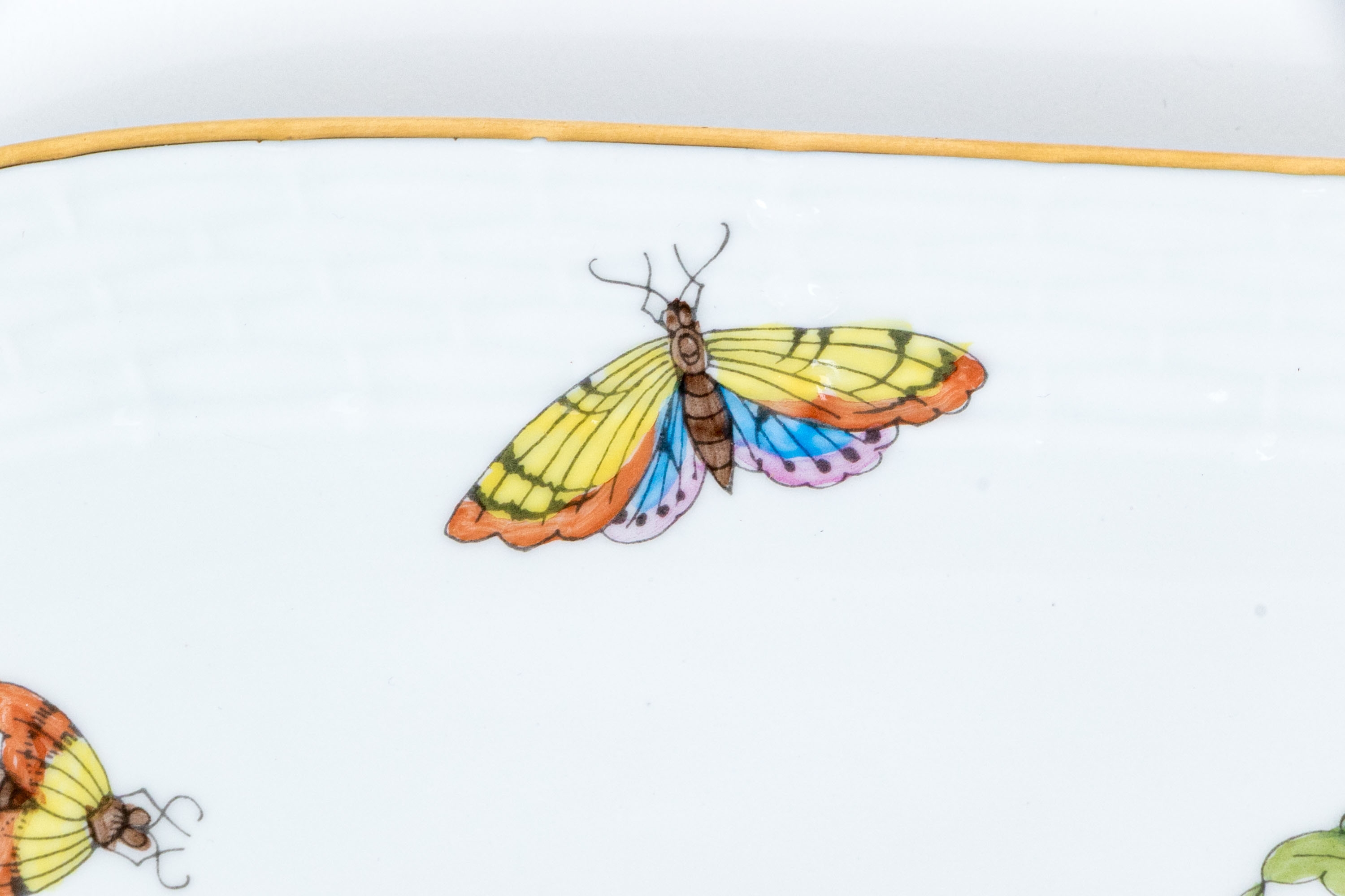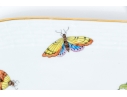 Herend Hungary hand-painted porcelain oval tray, decorated in the Rothschild Bird (RO) pattern. The design features a central motif of two songbirds perched on a leafy branch with necklace, surrounded by delicate multicolored butterflies and insects.
