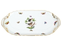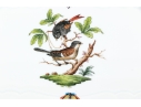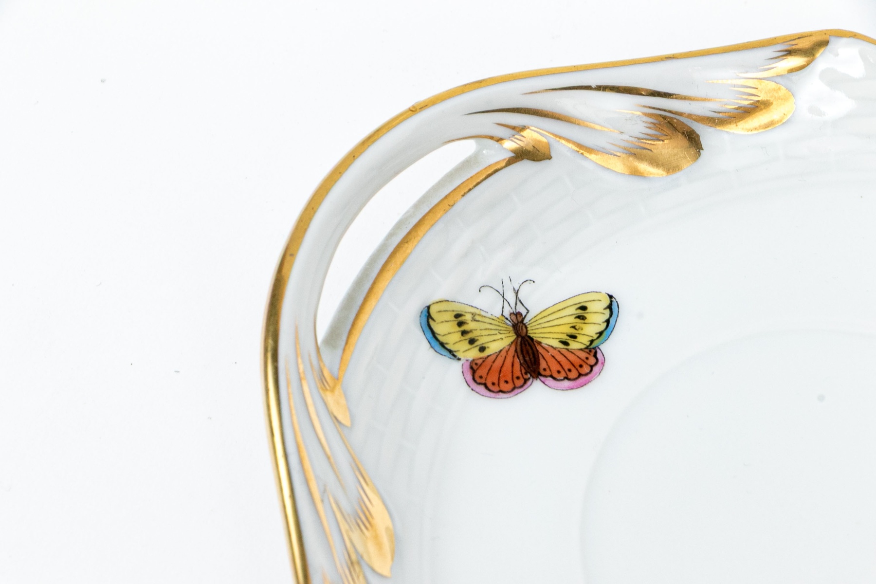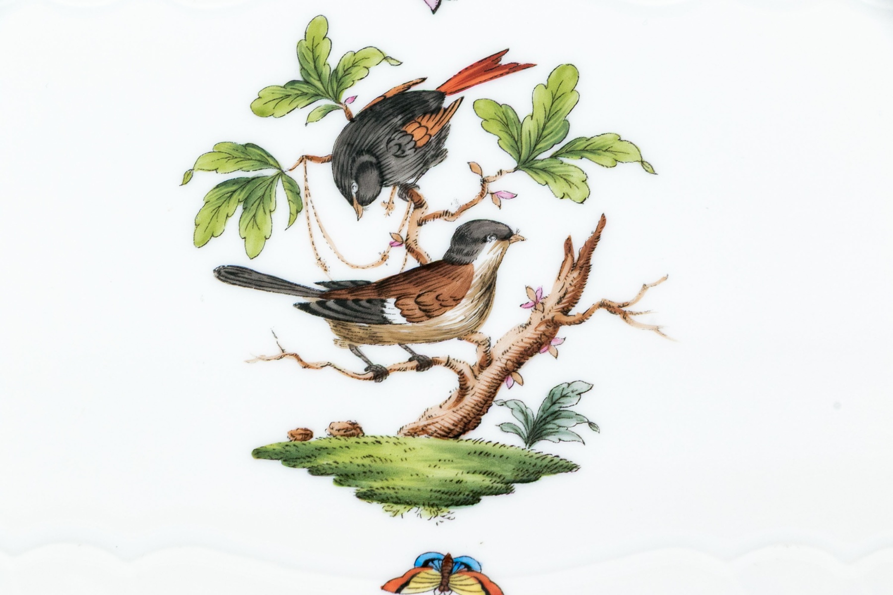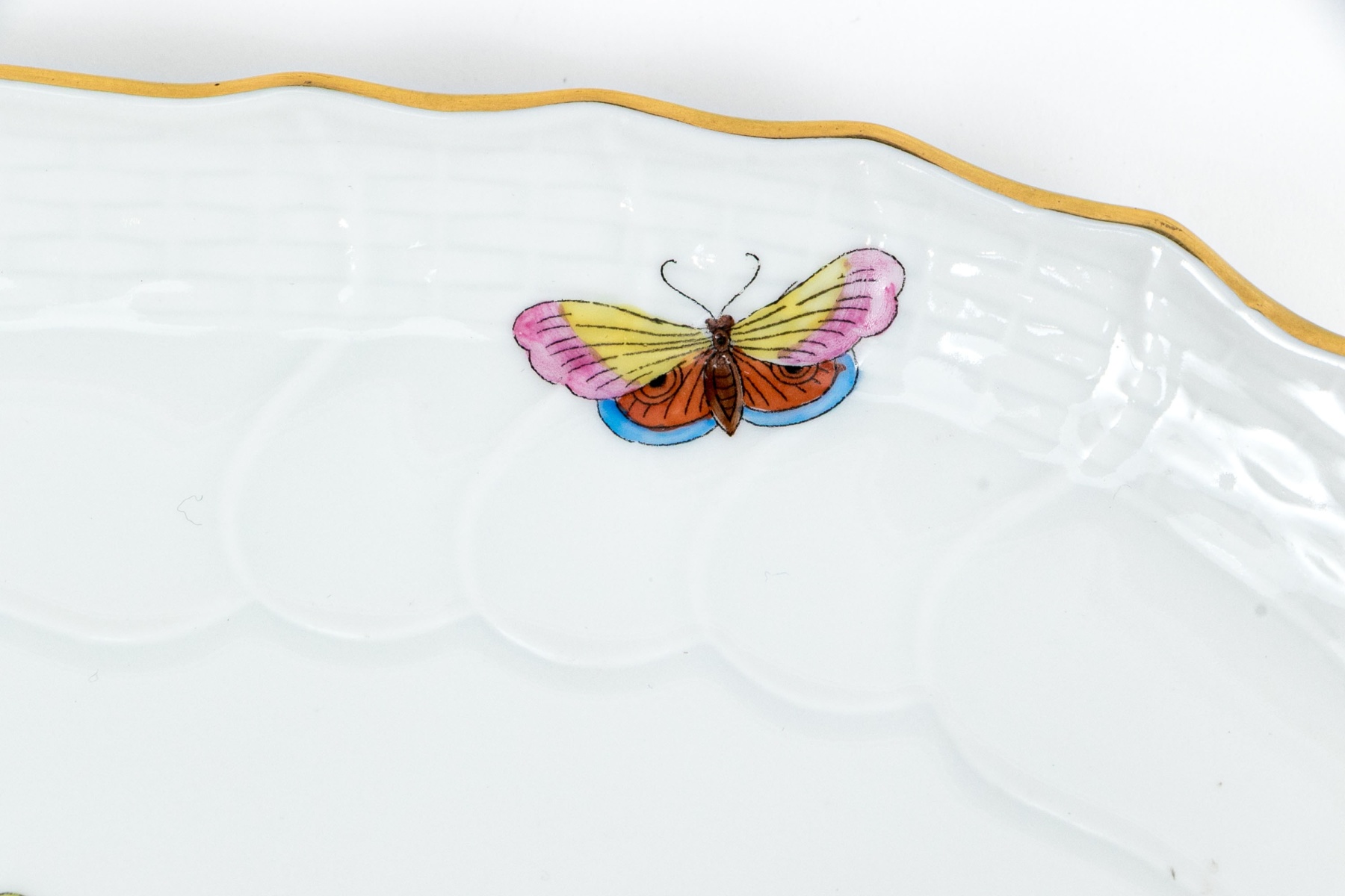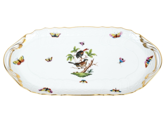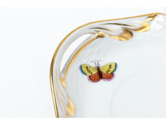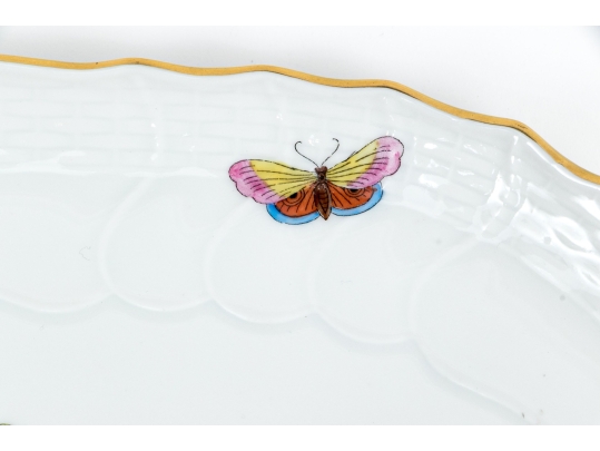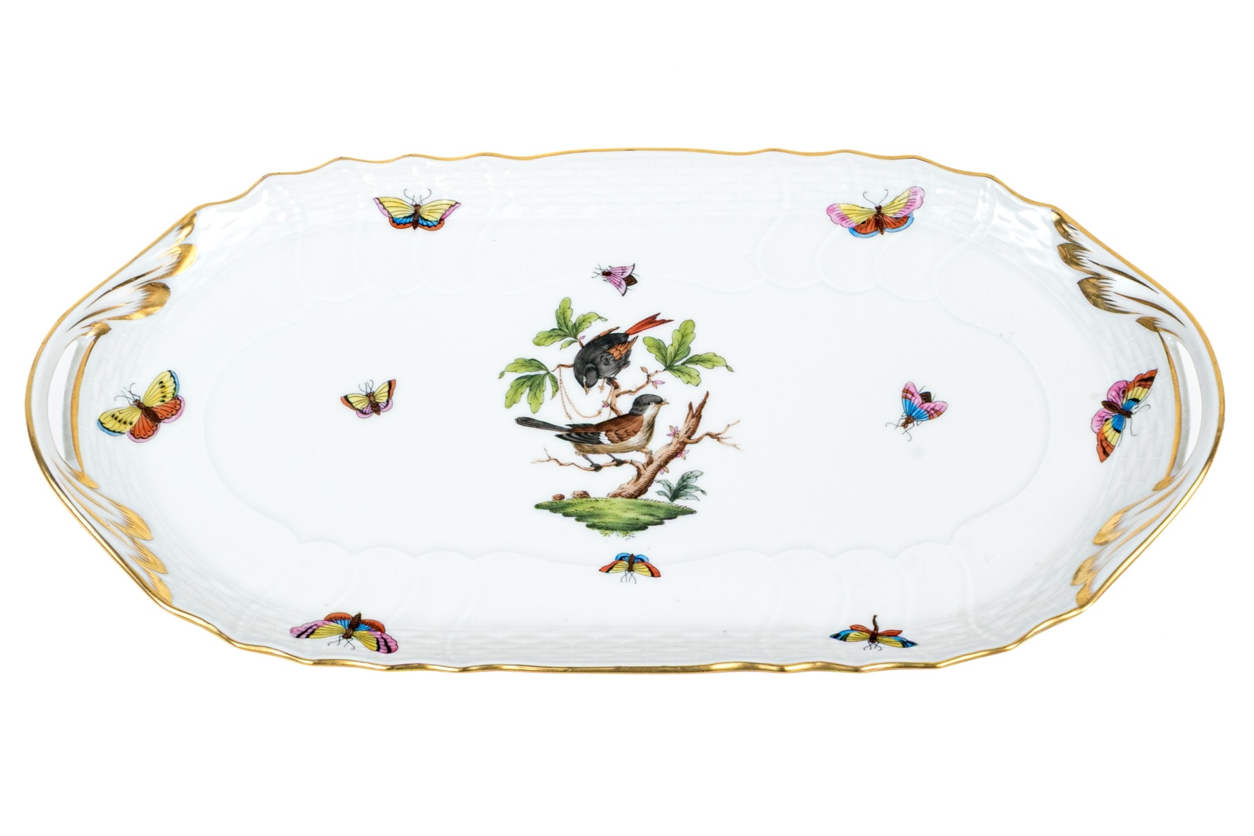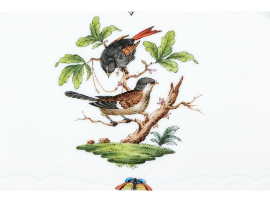 Herend Hungary hand-painted porcelain oval tray, decorated in the Rothschild Bird (RO) pattern. The design features a central motif of two songbirds perched on a leafy branch with necklace, surrounded by delicate multicolored butterflies and insects. The tray’s gilded scalloped rim and handles are accented with raised relief details typical of Herend’s “Rothschild Bird” service. Each element is individually hand-painted in vibrant enamel colors with meticulous attention to naturalistic detail. The underside bears the Herend Hungary blue shield mark, HANDPAINTED, and the pattern and form number 1436/RO