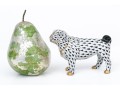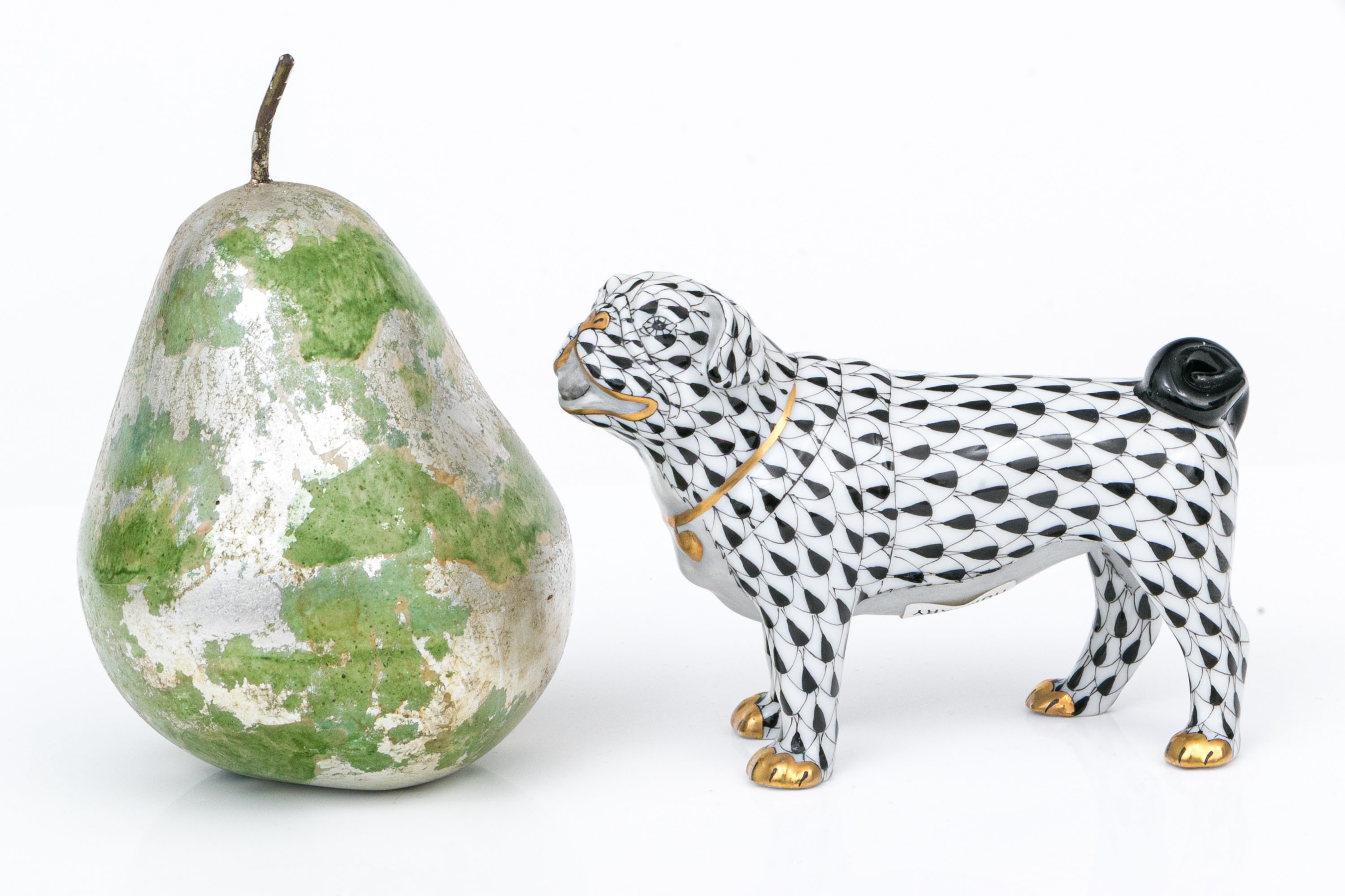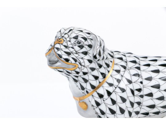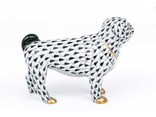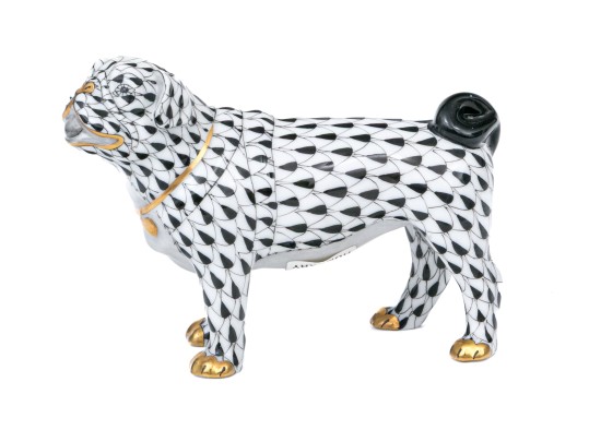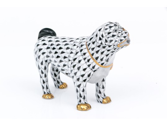 Herend Hungary porcelain pug figurine, hand-painted in the Black Fishnet pattern. The piece showcases the breed’s distinctive features — curled tail, expressive face, and proud stance.