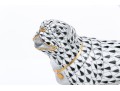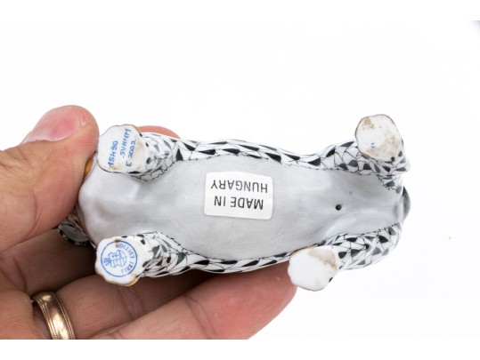 The black-and-white fishnet motif is meticulously painted by hand and beautifully contrasted with hand-applied 24K gold highlights on the paws, collar, pendant, and snout. The underside bears the Herend blue shield hallmark with crossed paintbrushes, the inscription HANDPAINTED FIRST EDITION, and the model number 15490/SVHN1M E.2002, along with a “MADE IN HUNGARY” label.