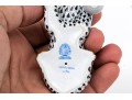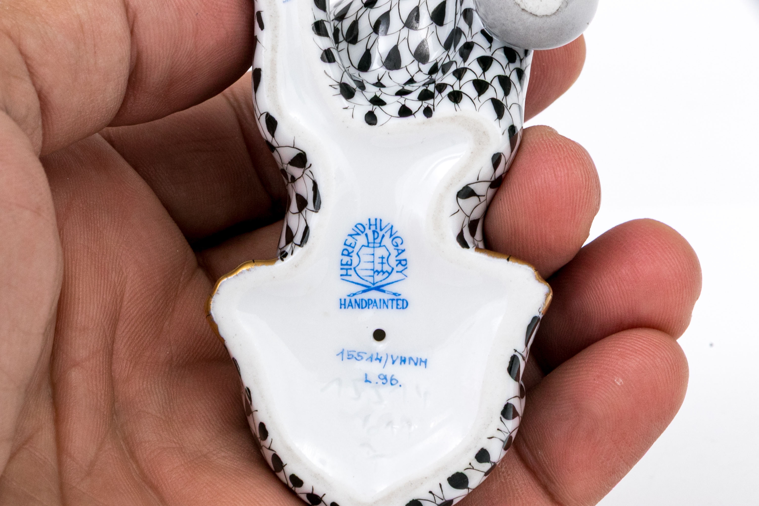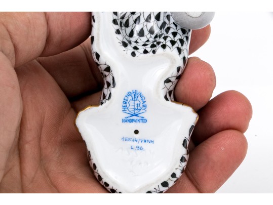 The intricate black fishnet design is hand-applied, creating texture and motion across the surface. 24K gold accents highlight the paws, nose, and inner ear edges. The underside bears the classic Herend blue shield hallmark with crossed paintbrushes, the inscription HANDPAINTED, and the model number 15514/VHNM L.96, denoting both the pattern and individual painter’s mark.