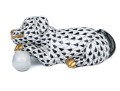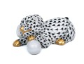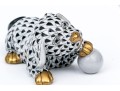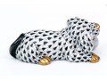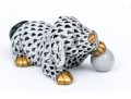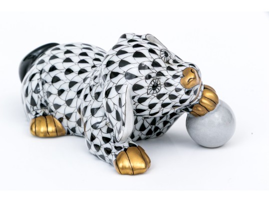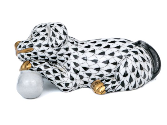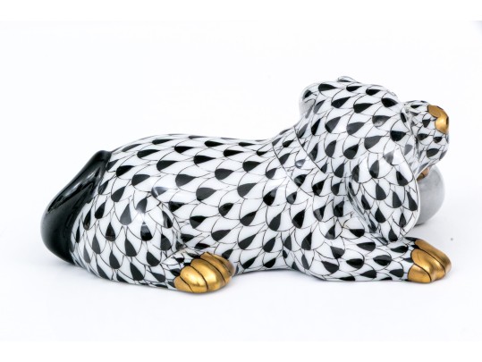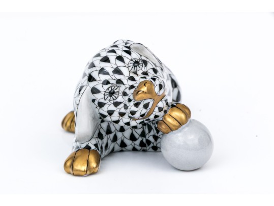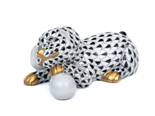 Herend Hungary porcelain puppy figure, hand-painted in the elegant Black Fishnet pattern. This playful puppy reclines with a gentle expression, one paw resting atop a smooth porcelain ball.