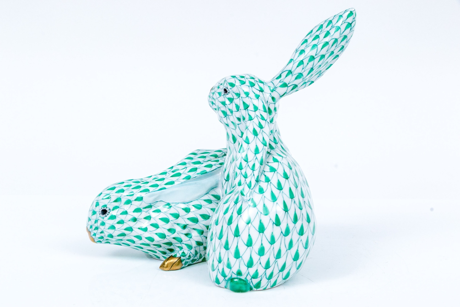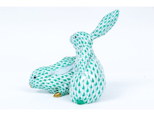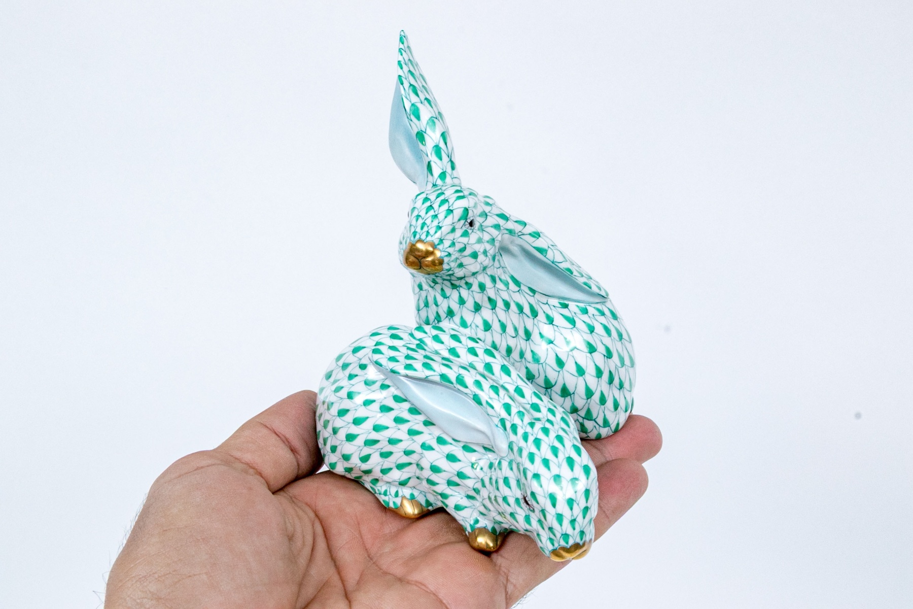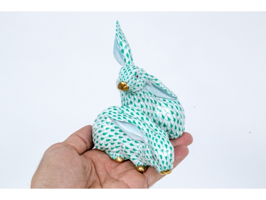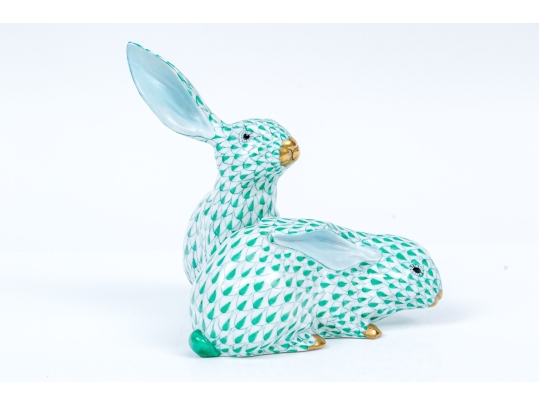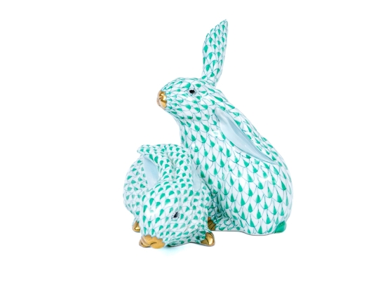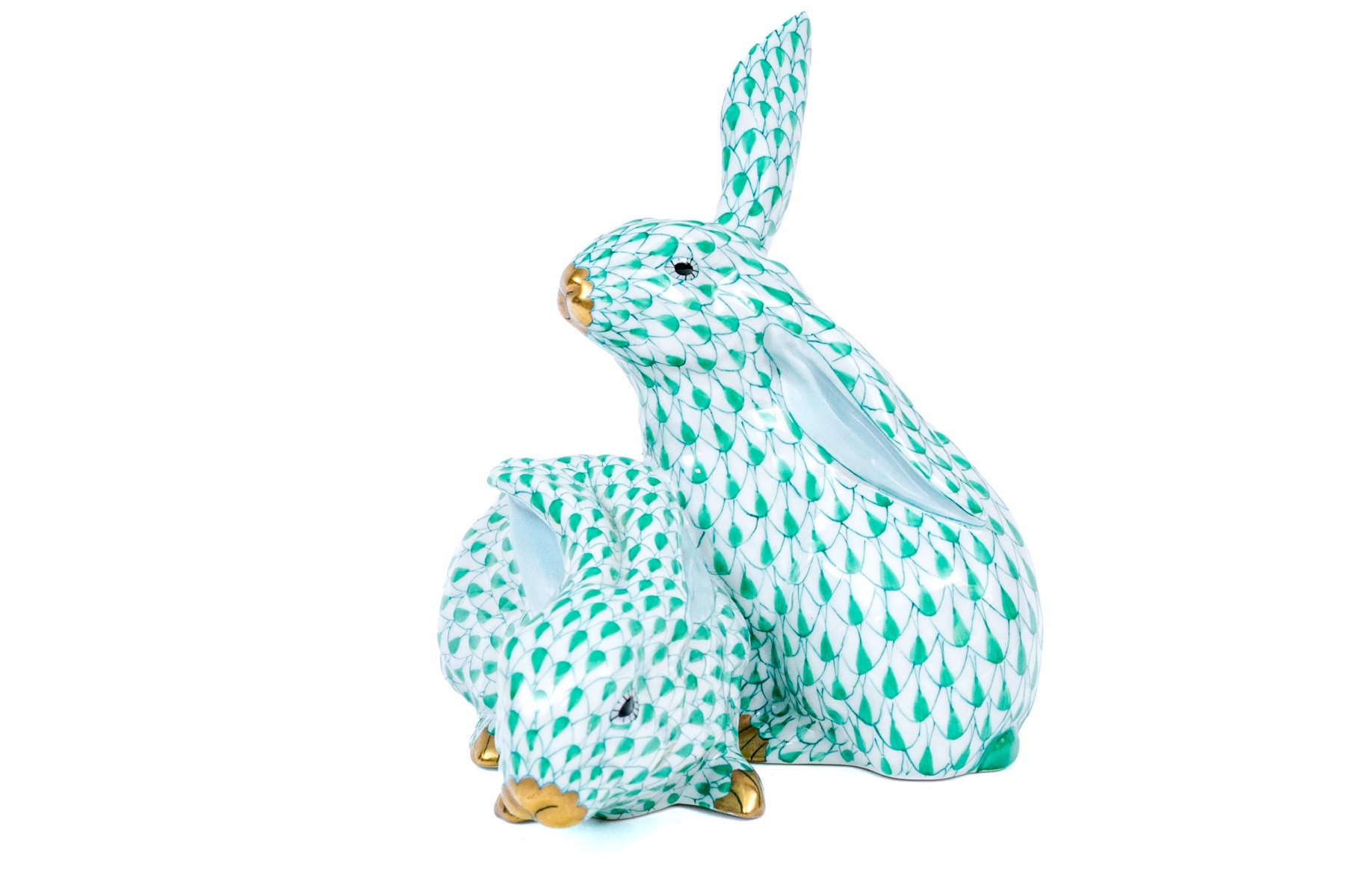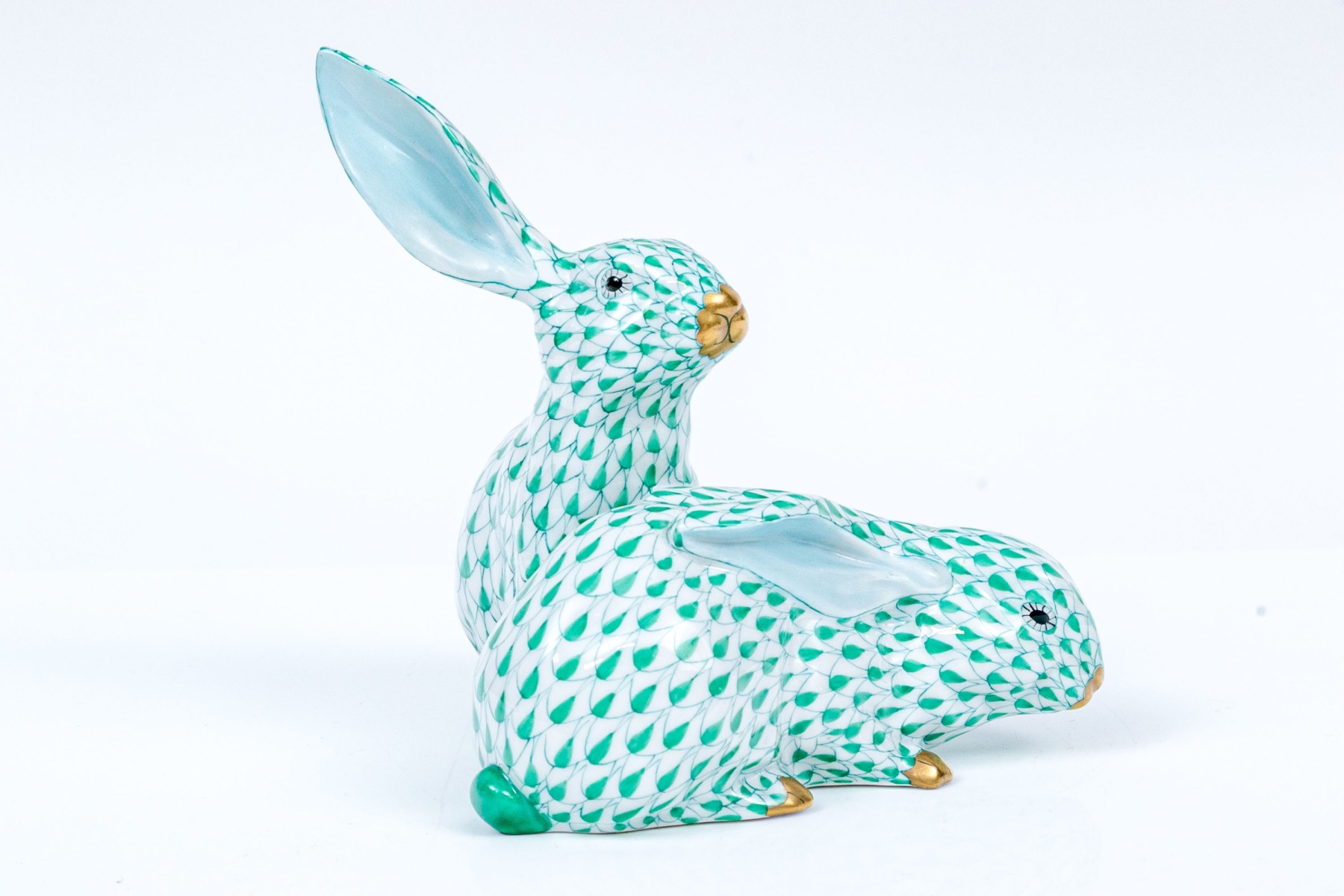 Herend Hungary Hand-Painted Porcelain Rabbit Figural Group, Green Fishnet Pattern