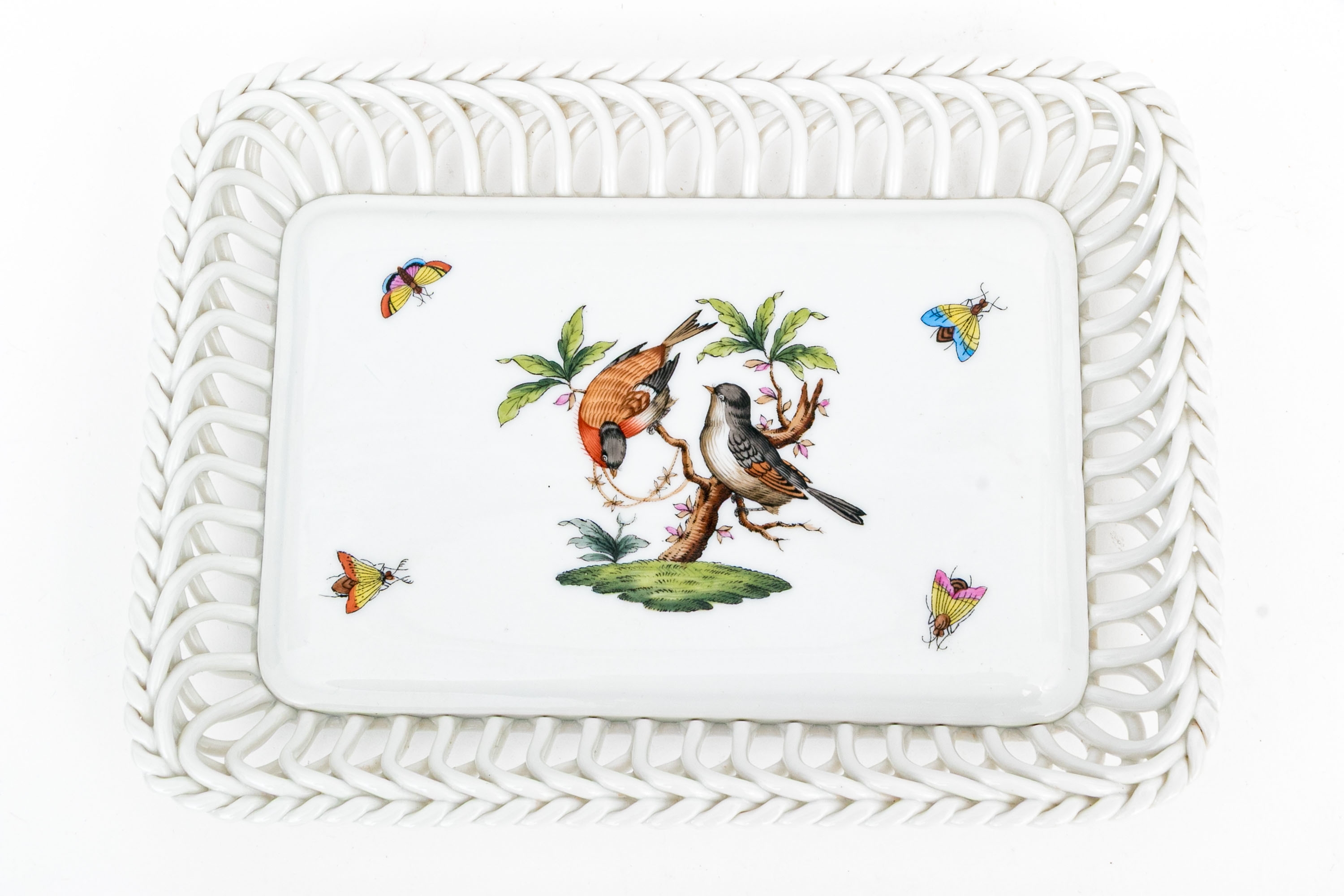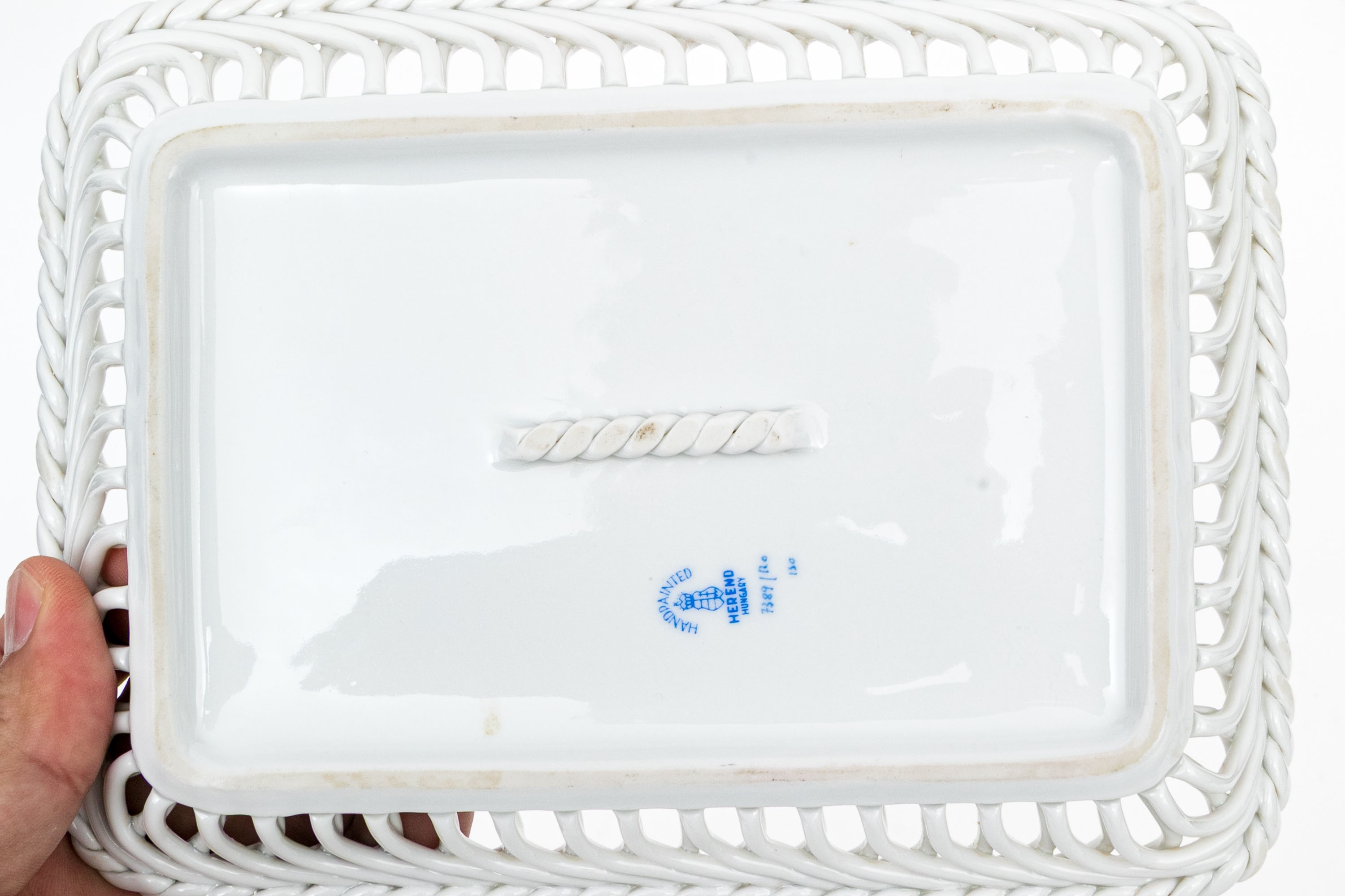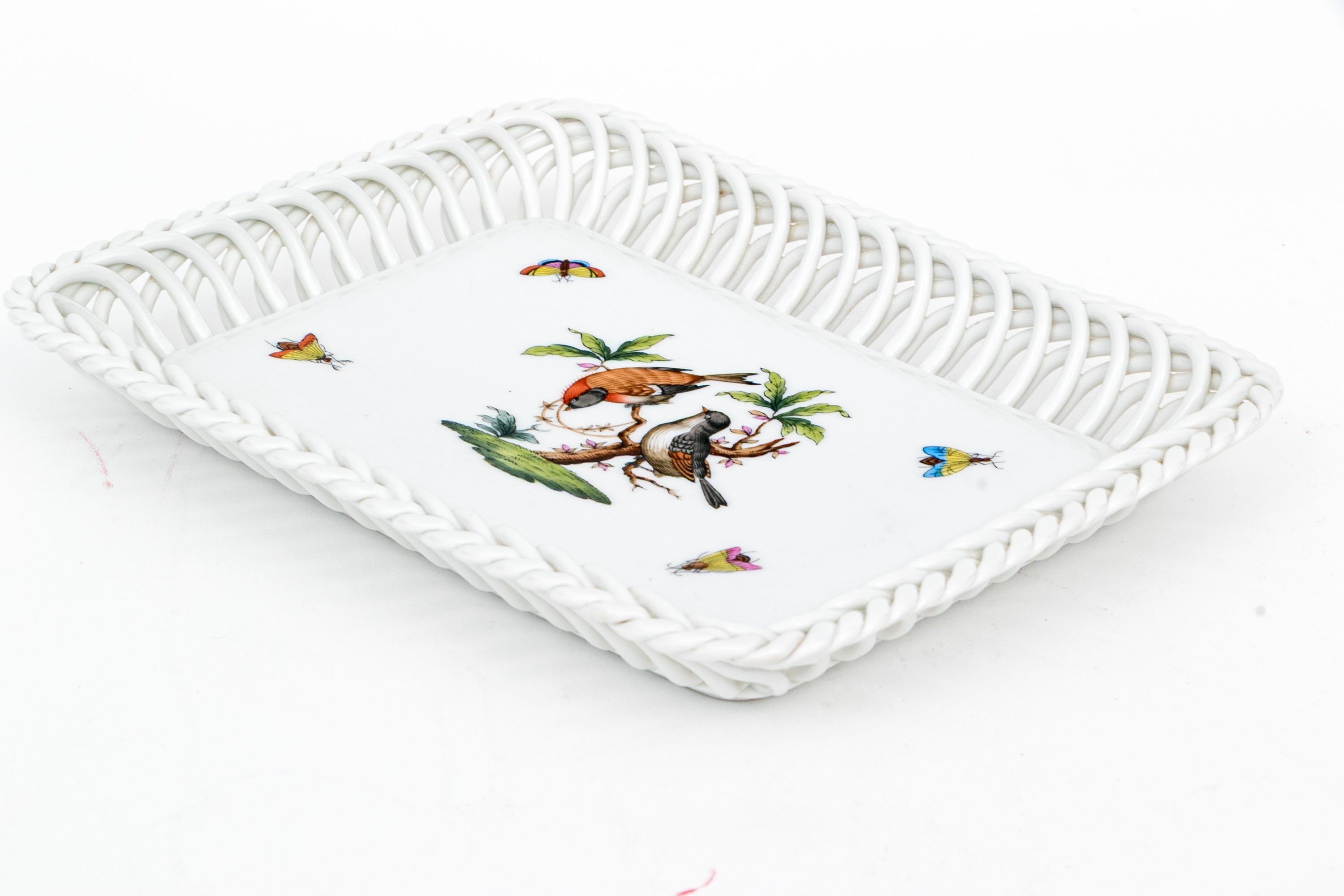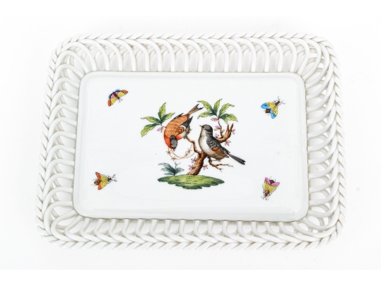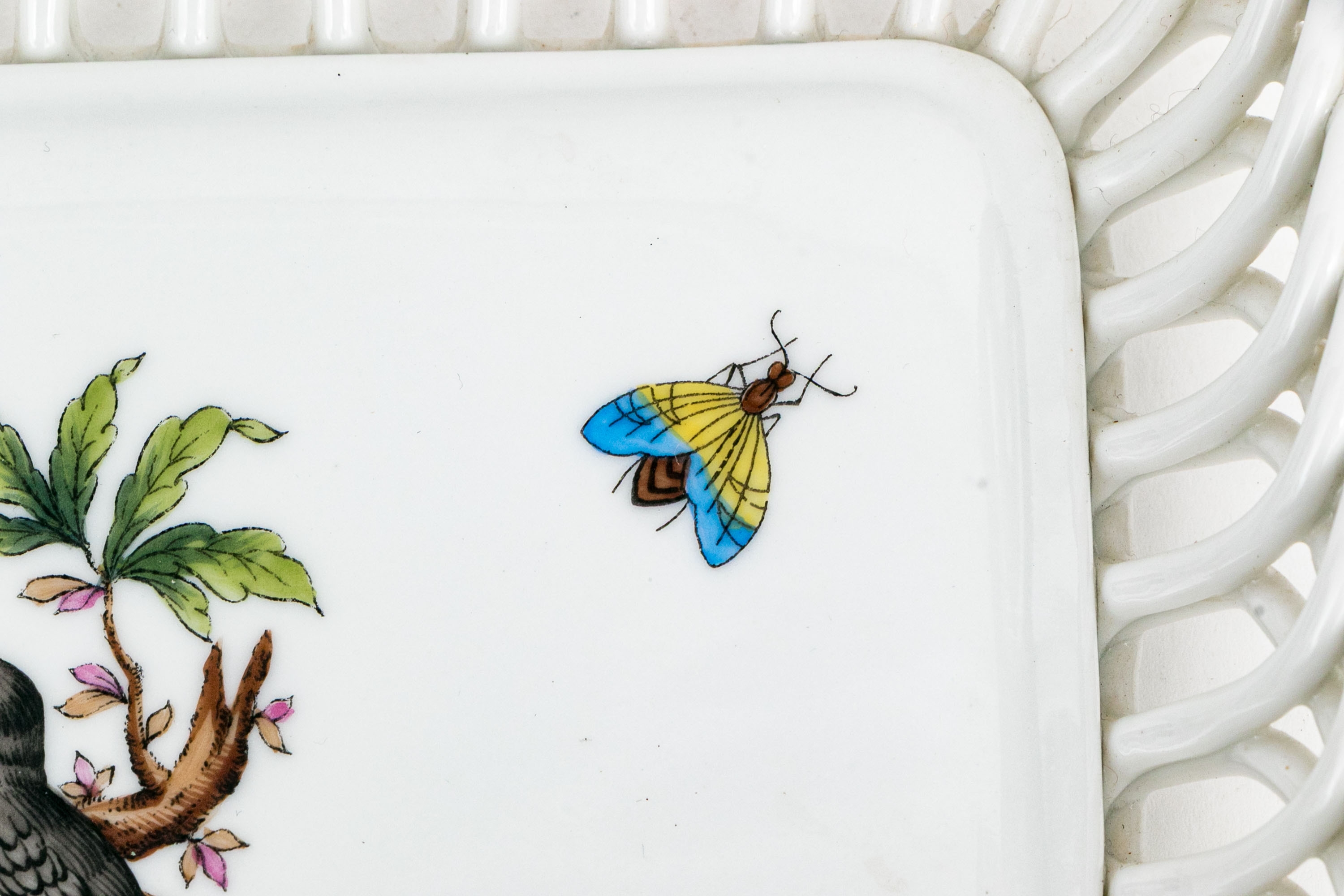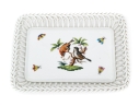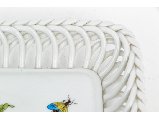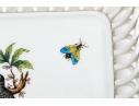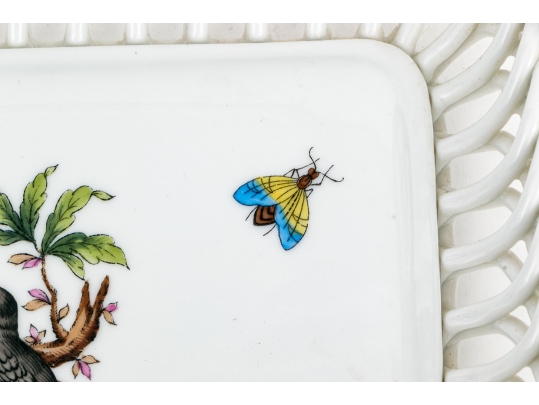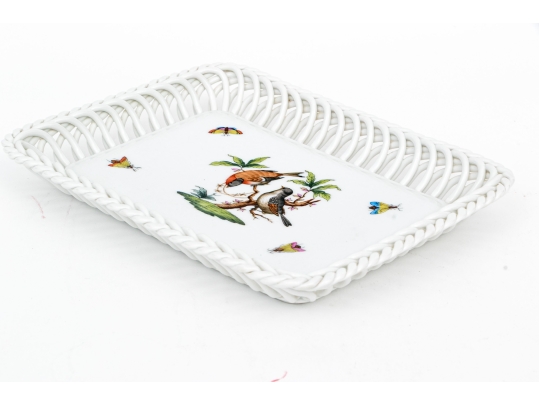 Herend Hungary’s hand-painted porcelain ectangular reticulated basket (model 7389/RO) features the Rothschild Bird (RO) pattern. The handwoven porcelain design showcases an intricately pierced and braided border, creating a delicate openwork effect that exemplifies Herend’s mastery of porcelain craft. At the center, two vividly painted songbirds perch on flowering branches with necklace, surrounded by colorful butterflies rendered in bright hues of yellow, magenta, blue, and orange. The design is executed on a glossy white porcelain ground, framed by a smooth, rectangular inner border that emphasizes the meticulous hand-painting. Underside bears the Herend Hungary blue shield hallmark with crossed paintbrushes and “HANDPAINTED” inscription, along with the model number 7389/RO.